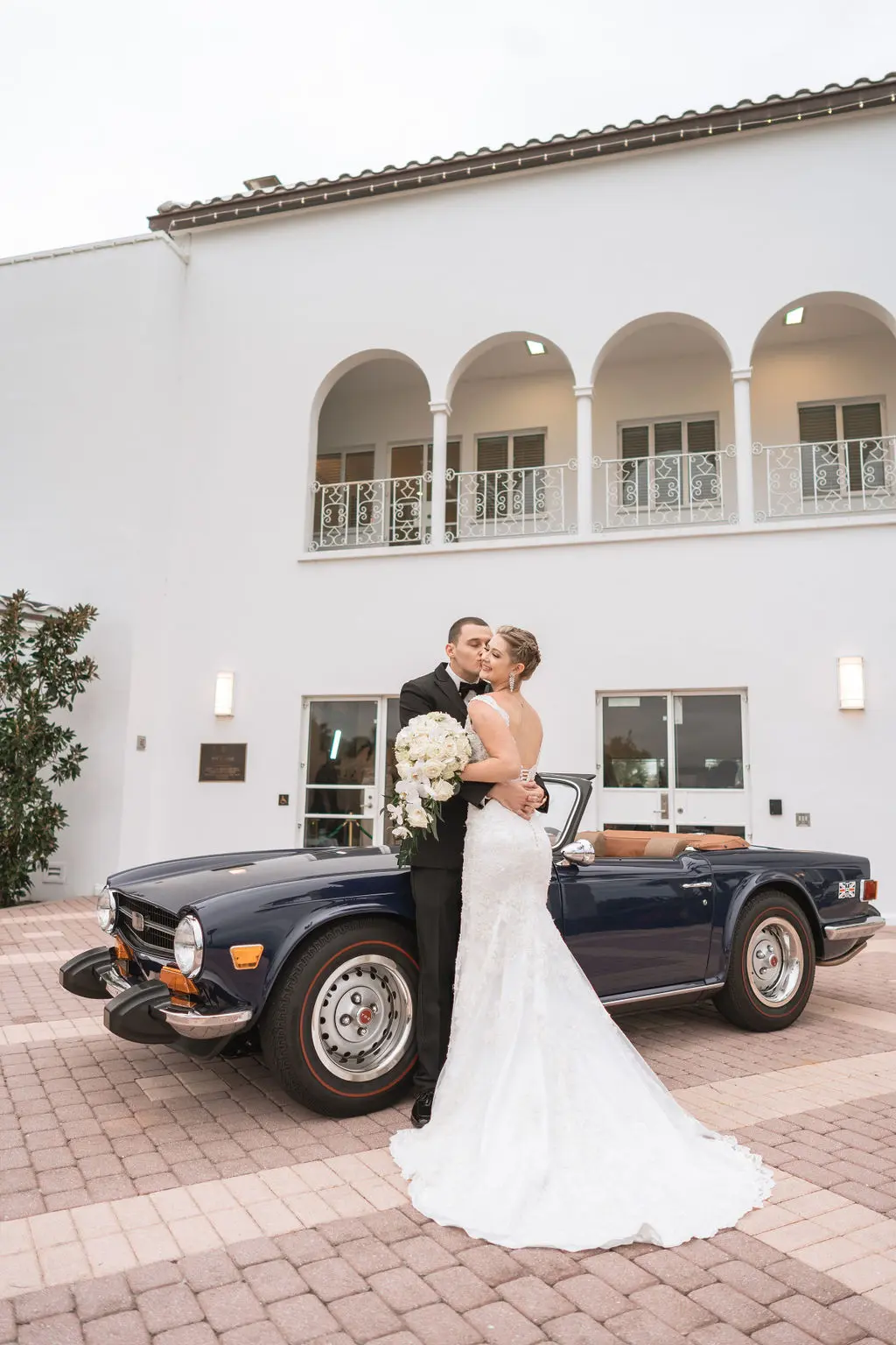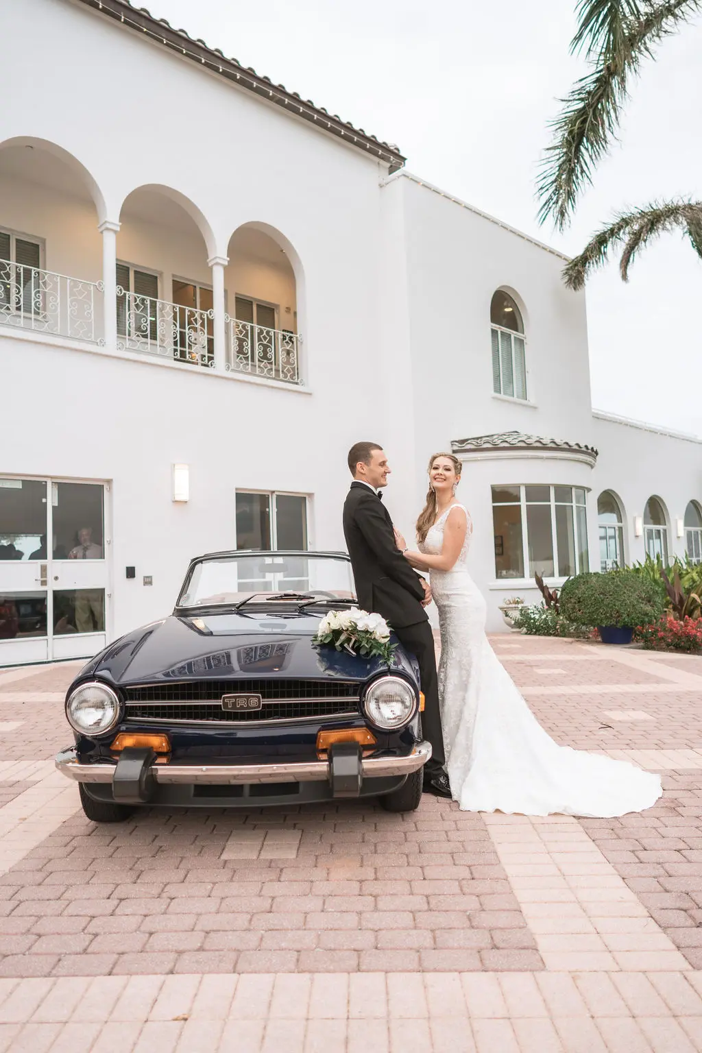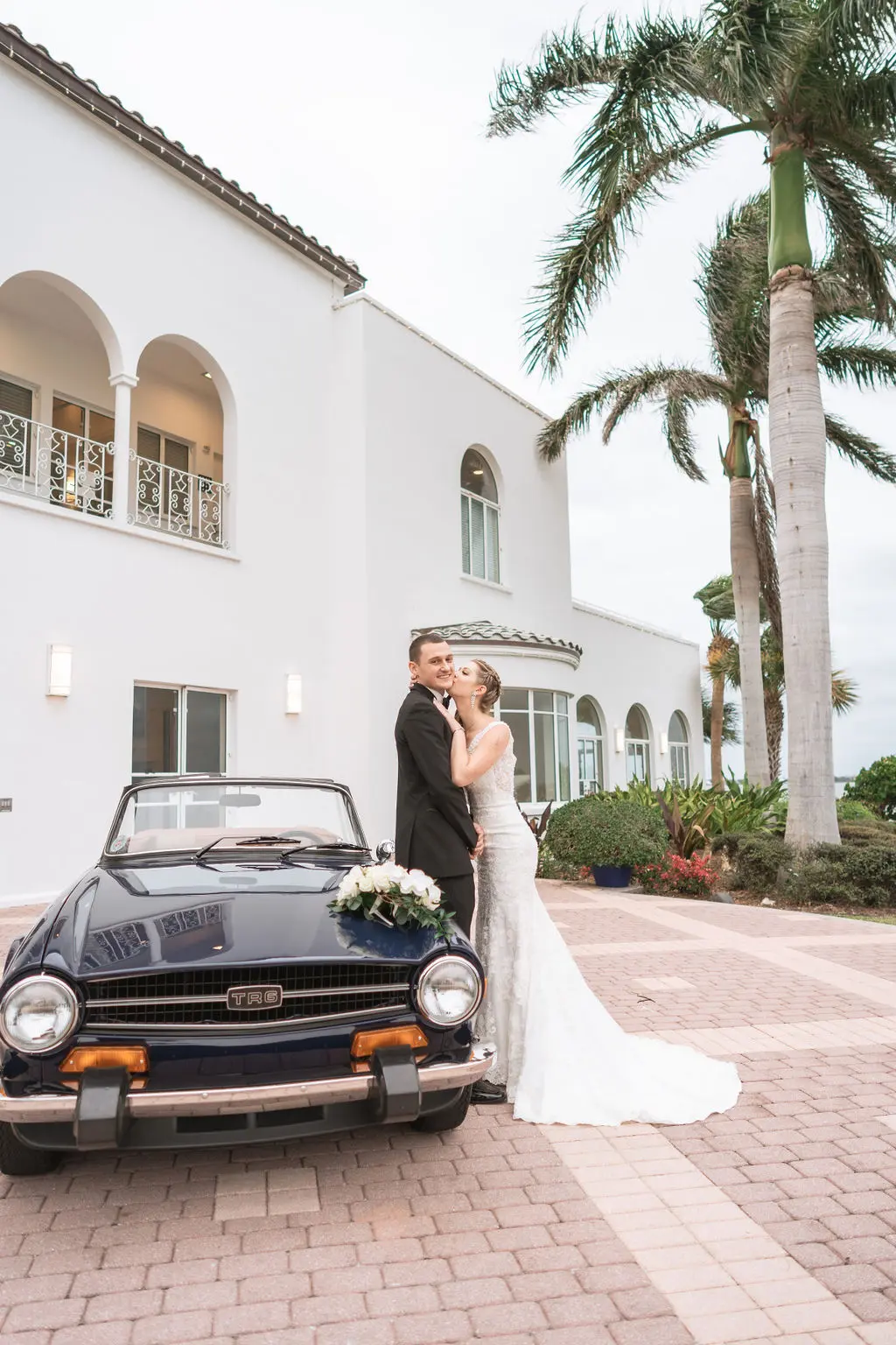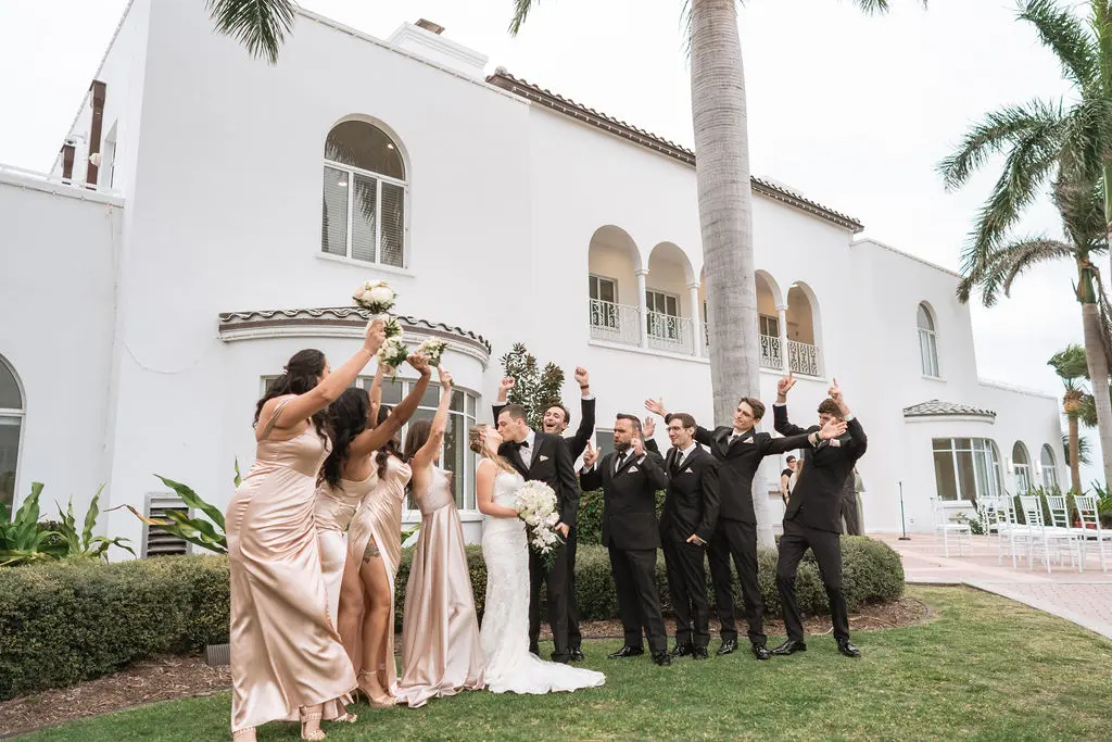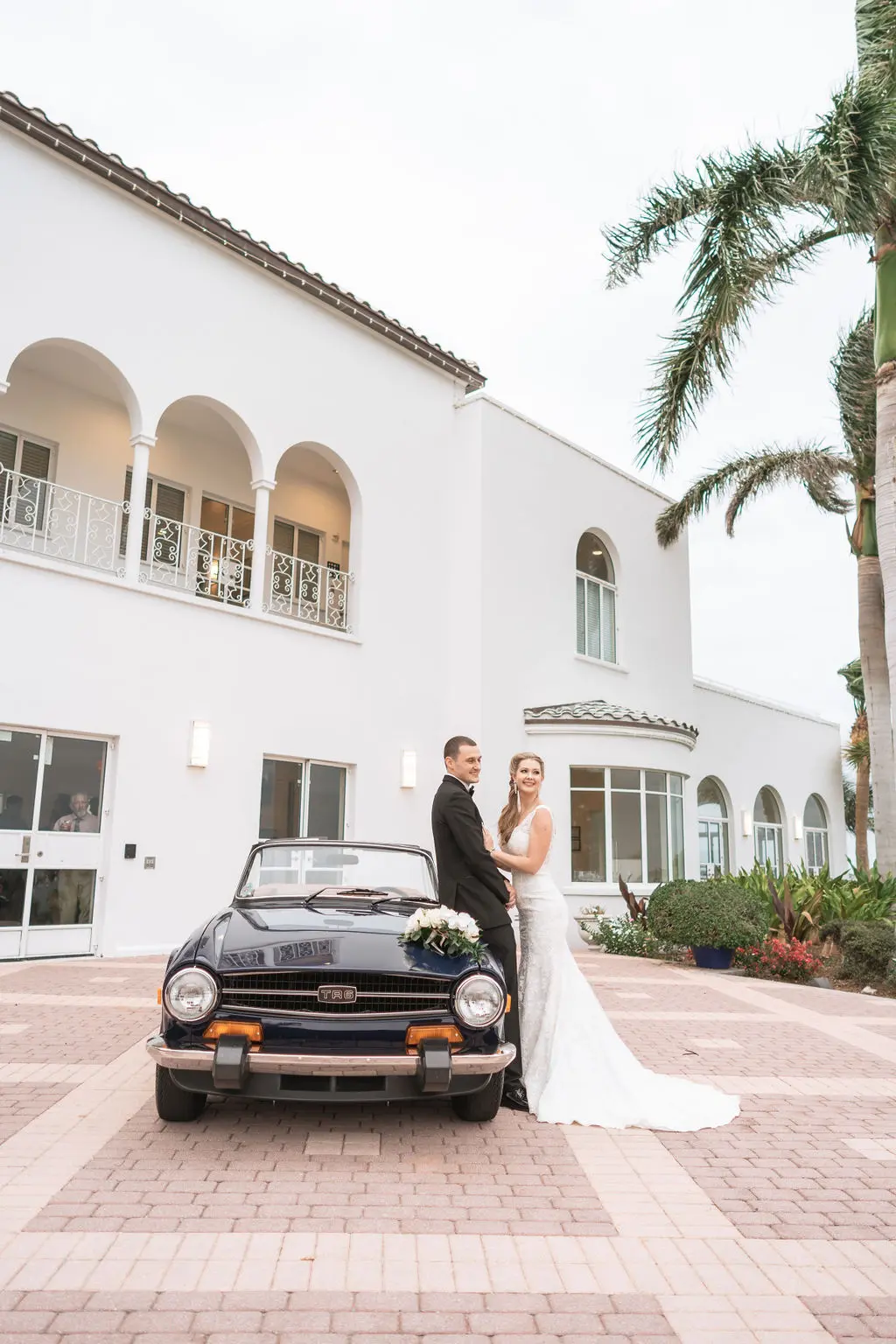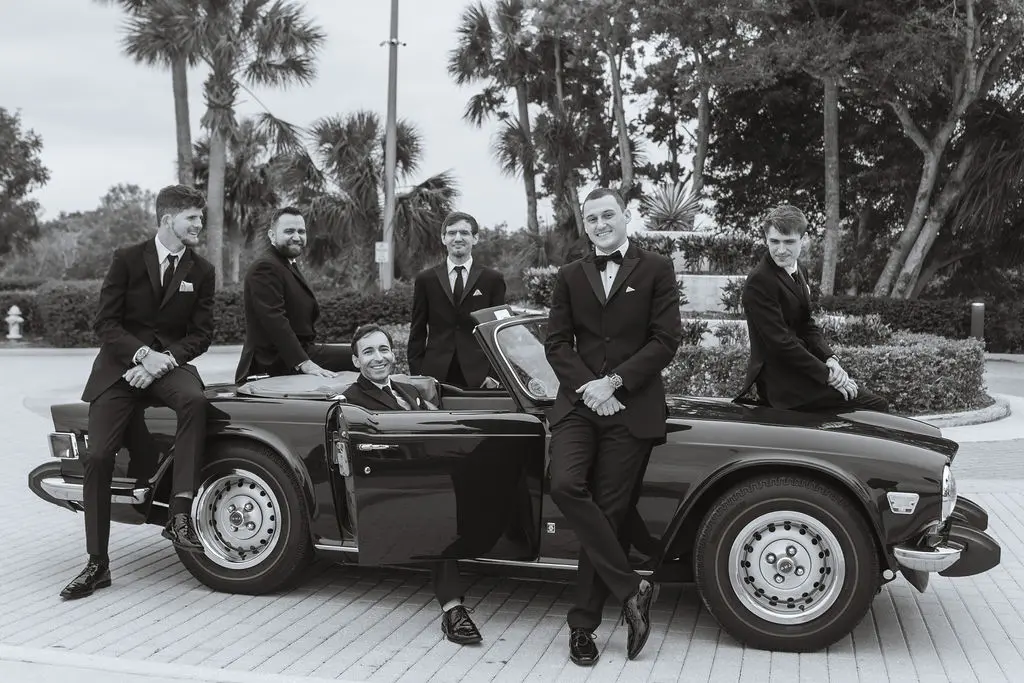 Amelia & Owen's wedding photography in Jupiter, Florida is effortless elegance from every angle. The stunning white Mediterranean-style estate with its arched colonnades and lush tropical palms created a backdrop that felt both grand and completely personal — and the vintage black convertible parked in the courtyard added a layer of character and nostalgic charm that made the portraits genuinely unforgettable. The kiss in front of that classic car, the white facade rising behind them, the warm August Florida light softened by a gentle overcast sky — it's an image that belongs on a gallery wall. Amelia's graceful gown and Owen's sharp suit reflected an impeccable aesthetic, while the warm, relaxed atmosphere of the celebration allowed the genuine joy between the couple and their closest people to come through in every single frame. Captured by Palms Isles Jupiter Florida wedding photography, this gallery is timeless, warm, and deeply beautiful.