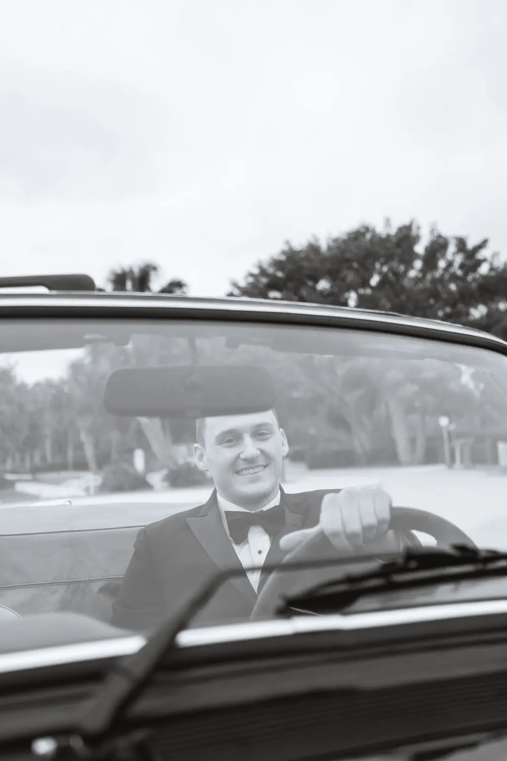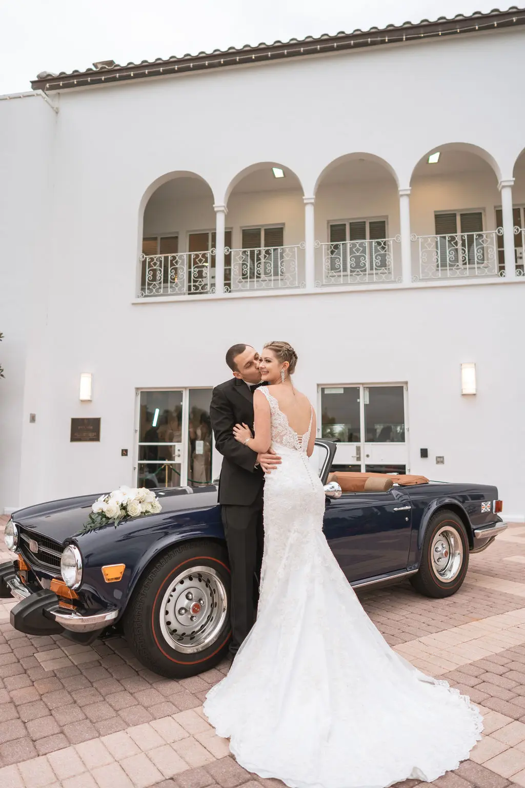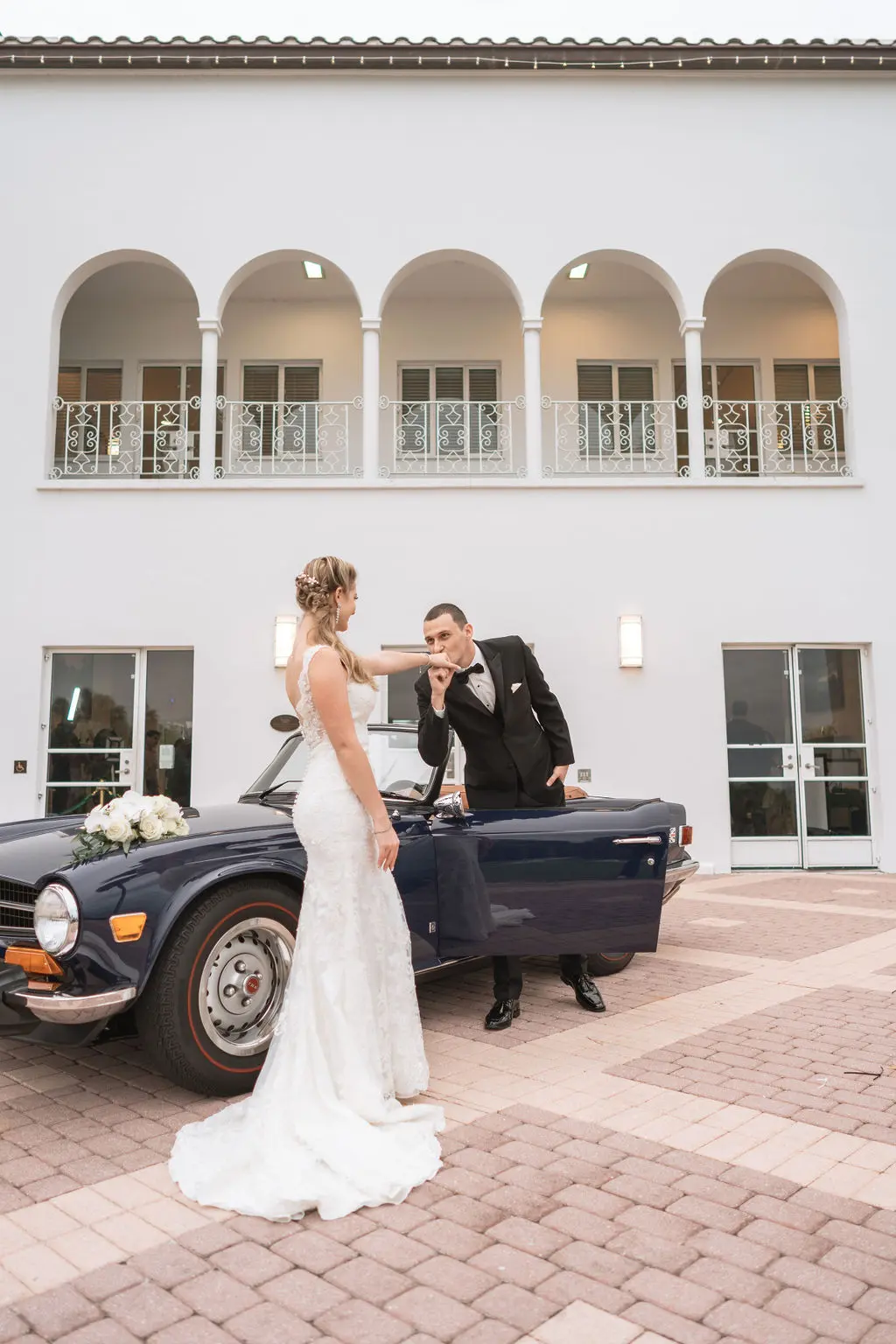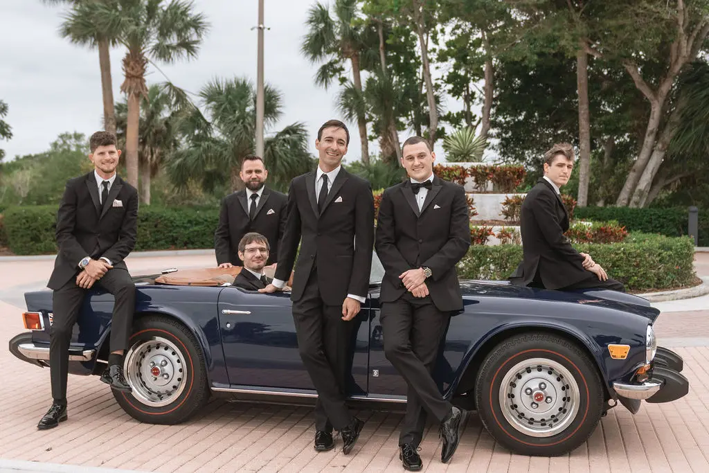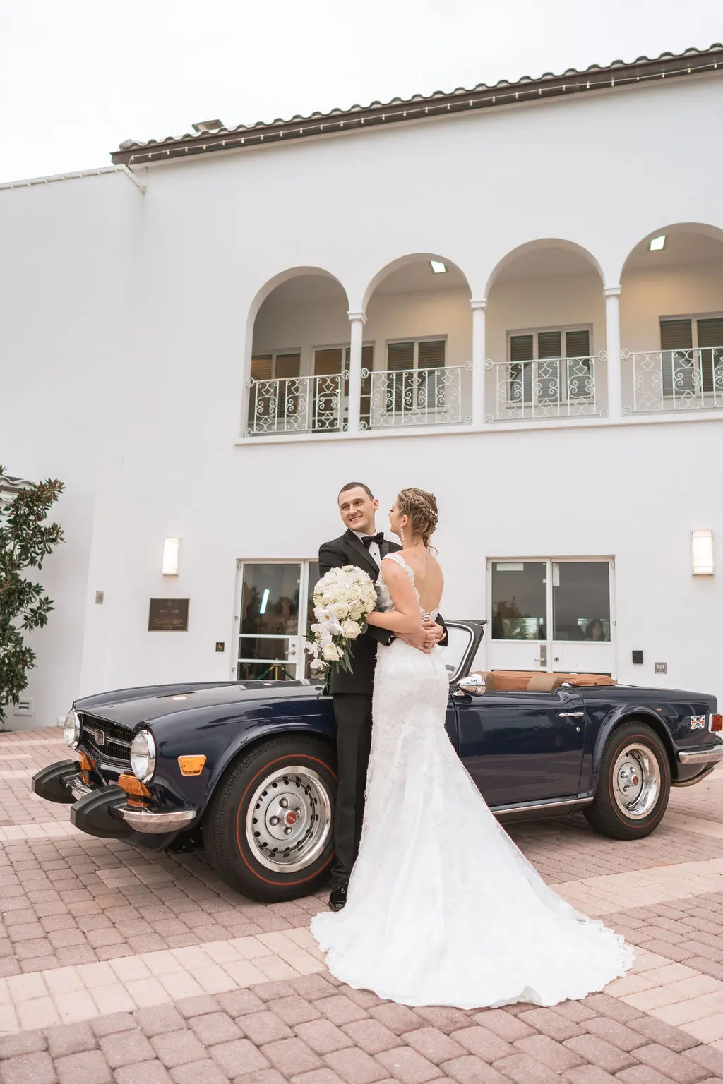Amelia & Owen's wedding photography in Jupiter, Florida is effortless elegance from every angle. The stunning white Mediterranean-style estate with its arched colonnades and lush tropical palms created a backdrop that felt both grand and completely personal — and the vintage black convertible parked in the courtyard added a layer of character and nostalgic charm that made the portraits genuinely unforgettable. The kiss in front of that classic car, the white facade rising behind them, the warm August Florida light softened by a gentle overcast sky — it's an image that belongs on a gallery wall. Amelia's graceful gown and Owen's sharp suit reflected an impeccable aesthetic, while the warm, relaxed atmosphere of the celebration allowed the genuine joy between the couple and their closest people to come through in every single frame. Captured by Palms Isles Jupiter Florida wedding photography, this gallery is timeless, warm, and deeply beautiful.