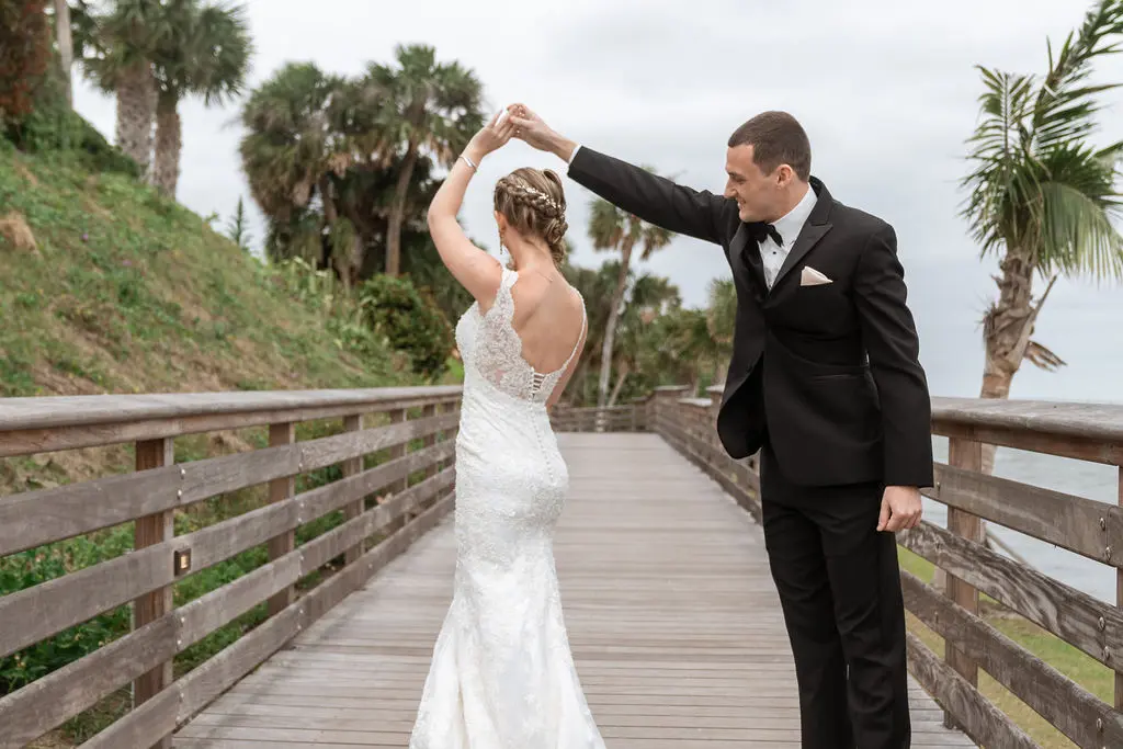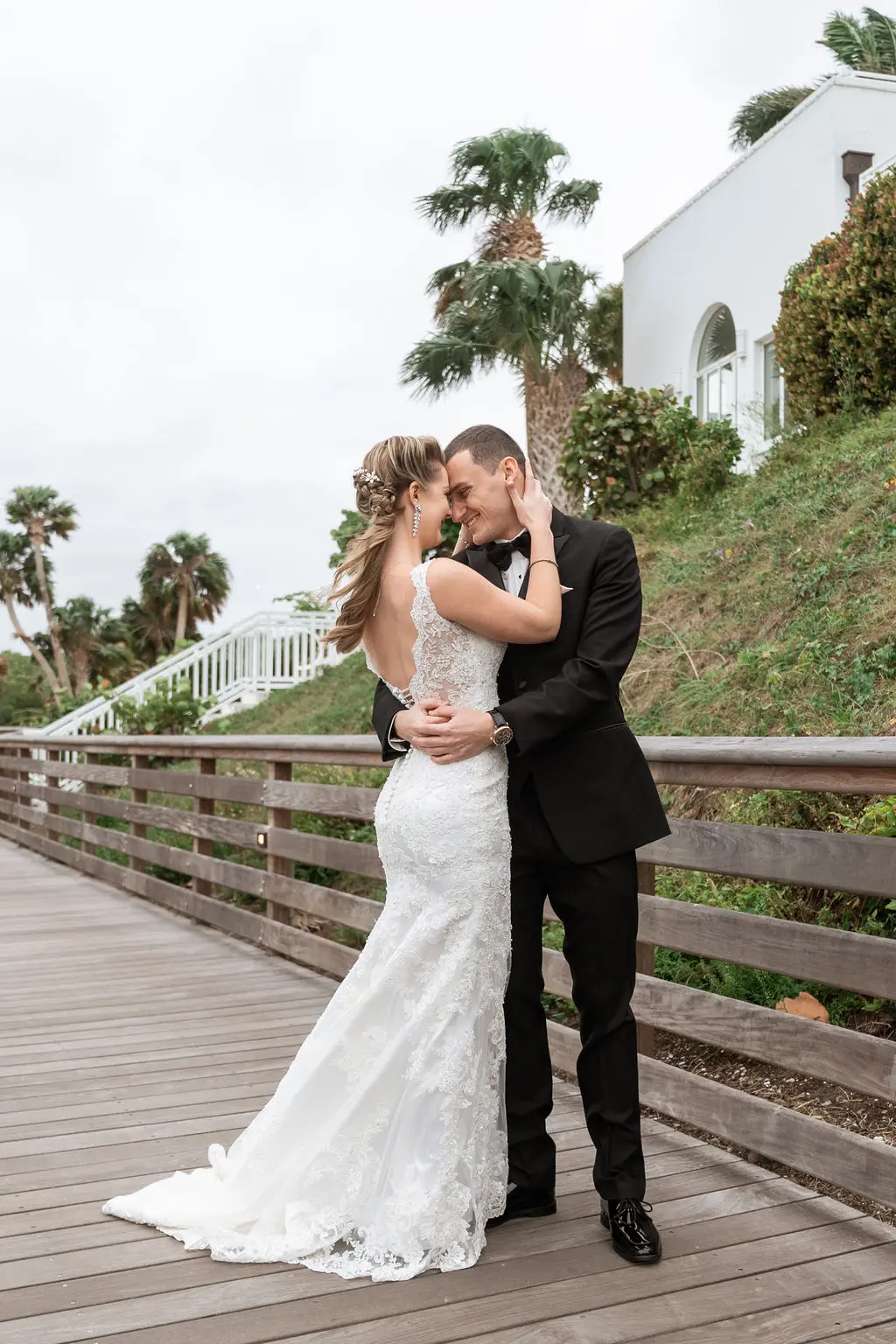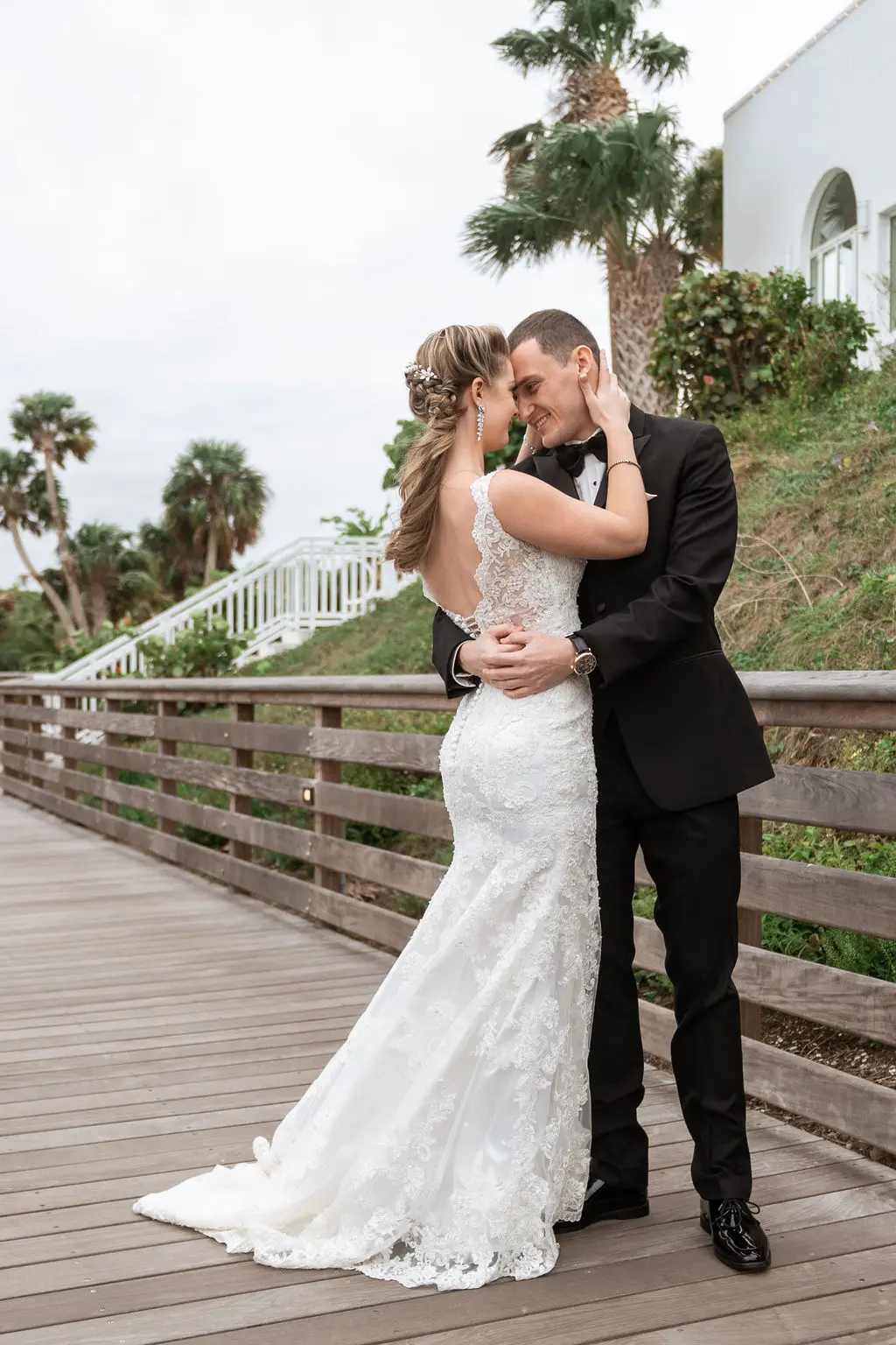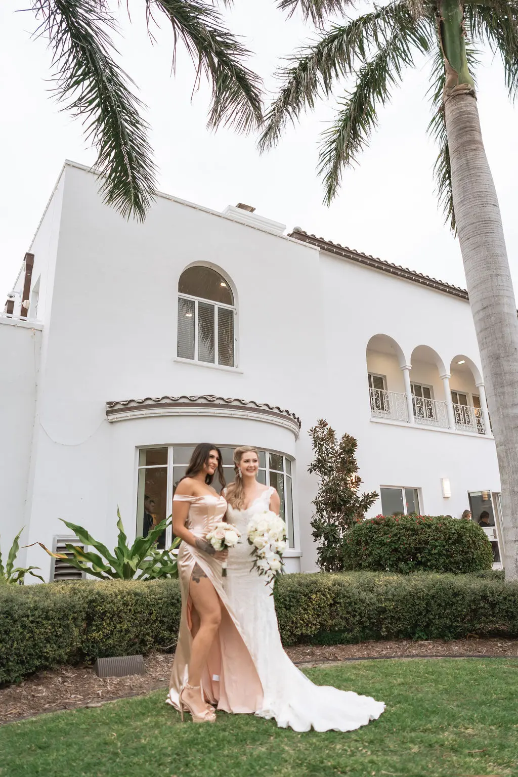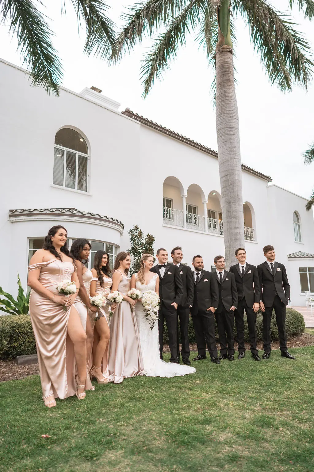 Amelia & Owen's wedding photography in Jupiter, Florida is effortless elegance from every angle. The stunning white Mediterranean-style estate with its arched colonnades and lush tropical palms created a backdrop that felt both grand and completely personal — and the vintage black convertible parked in the courtyard added a layer of character and nostalgic charm that made the portraits genuinely unforgettable. The kiss in front of that classic car, the white facade rising behind them, the warm August Florida light softened by a gentle overcast sky — it's an image that belongs on a gallery wall. Amelia's graceful gown and Owen's sharp suit reflected an impeccable aesthetic, while the warm, relaxed atmosphere of the celebration allowed the genuine joy between the couple and their closest people to come through in every single frame. Captured by Palms Isles Jupiter Florida wedding photography, this gallery is timeless, warm, and deeply beautiful.