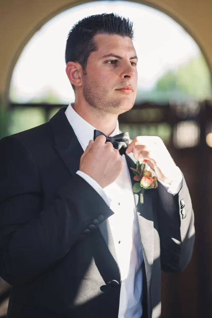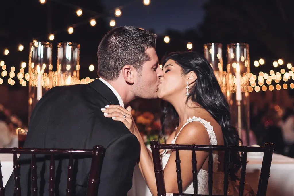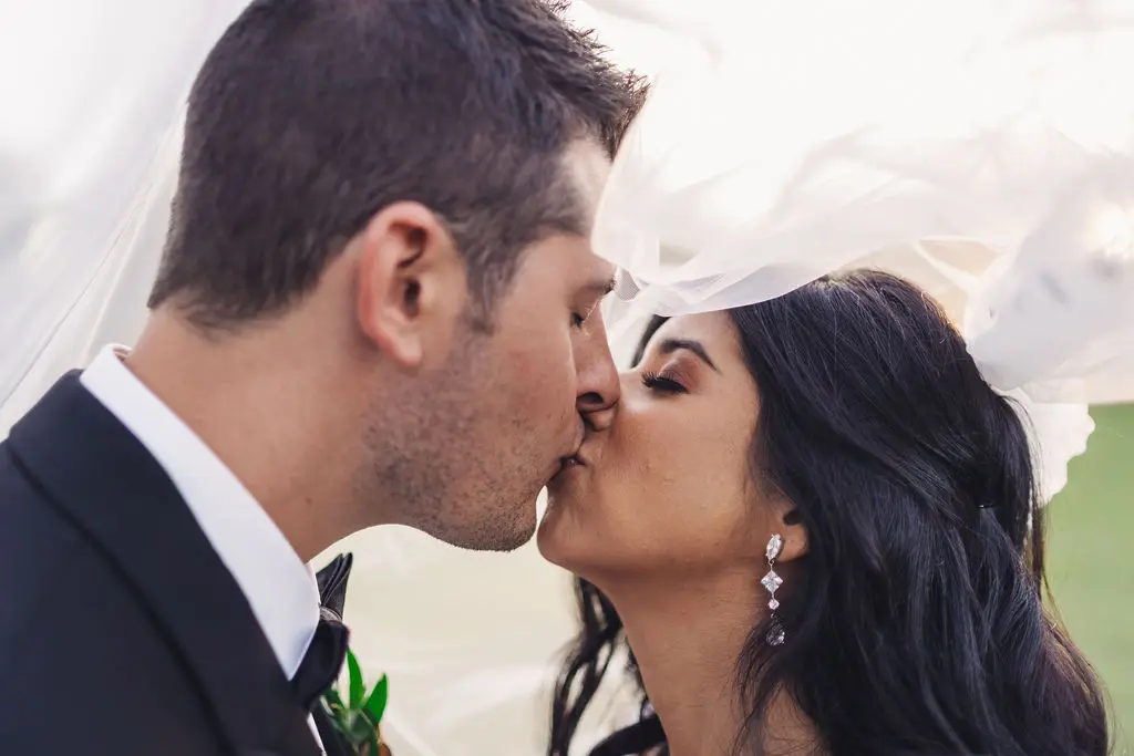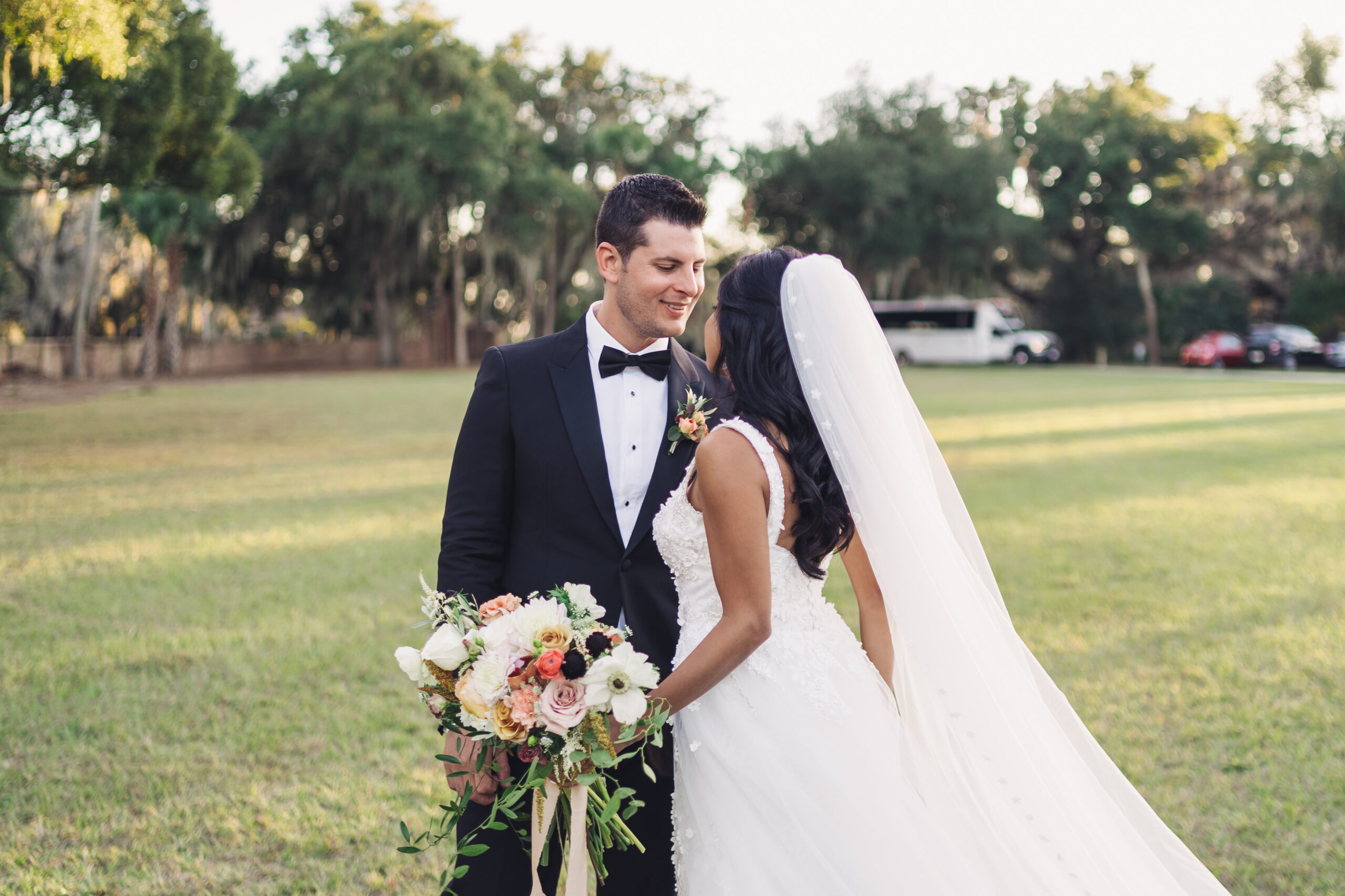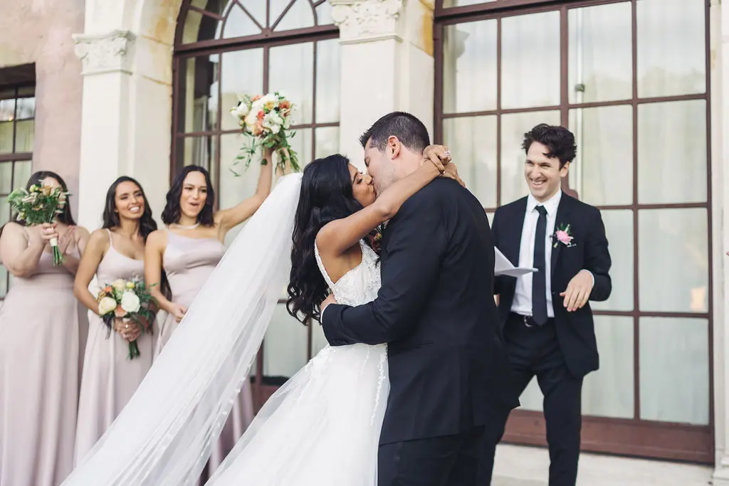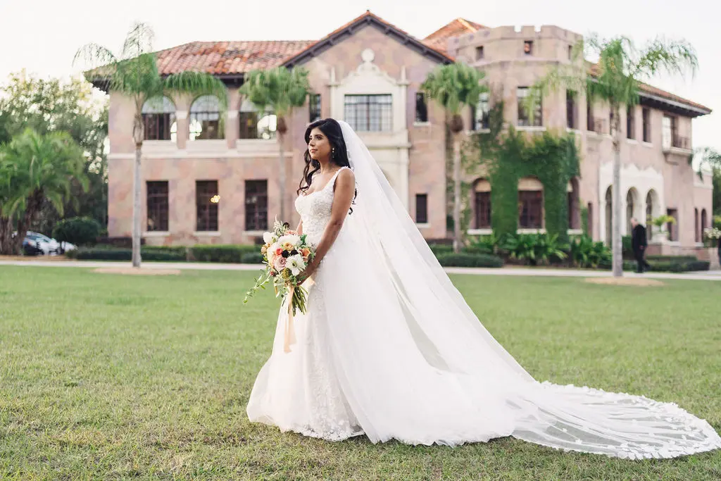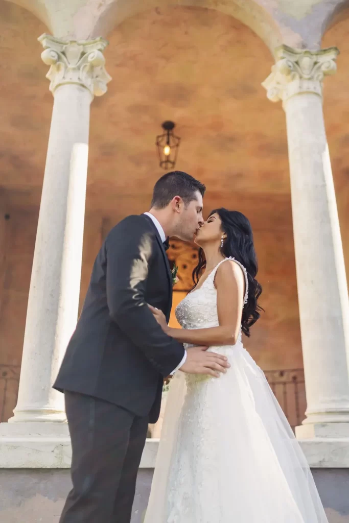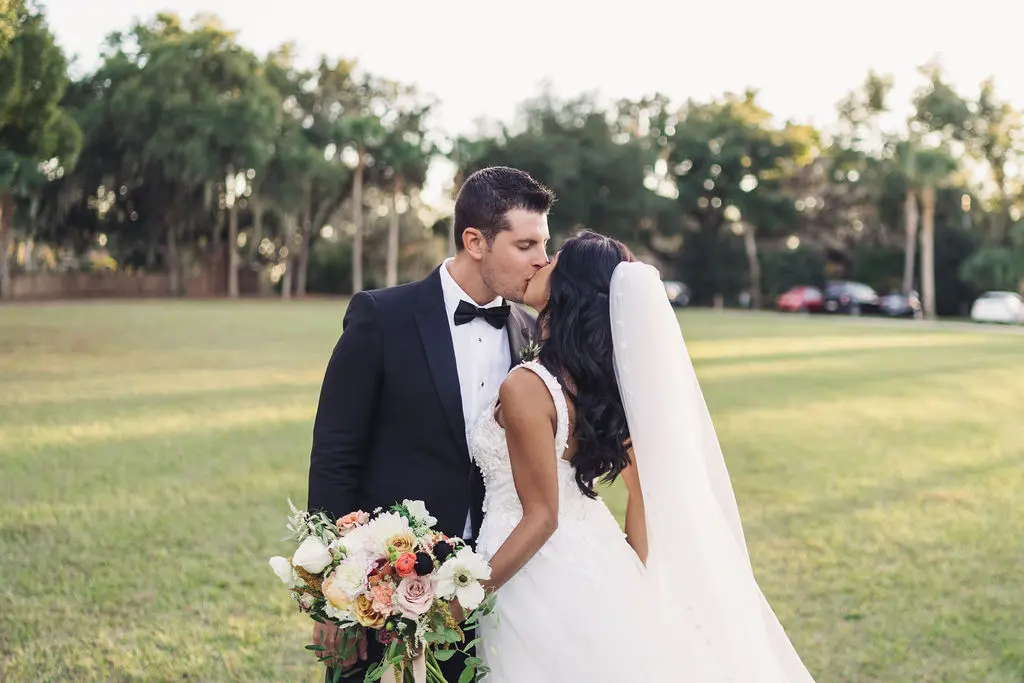 Andrea & Evan's wedding photography at The Howey Mansion is a masterclass in what happens when extraordinary love meets an extraordinary setting. Located in Howey-in-the-Hills just 40 minutes from Orlando, this Mediterranean Revival estate — built in 1925 and listed on the National Register of Historic Places — is one of Central Florida's most visually stunning wedding venues, and every frame of their gallery proves it. Andrea wore a breathtaking ballgown with a dramatic cathedral train, carrying a lush bouquet of coral, peach, and ivory blooms with trailing greenery, while Evan stood beside her in a sleek black tuxedo looking every bit as polished as the venue itself. Their kiss on the sweeping green lawn with the iconic rose-stucco facade, terracotta roofline, and swaying palms behind them is the kind of portrait that defines a wedding gallery. Captured by Palms Isles Orlando wedding photography, this Howey Mansion gallery is timeless.