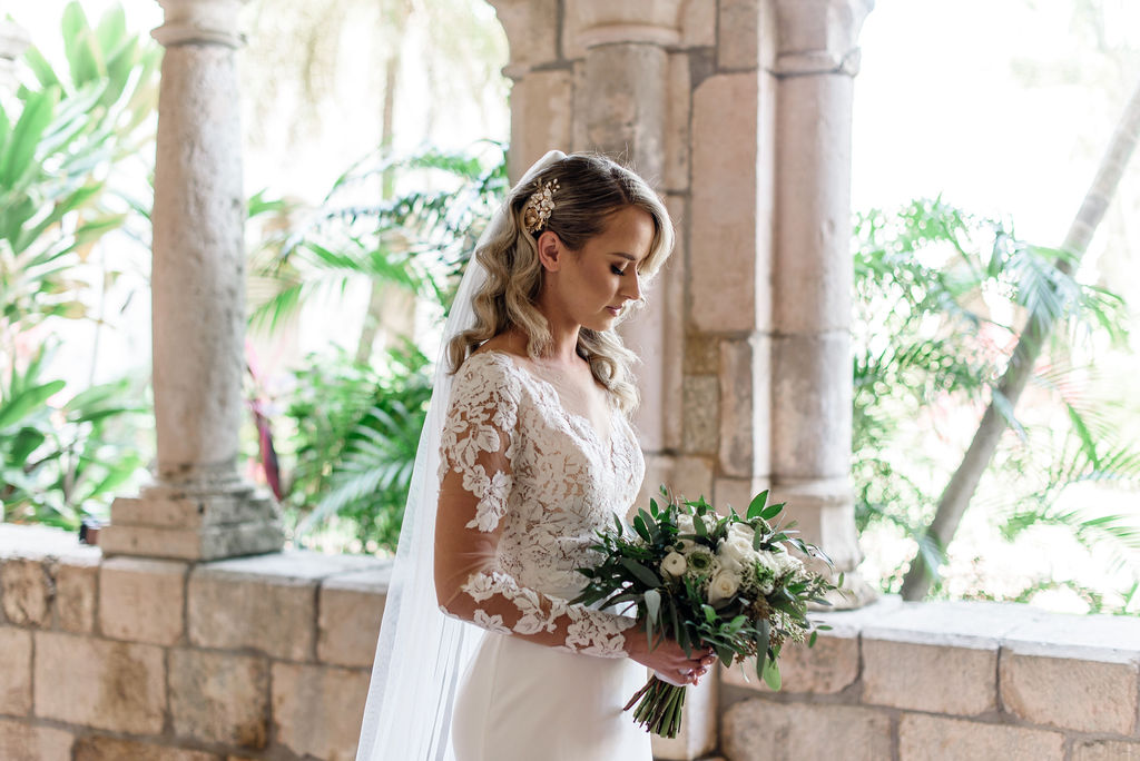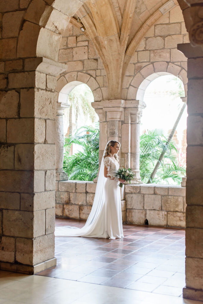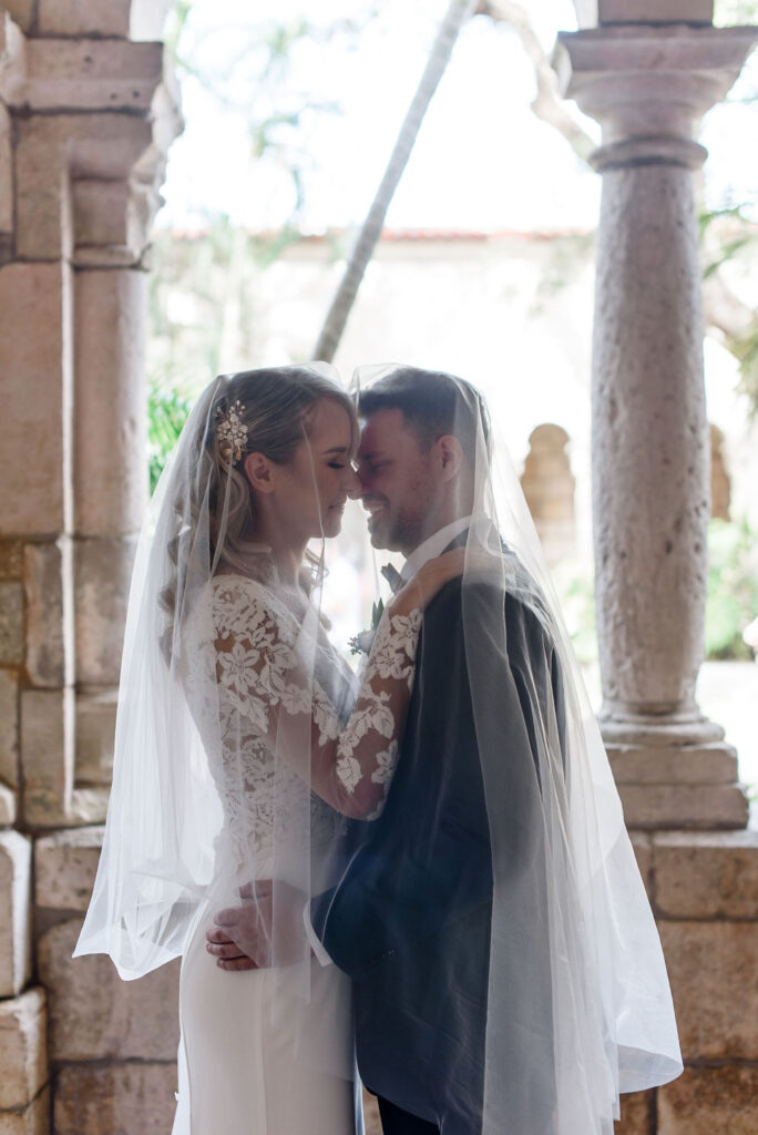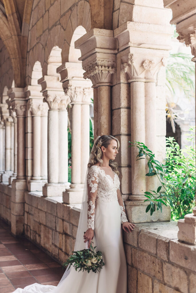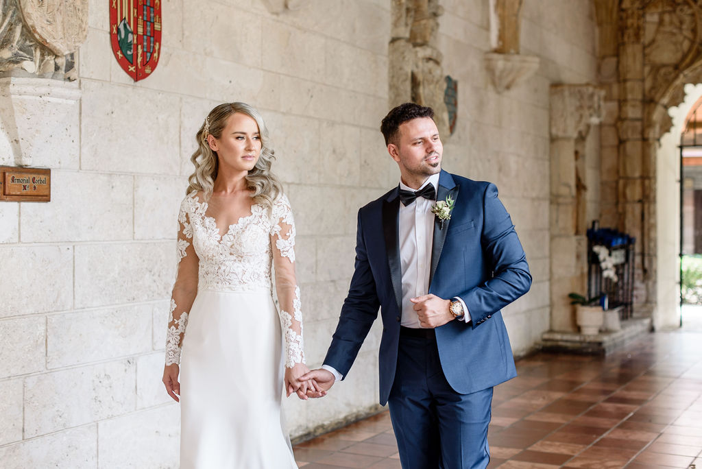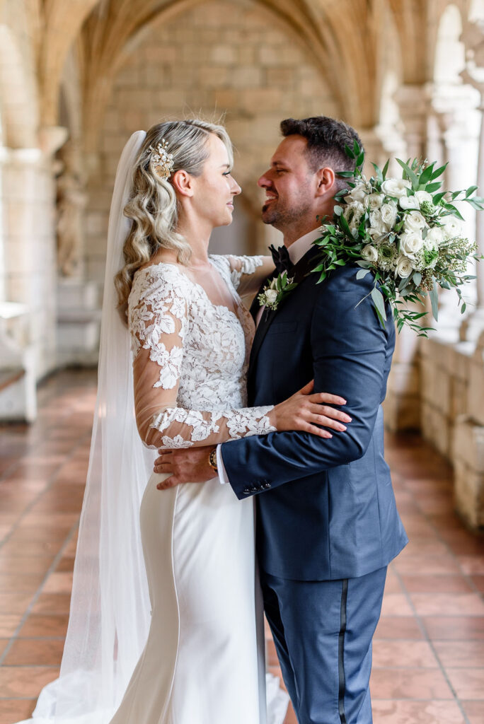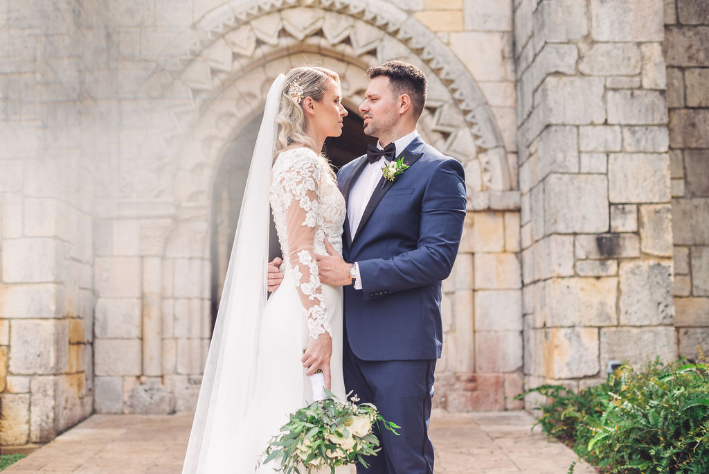 Anna & Marius's wedding photography at The Ancient Spanish Monastery in Miami is one of the most visually stunning galleries in our entire portfolio. Built in 12th-century Spain and reassembled stone by stone in North Miami Beach, this extraordinary venue delivers a backdrop so cinematic it barely feels real — and yet every emotion in these images is completely genuine. Anna was breathtaking in an intricate illusion lace long-sleeve gown with a cathedral veil, holding a lush greenery-and-white rose bouquet, while Marius stood beside her in a sharp navy tuxedo looking every bit as polished as the 900-year-old stone archway framing them both. Foreheads together, eyes closed, completely lost in each other — this portrait is timeless in every sense of the word. Captured by Palms Isles Miami wedding photography, this gallery is historic, romantic, and impossibly beautiful.