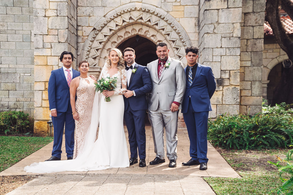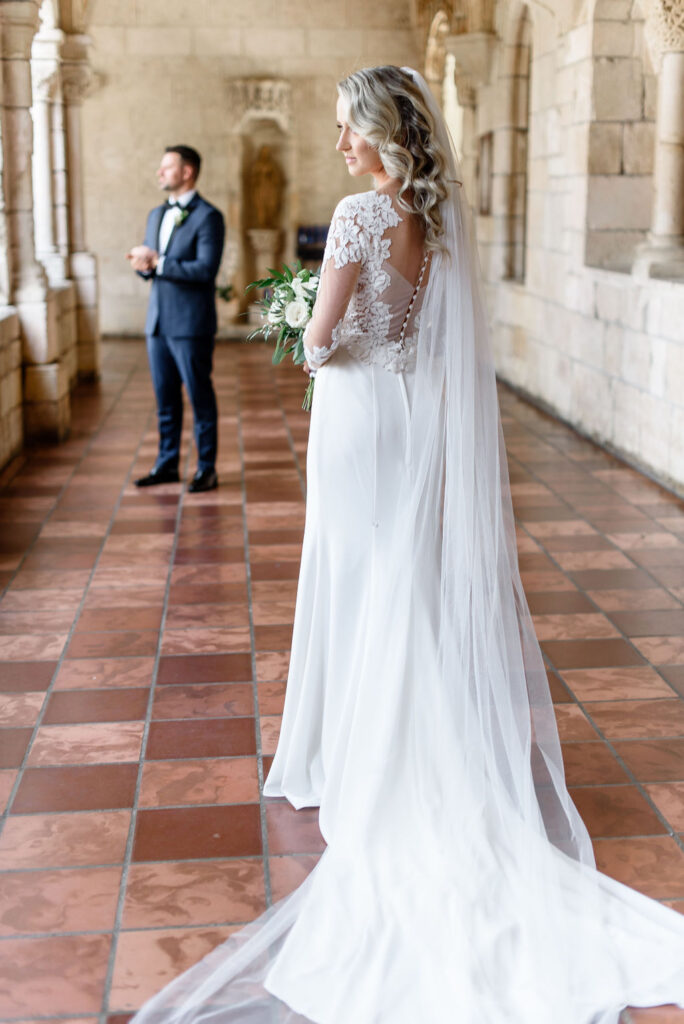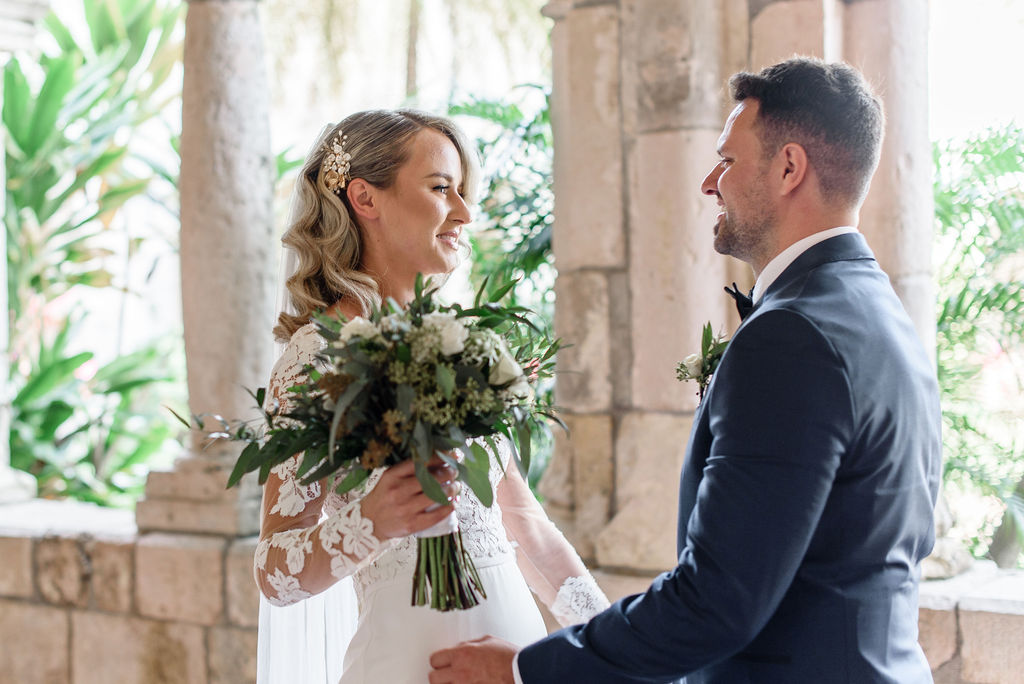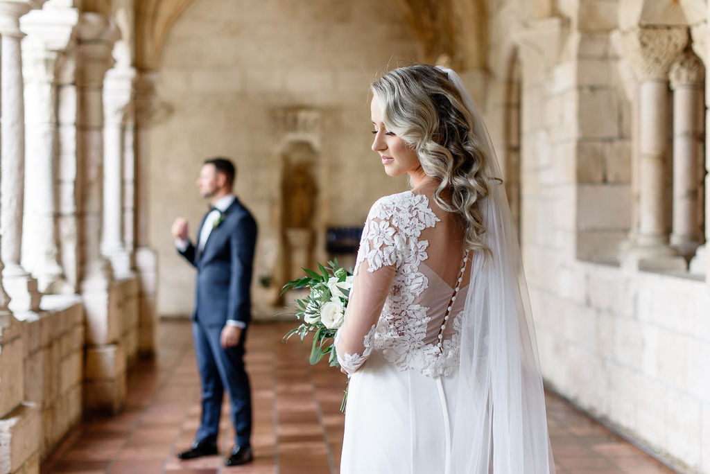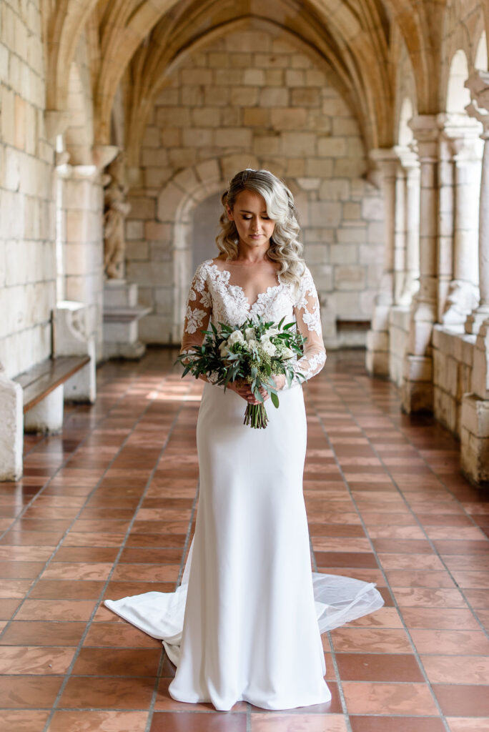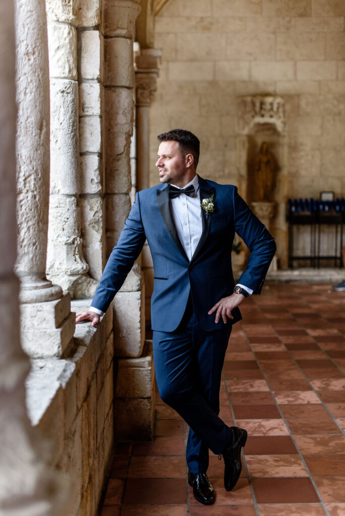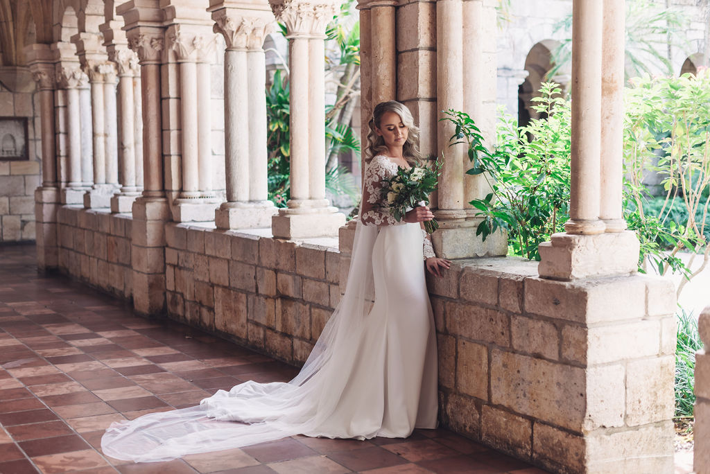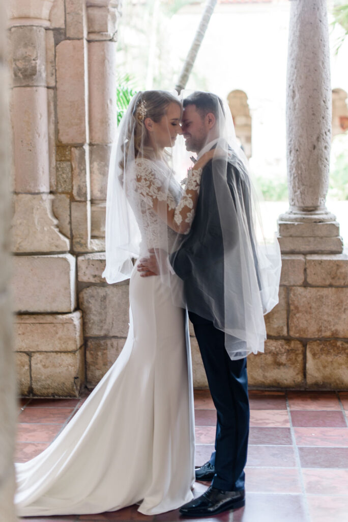 Anna & Marius's wedding photography at The Ancient Spanish Monastery in Miami is one of the most visually stunning galleries in our entire portfolio. Built in 12th-century Spain and reassembled stone by stone in North Miami Beach, this extraordinary venue delivers a backdrop so cinematic it barely feels real — and yet every emotion in these images is completely genuine. Anna was breathtaking in an intricate illusion lace long-sleeve gown with a cathedral veil, holding a lush greenery-and-white rose bouquet, while Marius stood beside her in a sharp navy tuxedo looking every bit as polished as the 900-year-old stone archway framing them both. Foreheads together, eyes closed, completely lost in each other — this portrait is timeless in every sense of the word. Captured by Palms Isles Miami wedding photography, this gallery is historic, romantic, and impossibly beautiful.