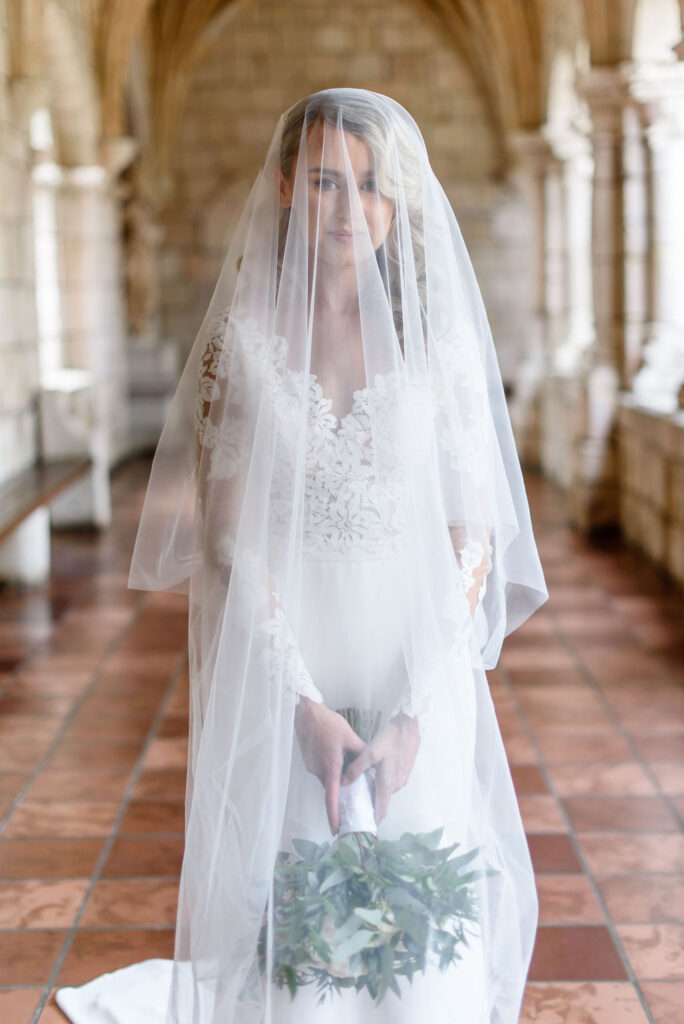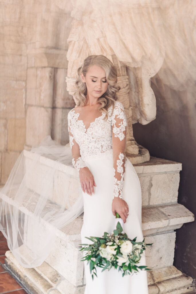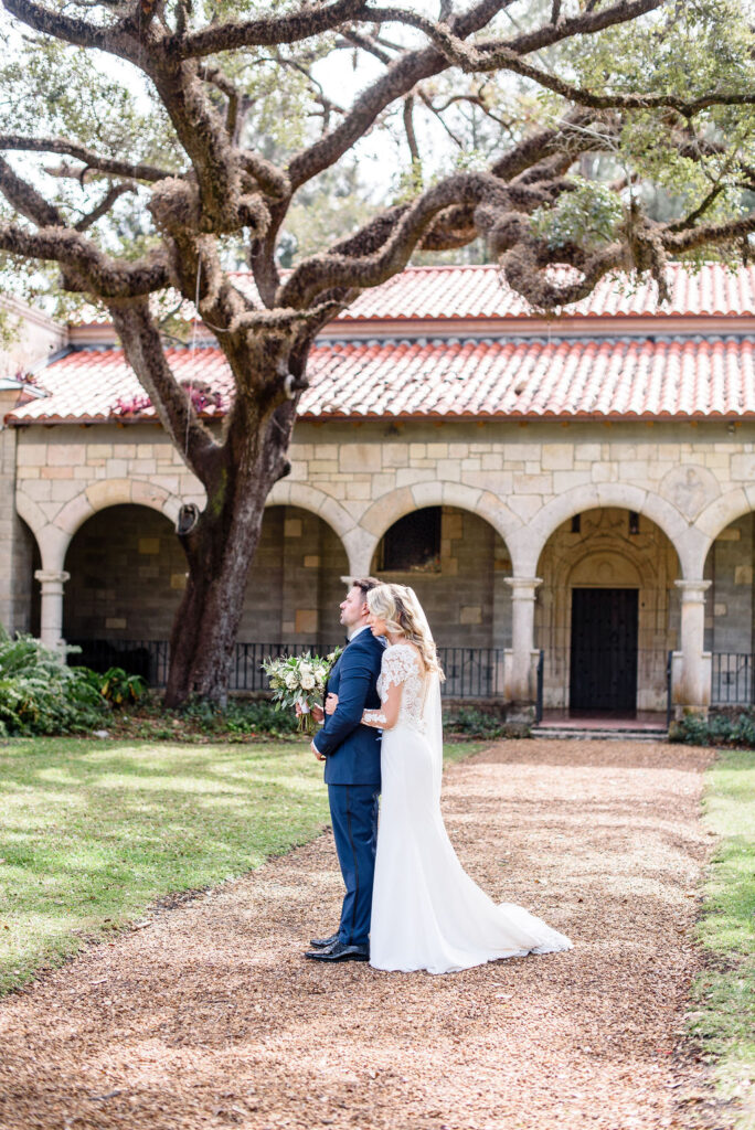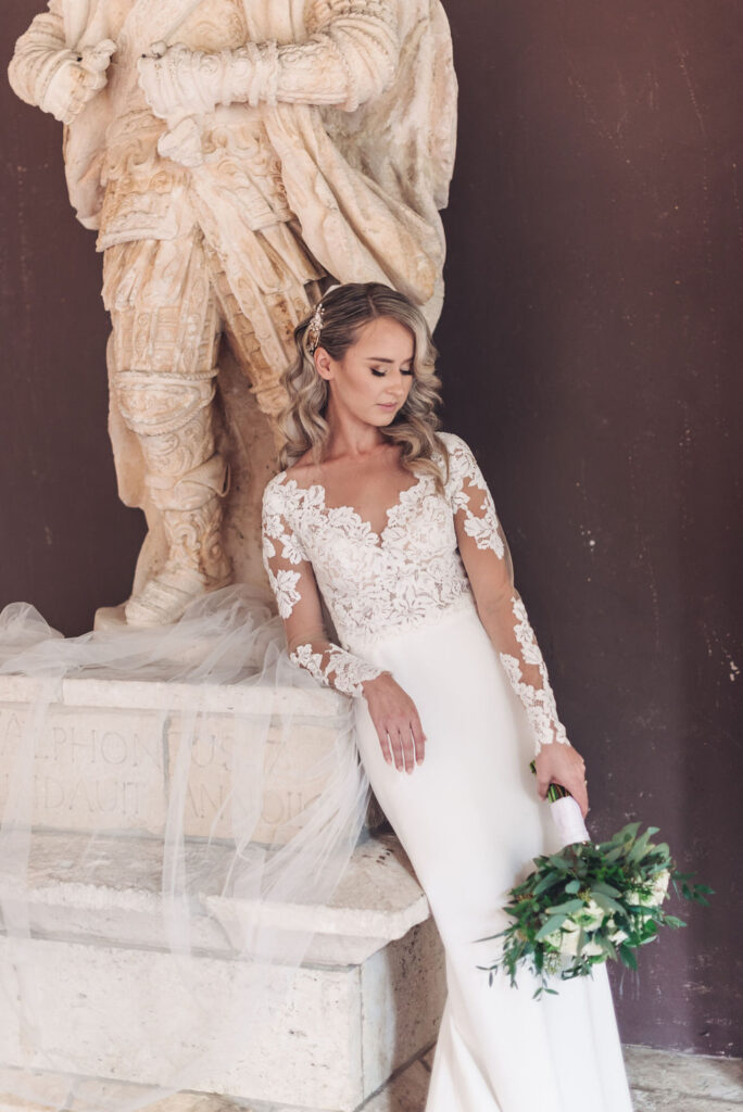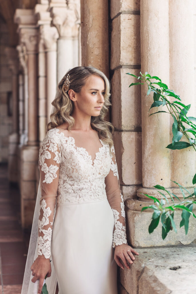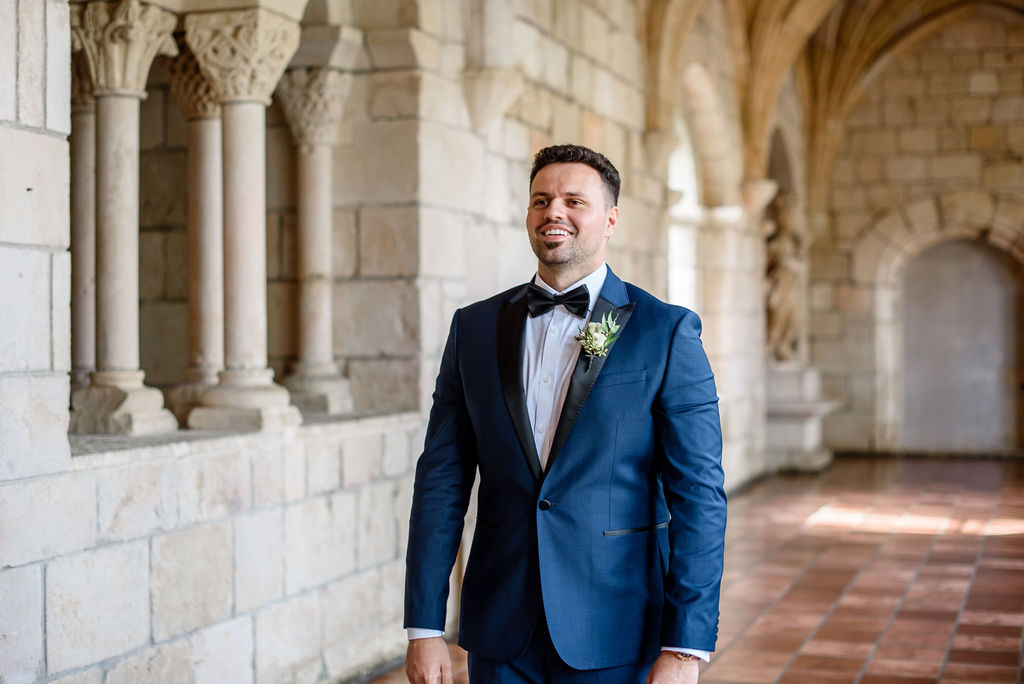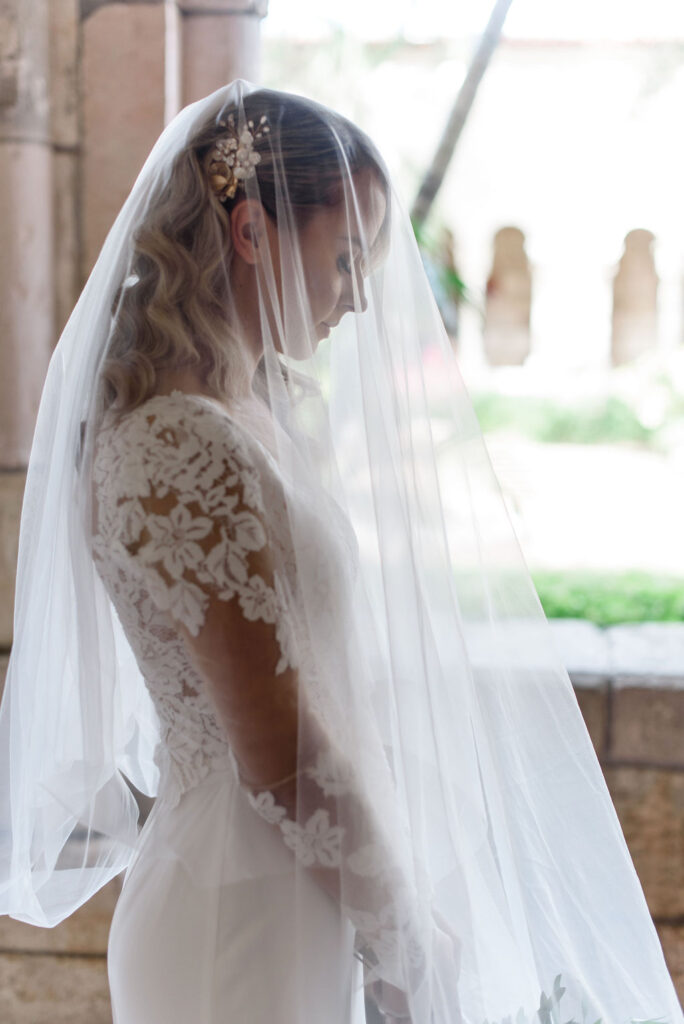 Anna & Marius's wedding photography at The Ancient Spanish Monastery in Miami is one of the most visually stunning galleries in our entire portfolio. Built in 12th-century Spain and reassembled stone by stone in North Miami Beach, this extraordinary venue delivers a backdrop so cinematic it barely feels real — and yet every emotion in these images is completely genuine. Anna was breathtaking in an intricate illusion lace long-sleeve gown with a cathedral veil, holding a lush greenery-and-white rose bouquet, while Marius stood beside her in a sharp navy tuxedo looking every bit as polished as the 900-year-old stone archway framing them both. Foreheads together, eyes closed, completely lost in each other — this portrait is timeless in every sense of the word. Captured by Palms Isles Miami wedding photography, this gallery is historic, romantic, and impossibly beautiful.