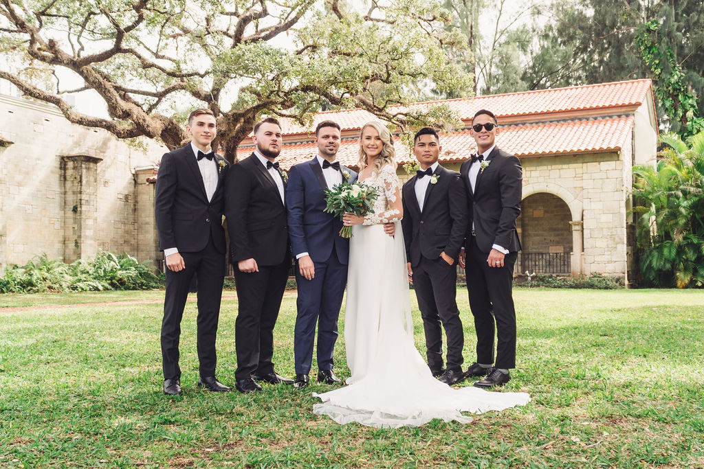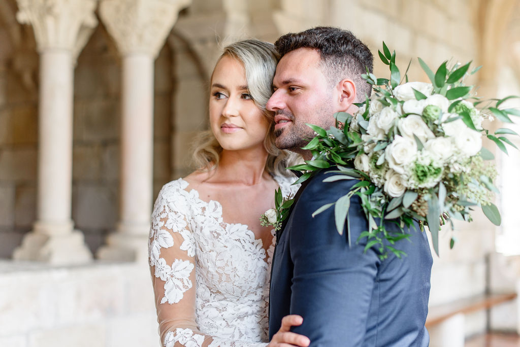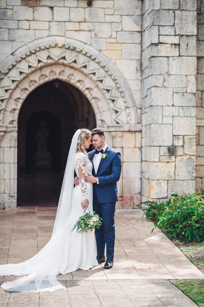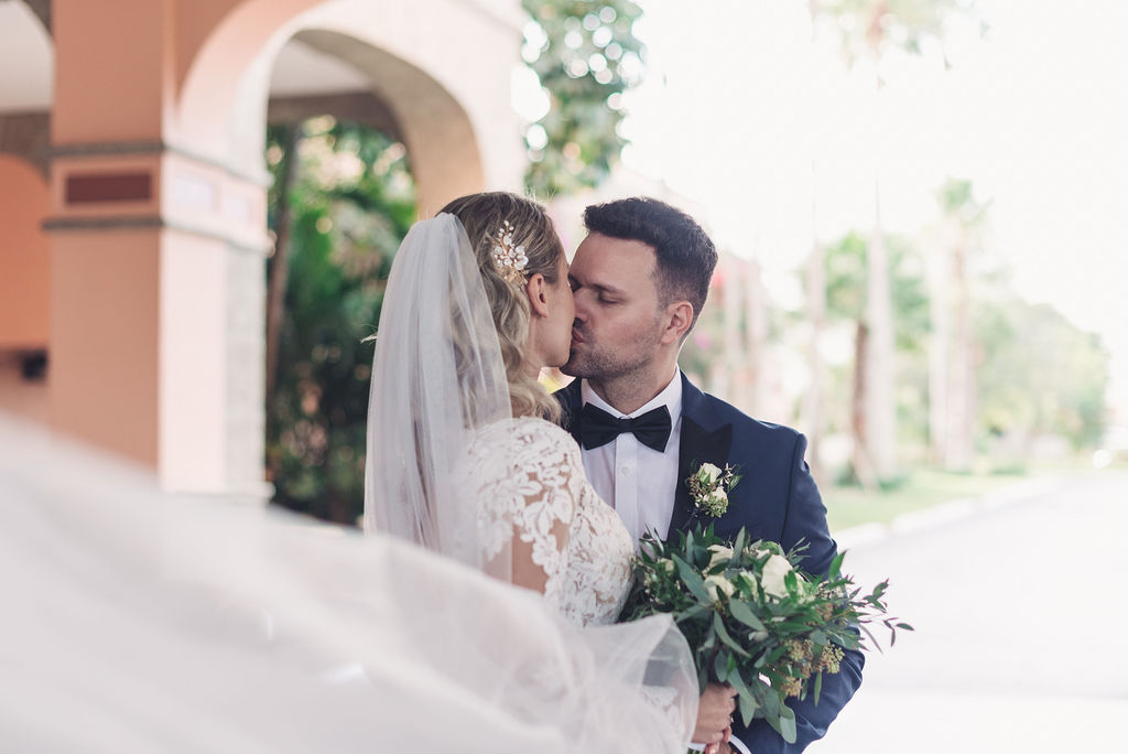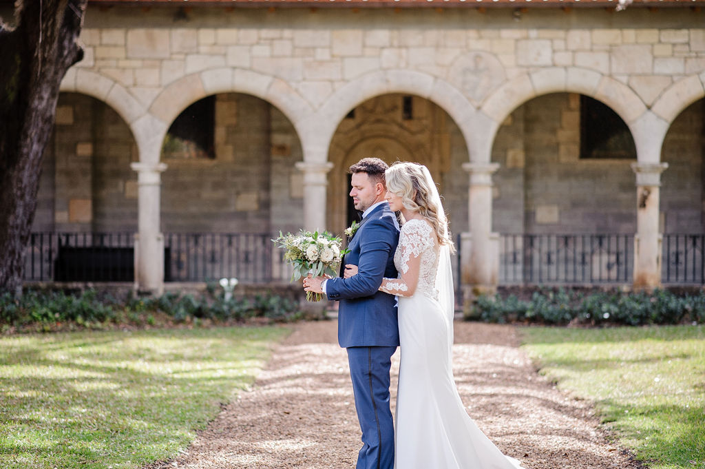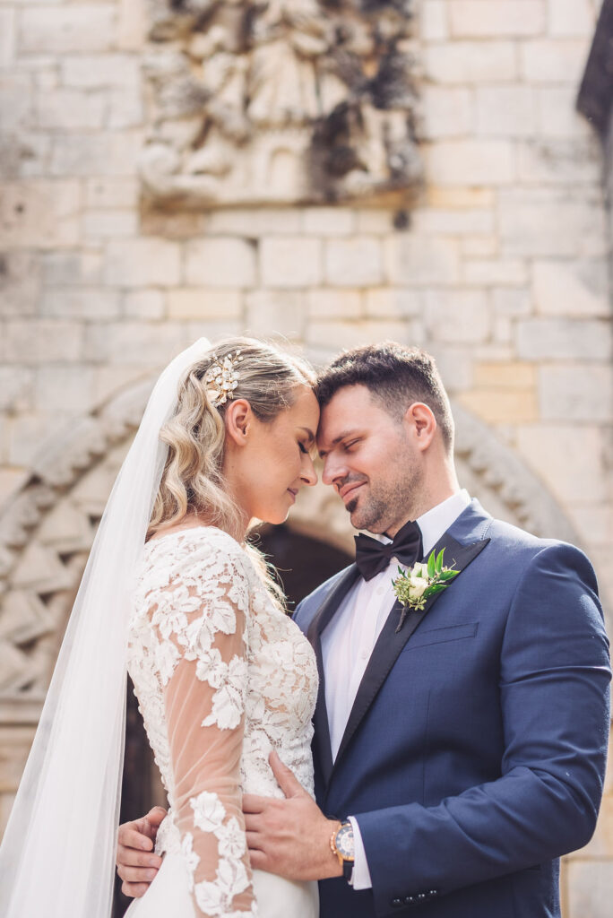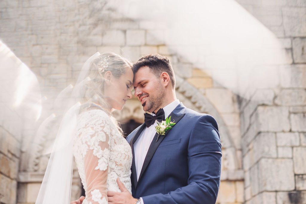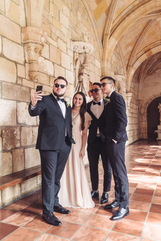 Anna & Marius's wedding photography at The Ancient Spanish Monastery in Miami is one of the most visually stunning galleries in our entire portfolio. Built in 12th-century Spain and reassembled stone by stone in North Miami Beach, this extraordinary venue delivers a backdrop so cinematic it barely feels real — and yet every emotion in these images is completely genuine. Anna was breathtaking in an intricate illusion lace long-sleeve gown with a cathedral veil, holding a lush greenery-and-white rose bouquet, while Marius stood beside her in a sharp navy tuxedo looking every bit as polished as the 900-year-old stone archway framing them both. Foreheads together, eyes closed, completely lost in each other — this portrait is timeless in every sense of the word. Captured by Palms Isles Miami wedding photography, this gallery is historic, romantic, and impossibly beautiful.