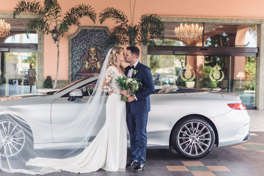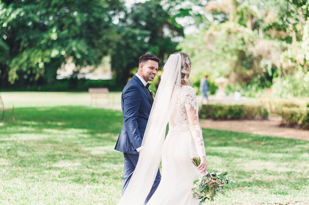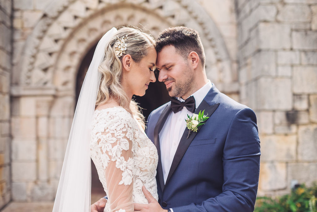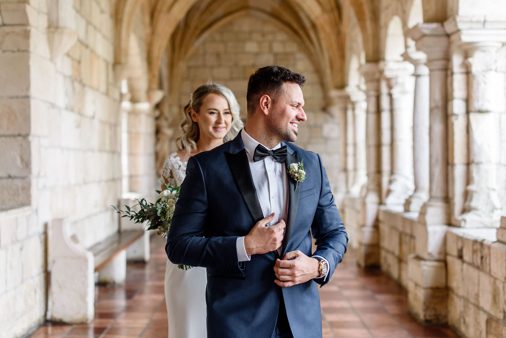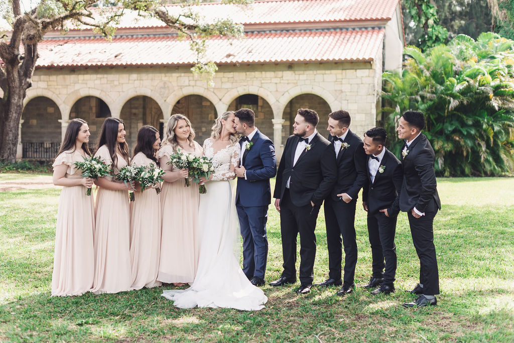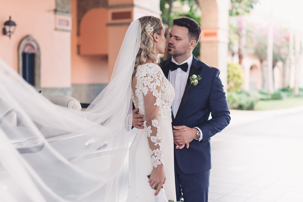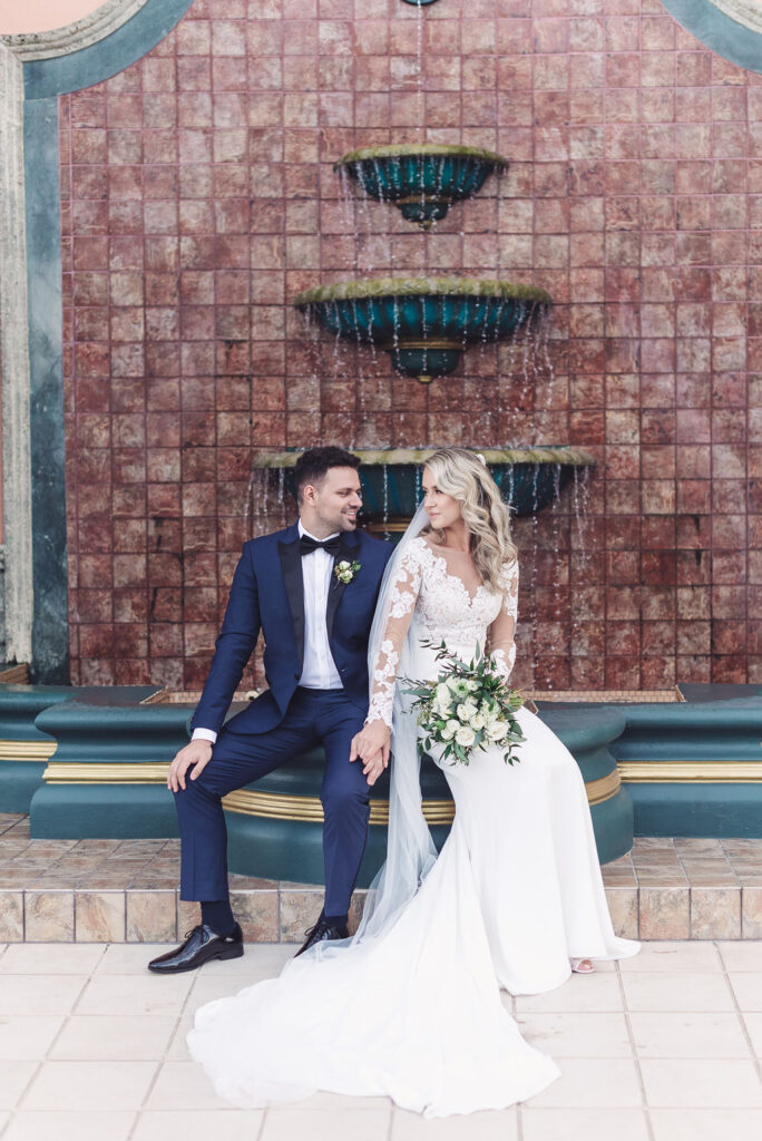 Anna & Marius's wedding photography at The Ancient Spanish Monastery in Miami is one of the most visually stunning galleries in our entire portfolio. Built in 12th-century Spain and reassembled stone by stone in North Miami Beach, this extraordinary venue delivers a backdrop so cinematic it barely feels real — and yet every emotion in these images is completely genuine. Anna was breathtaking in an intricate illusion lace long-sleeve gown with a cathedral veil, holding a lush greenery-and-white rose bouquet, while Marius stood beside her in a sharp navy tuxedo looking every bit as polished as the 900-year-old stone archway framing them both. Foreheads together, eyes closed, completely lost in each other — this portrait is timeless in every sense of the word. Captured by Palms Isles Miami wedding photography, this gallery is historic, romantic, and impossibly beautiful.