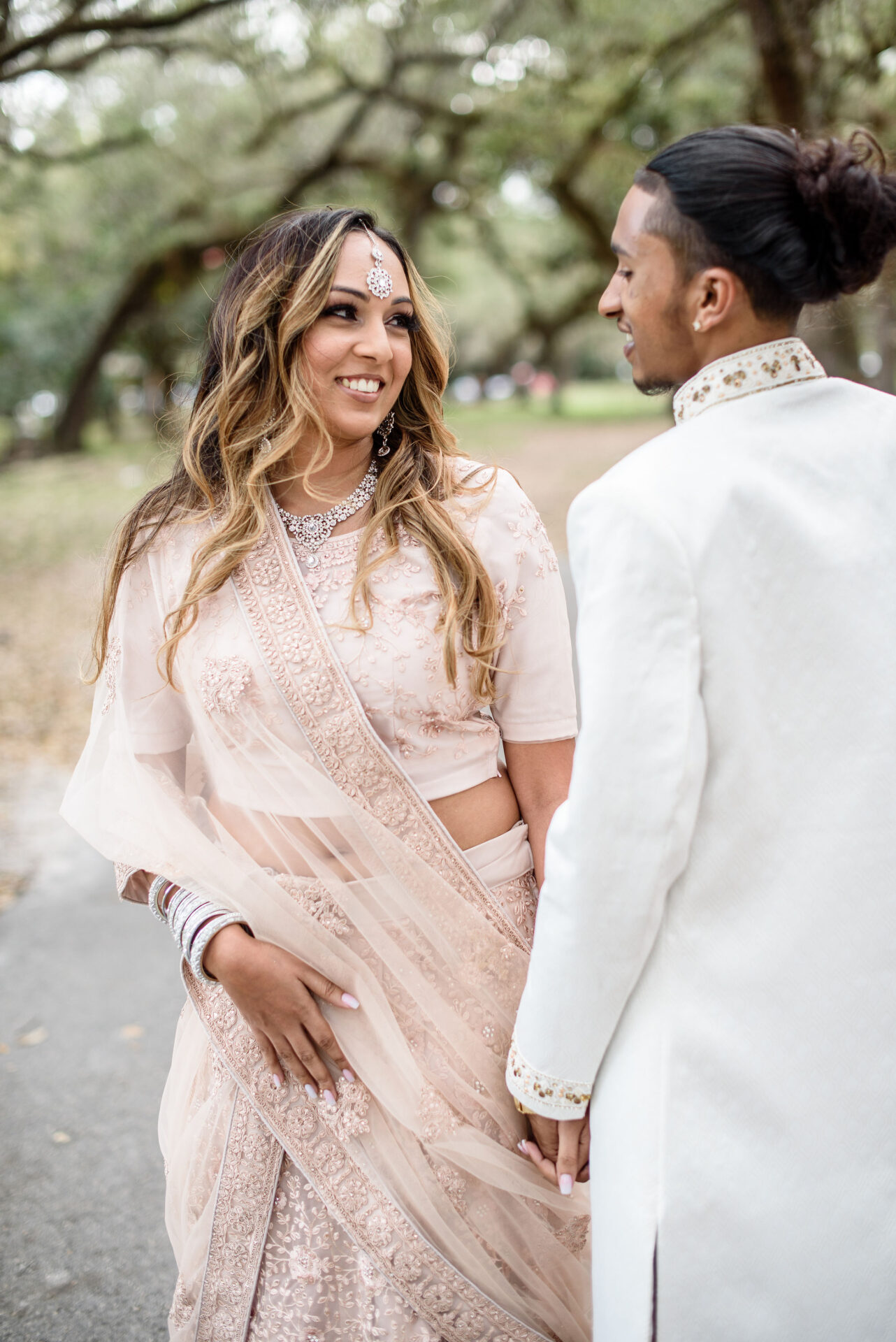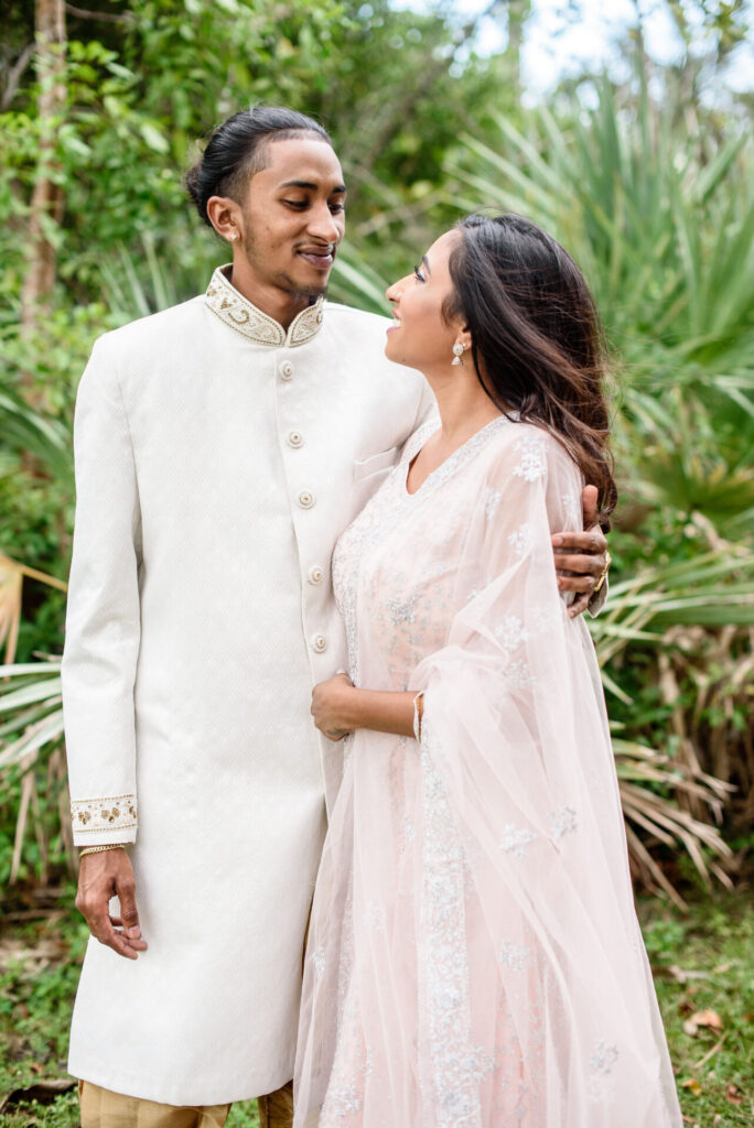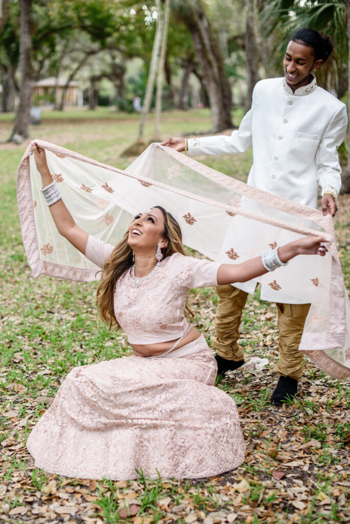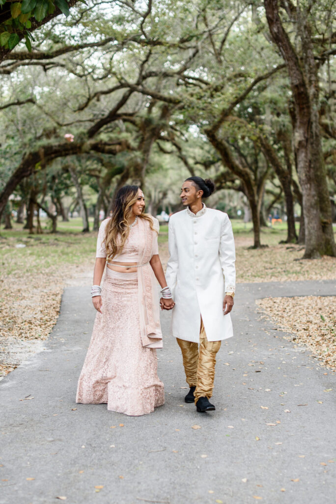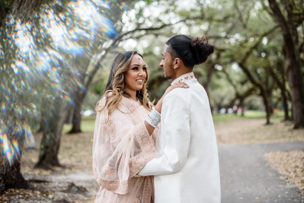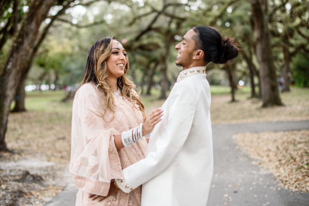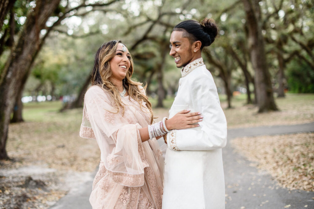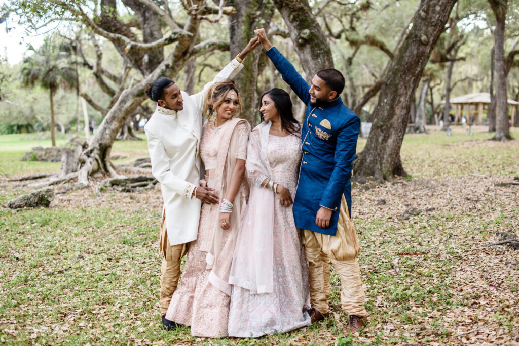 This breathtaking double Indian engagement session in Miami is one of the most joyful and visually stunning galleries in our portfolio. Two couples, two love stories, one extraordinary day filled with laughter, happiness, and the kind of genuine connection that photographs itself. Set beneath a canopy of ancient Southern oak trees with warm September light filtering through the leaves, the natural setting created an effortlessly romantic backdrop that complemented the elegant blush and white Indian attire beautifully. The soft pink lehenga, the crisp white sherwani, the warmth radiating between the couples — every frame feels alive and full of meaning. Across Miami's lush parks, botanical gardens, and iconic natural landscapes, the session shifted and evolved, reflecting the unique personality of each relationship. Captured by Palms Isles Miami engagement photography, this double Indian engagement gallery is warm, joyful, and completely unforgettable.