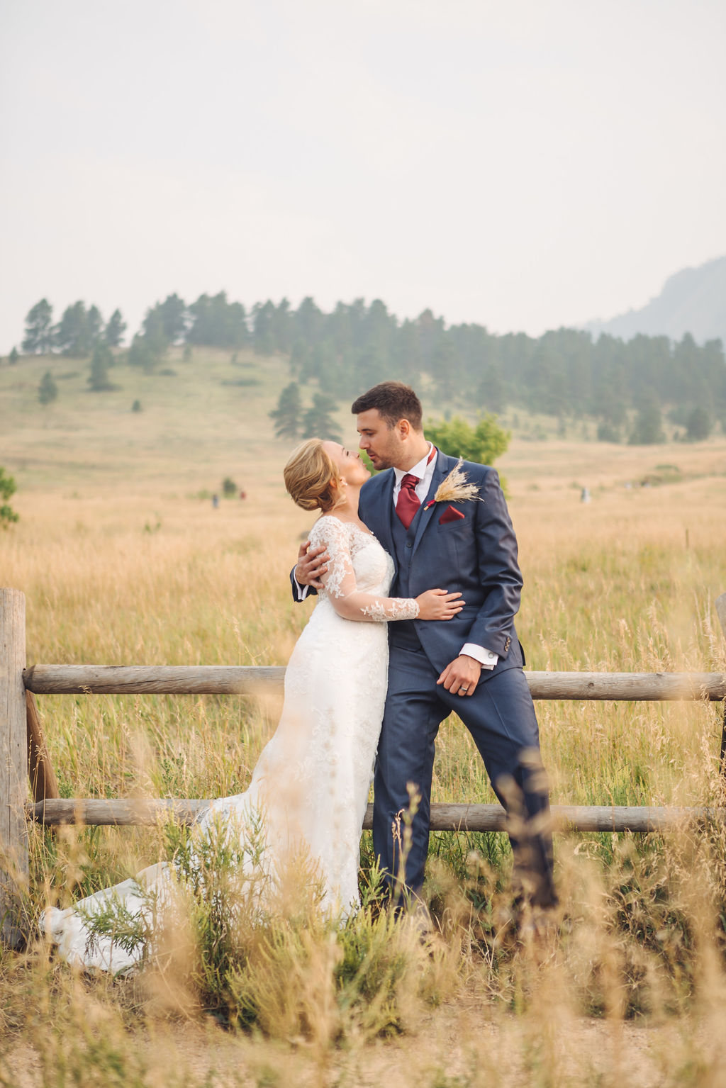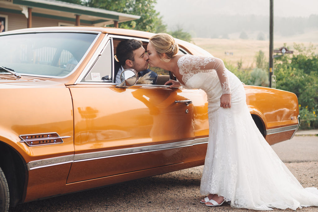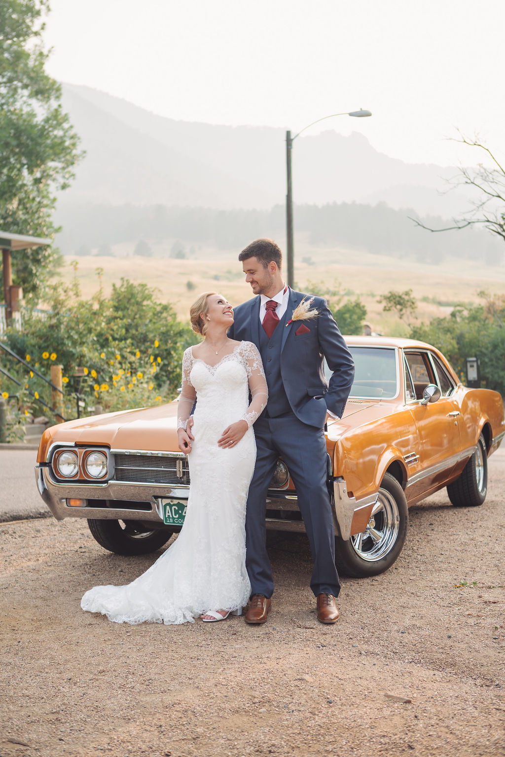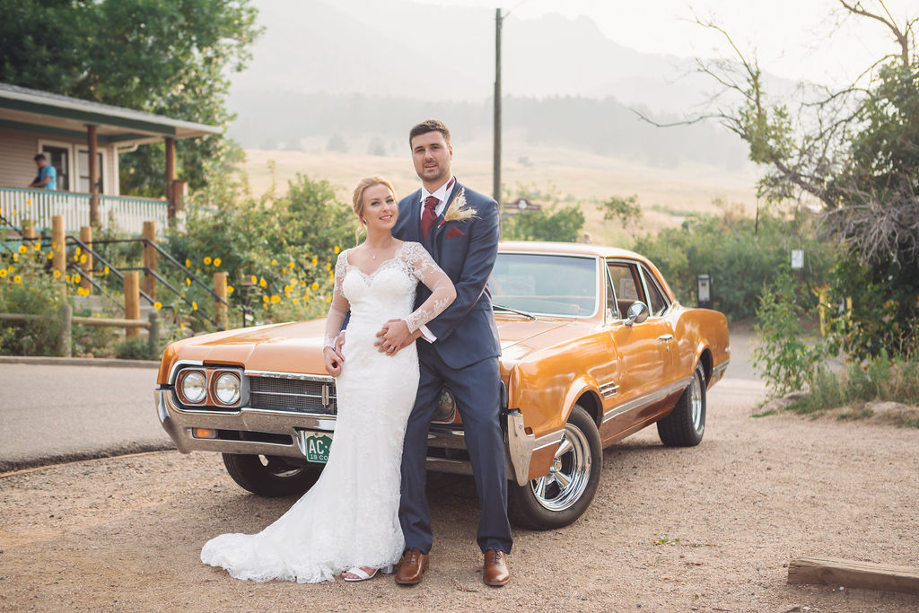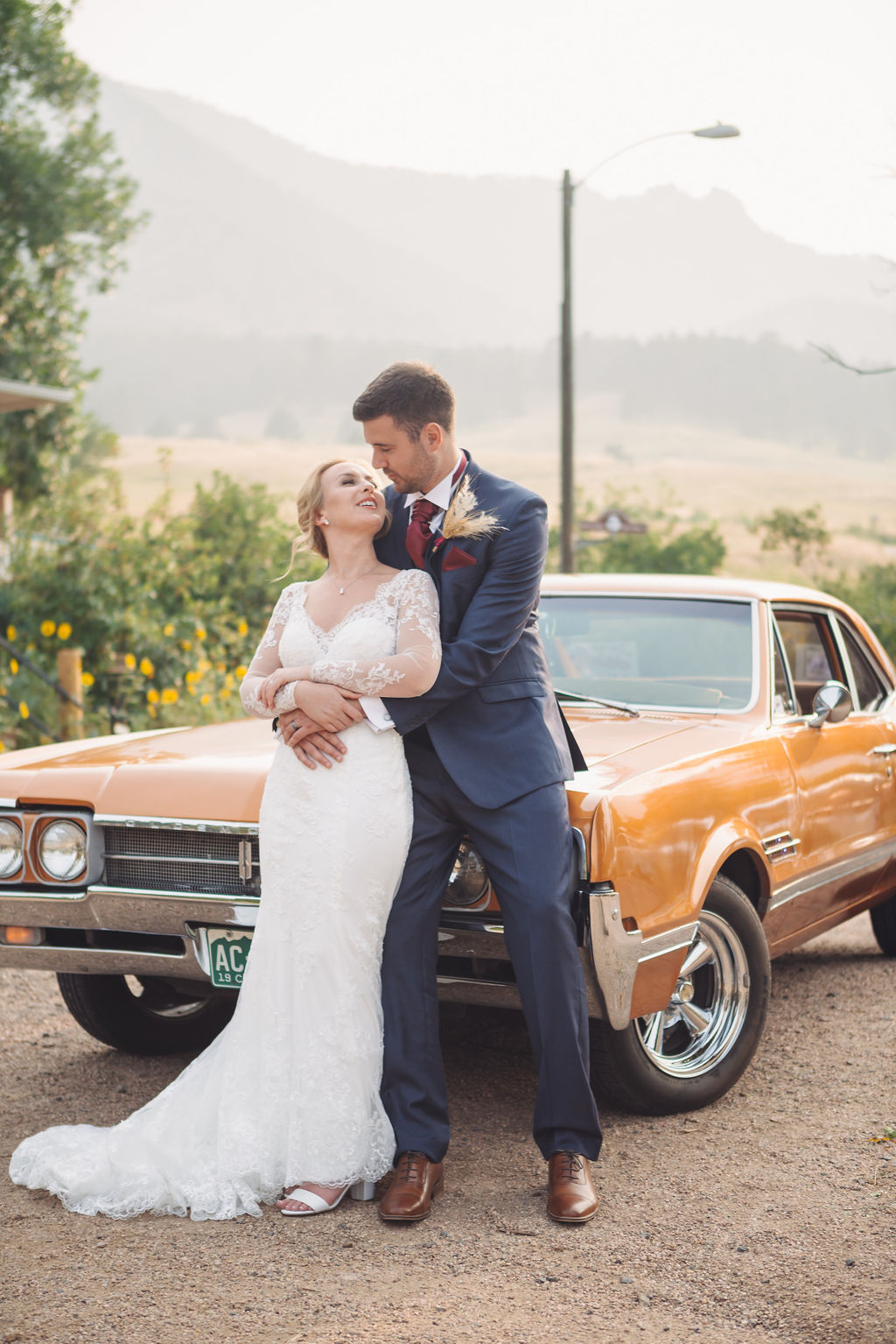 Laura & Jack's wedding in the Colorado foothills was pure magic — a rustic ranch celebration wrapped in golden light, open meadows, and the kind of mountain backdrop that makes Colorado one of the most beautiful places in the world to get married. With the Rocky Mountain peaks rising in the distance and tall grass swaying in the warm summer breeze, their day felt like something out of a film. A lace gown, a navy suit with burgundy details, a weathered wooden fence, and a vintage muscle car gave the day a character all its own — romantic, adventurous, and unmistakably personal. Captured through the lens of Palms Isles wedding photography, this Colorado ranch wedding gallery celebrates the beauty of love set against wide open skies and untouched nature.