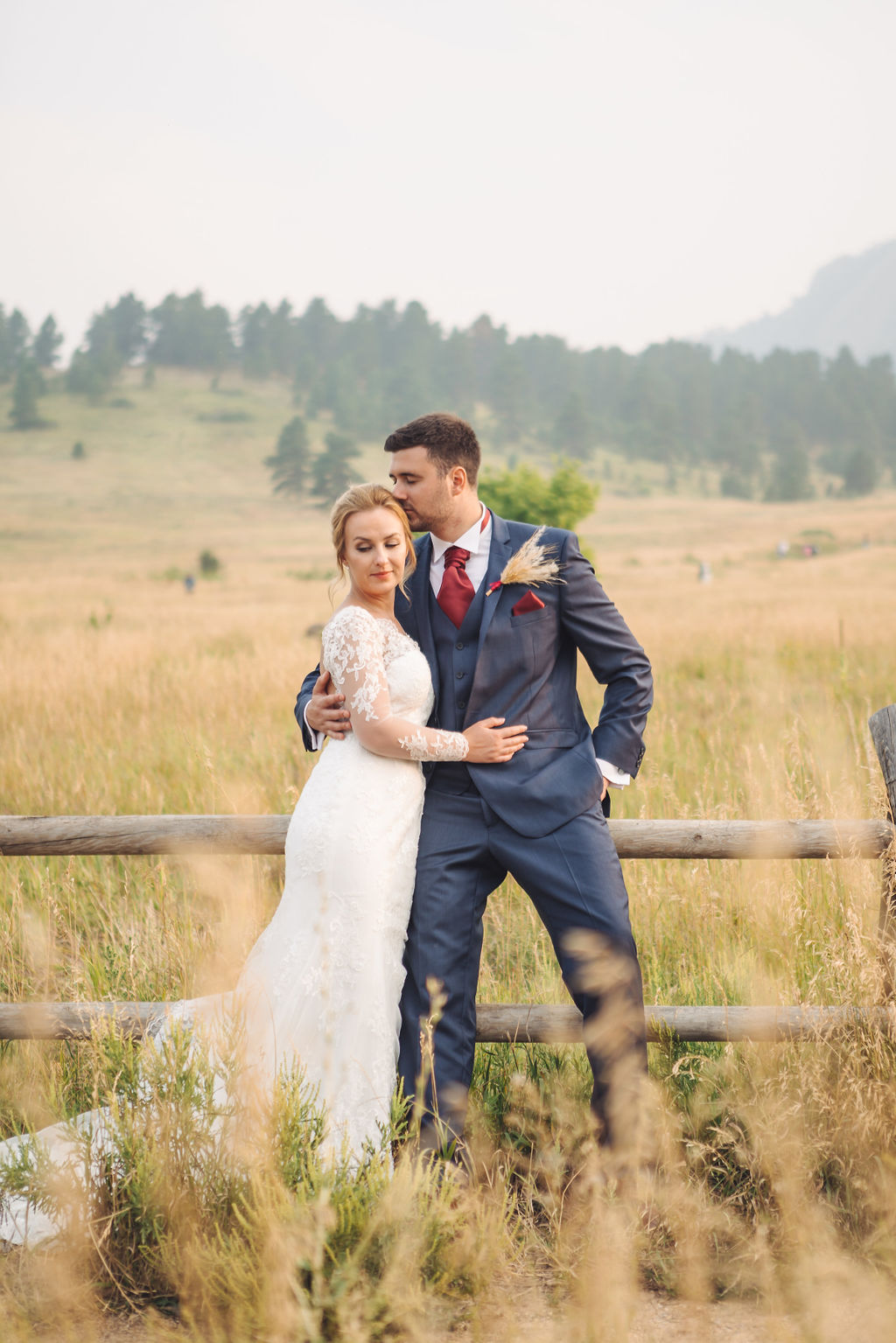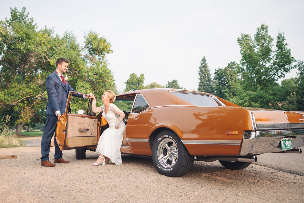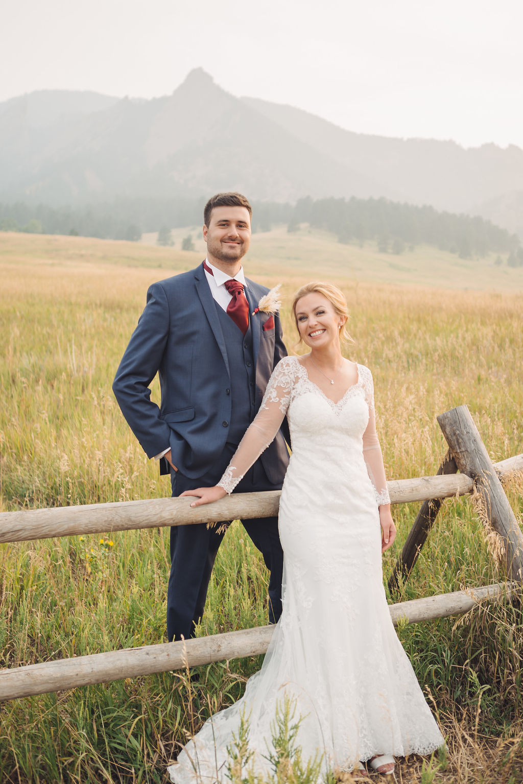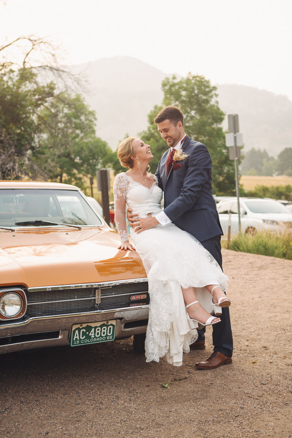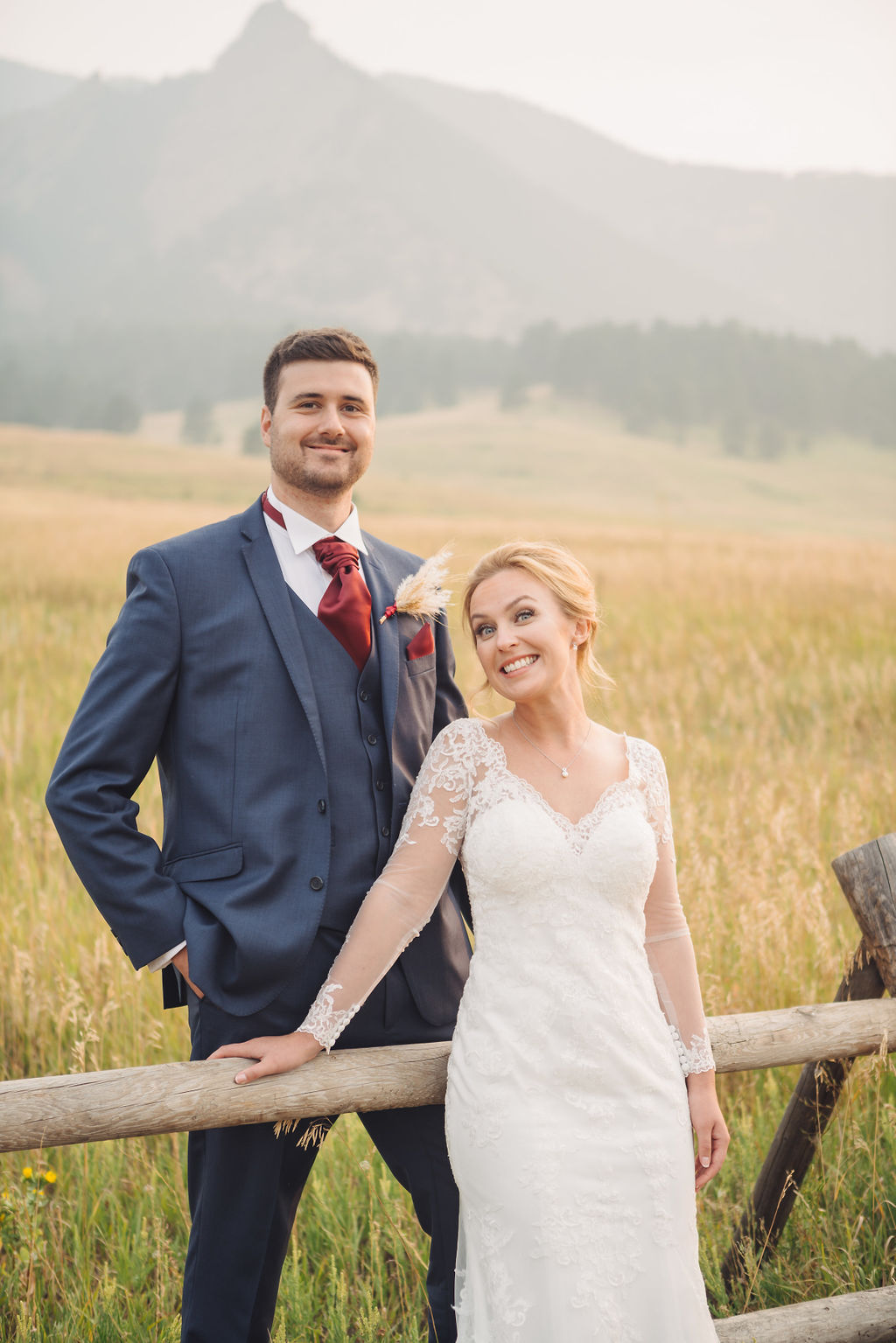 Laura & Jack's wedding in the Colorado foothills was pure magic — a rustic ranch celebration wrapped in golden light, open meadows, and the kind of mountain backdrop that makes Colorado one of the most beautiful places in the world to get married. With the Rocky Mountain peaks rising in the distance and tall grass swaying in the warm summer breeze, their day felt like something out of a film. A lace gown, a navy suit with burgundy details, a weathered wooden fence, and a vintage muscle car gave the day a character all its own — romantic, adventurous, and unmistakably personal. Captured through the lens of Palms Isles wedding photography, this Colorado ranch wedding gallery celebrates the beauty of love set against wide open skies and untouched nature.
