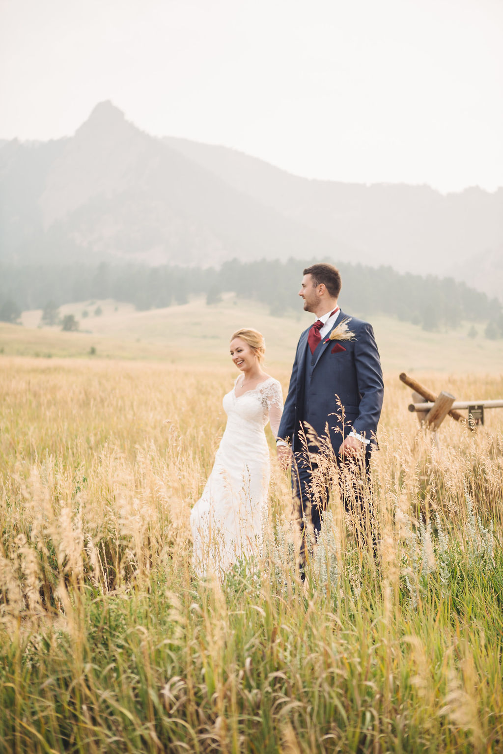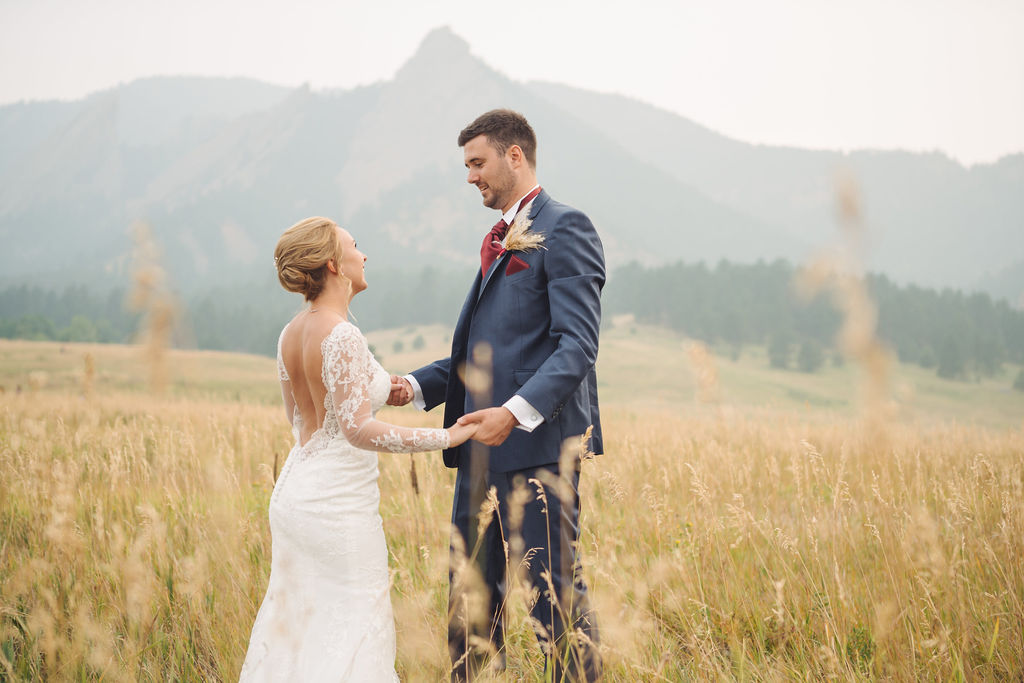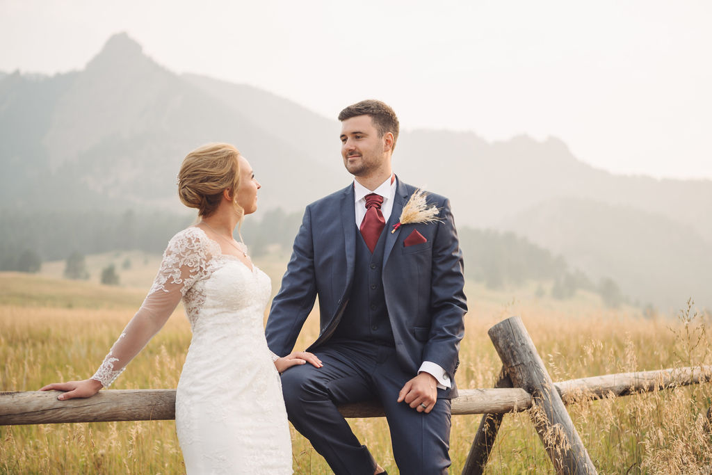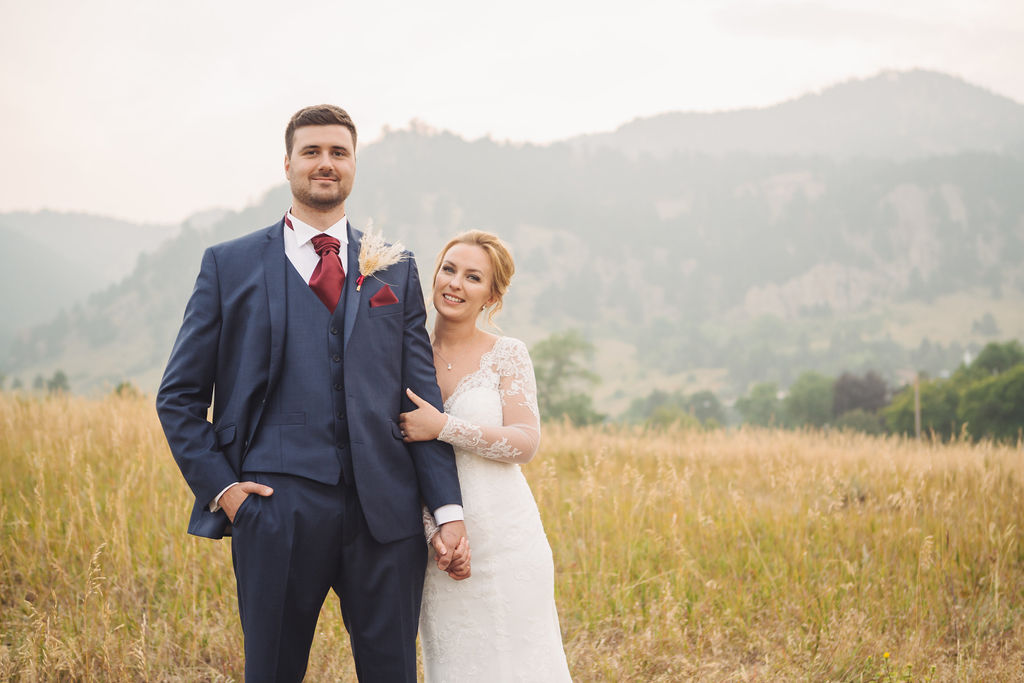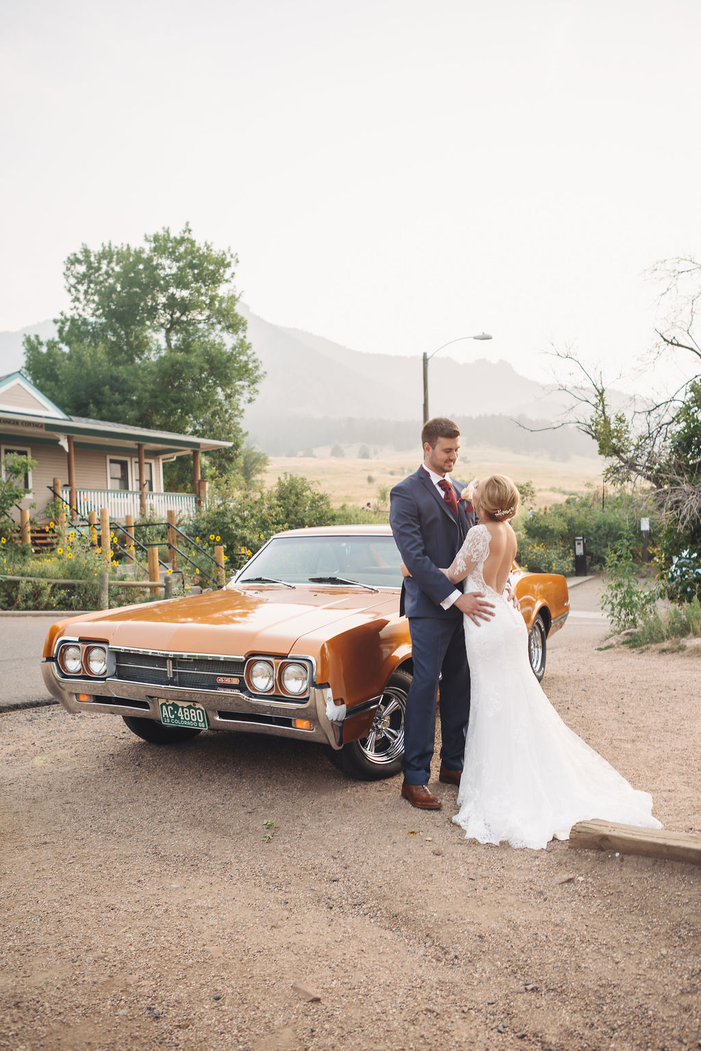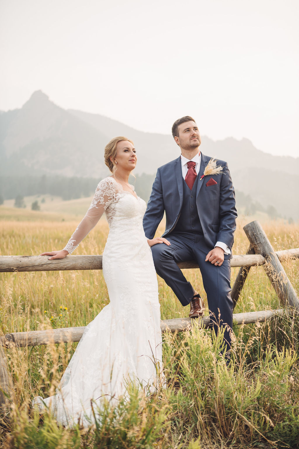 Laura & Jack's wedding in the Colorado foothills was pure magic — a rustic ranch celebration wrapped in golden light, open meadows, and the kind of mountain backdrop that makes Colorado one of the most beautiful places in the world to get married. With the Rocky Mountain peaks rising in the distance and tall grass swaying in the warm summer breeze, their day felt like something out of a film. A lace gown, a navy suit with burgundy details, a weathered wooden fence, and a vintage muscle car gave the day a character all its own — romantic, adventurous, and unmistakably personal. Captured through the lens of Palms Isles wedding photography, this Colorado ranch wedding gallery celebrates the beauty of love set against wide open skies and untouched nature.