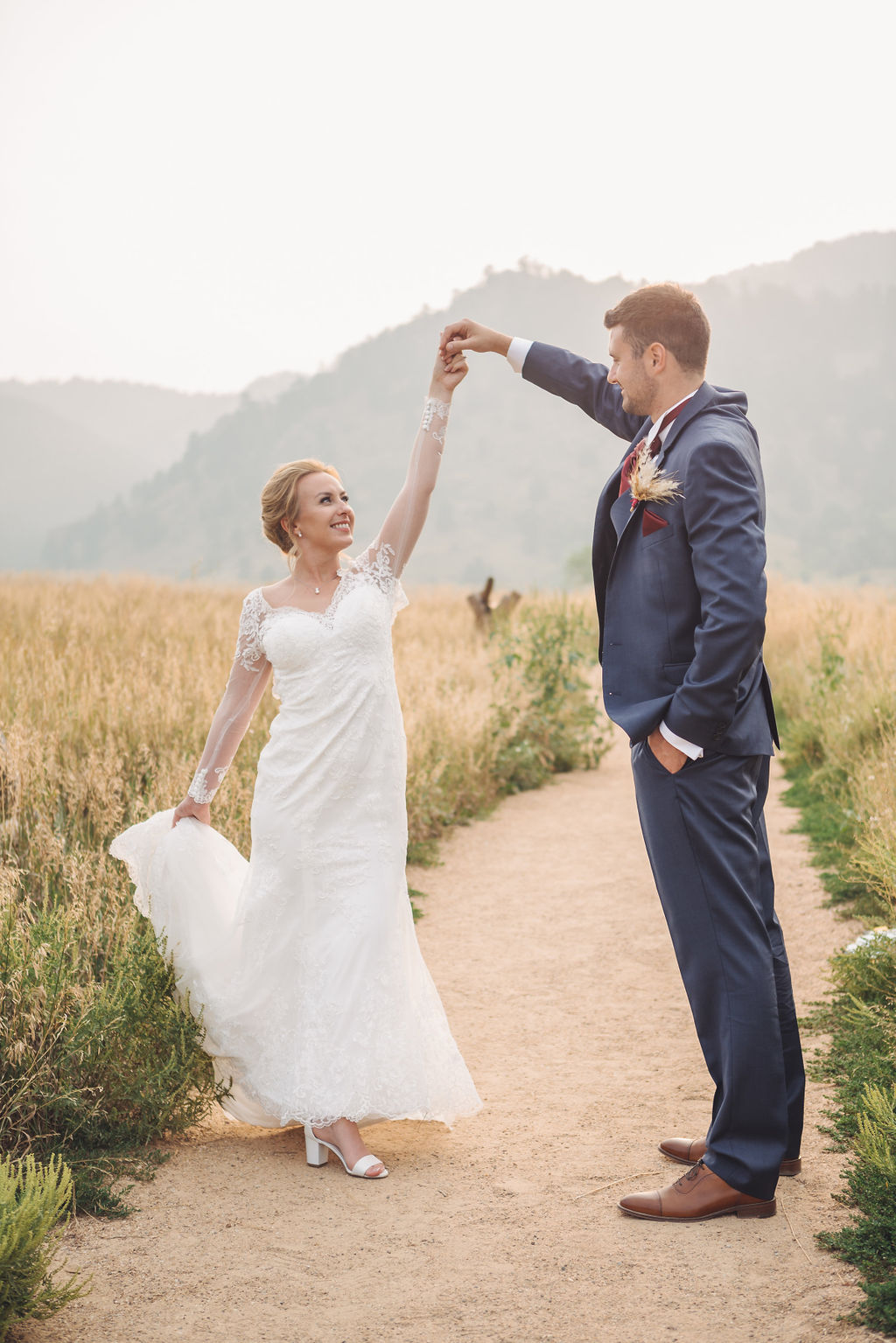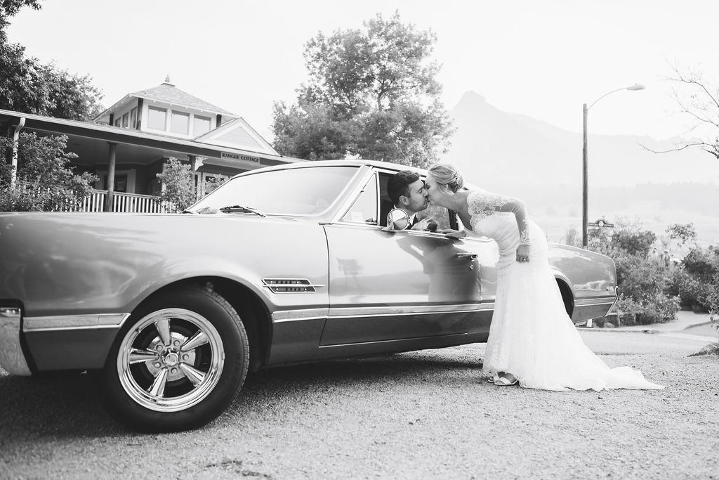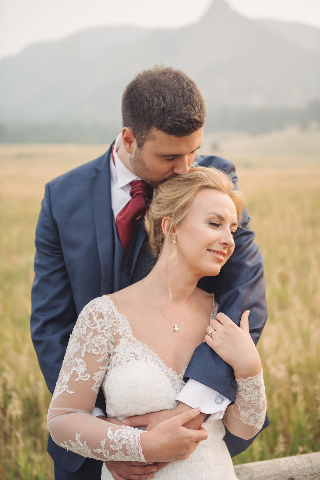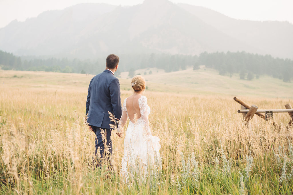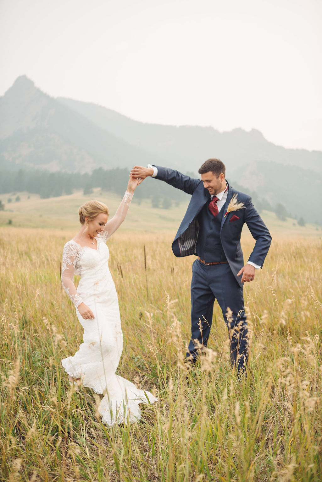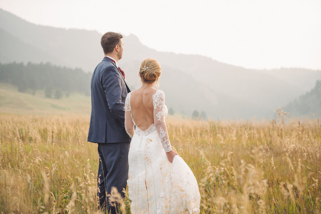 Laura & Jack's wedding in the Colorado foothills was pure magic — a rustic ranch celebration wrapped in golden light, open meadows, and the kind of mountain backdrop that makes Colorado one of the most beautiful places in the world to get married. With the Rocky Mountain peaks rising in the distance and tall grass swaying in the warm summer breeze, their day felt like something out of a film. A lace gown, a navy suit with burgundy details, a weathered wooden fence, and a vintage muscle car gave the day a character all its own — romantic, adventurous, and unmistakably personal. Captured through the lens of Palms Isles wedding photography, this Colorado ranch wedding gallery celebrates the beauty of love set against wide open skies and untouched nature.