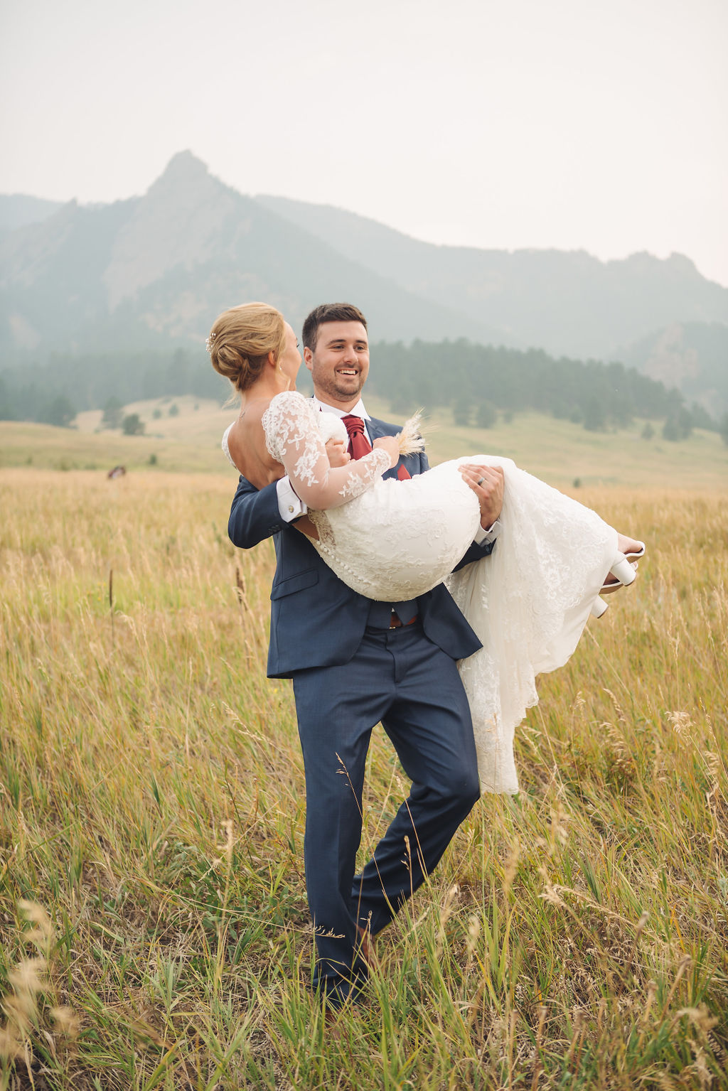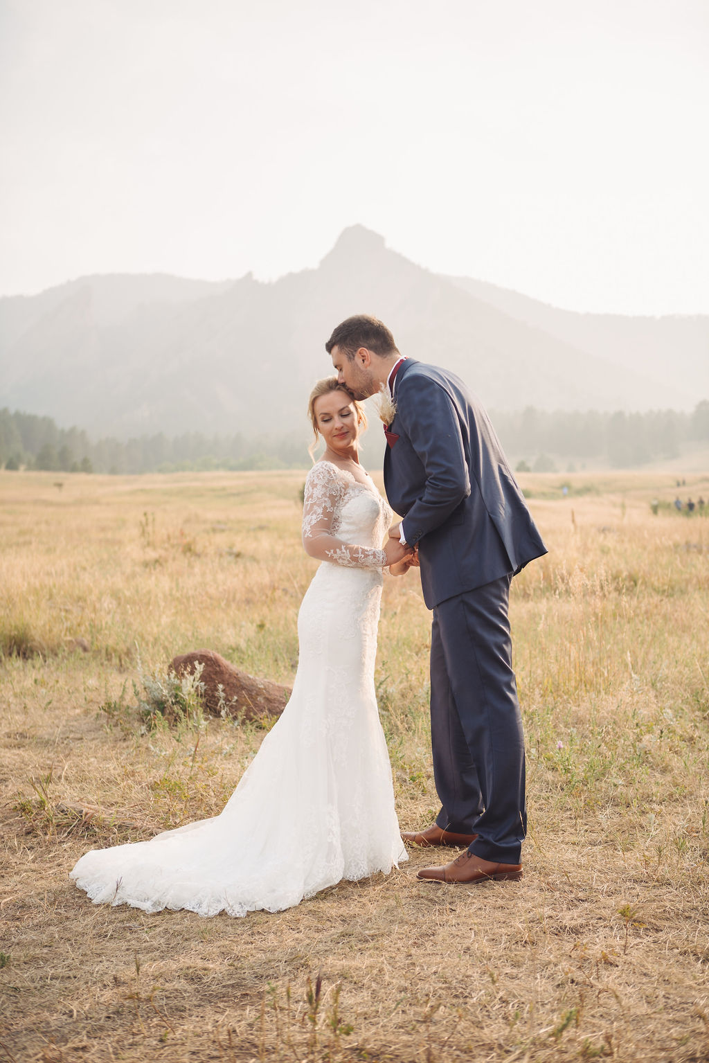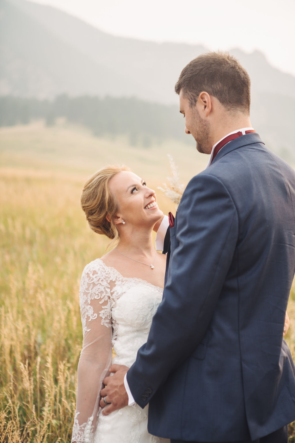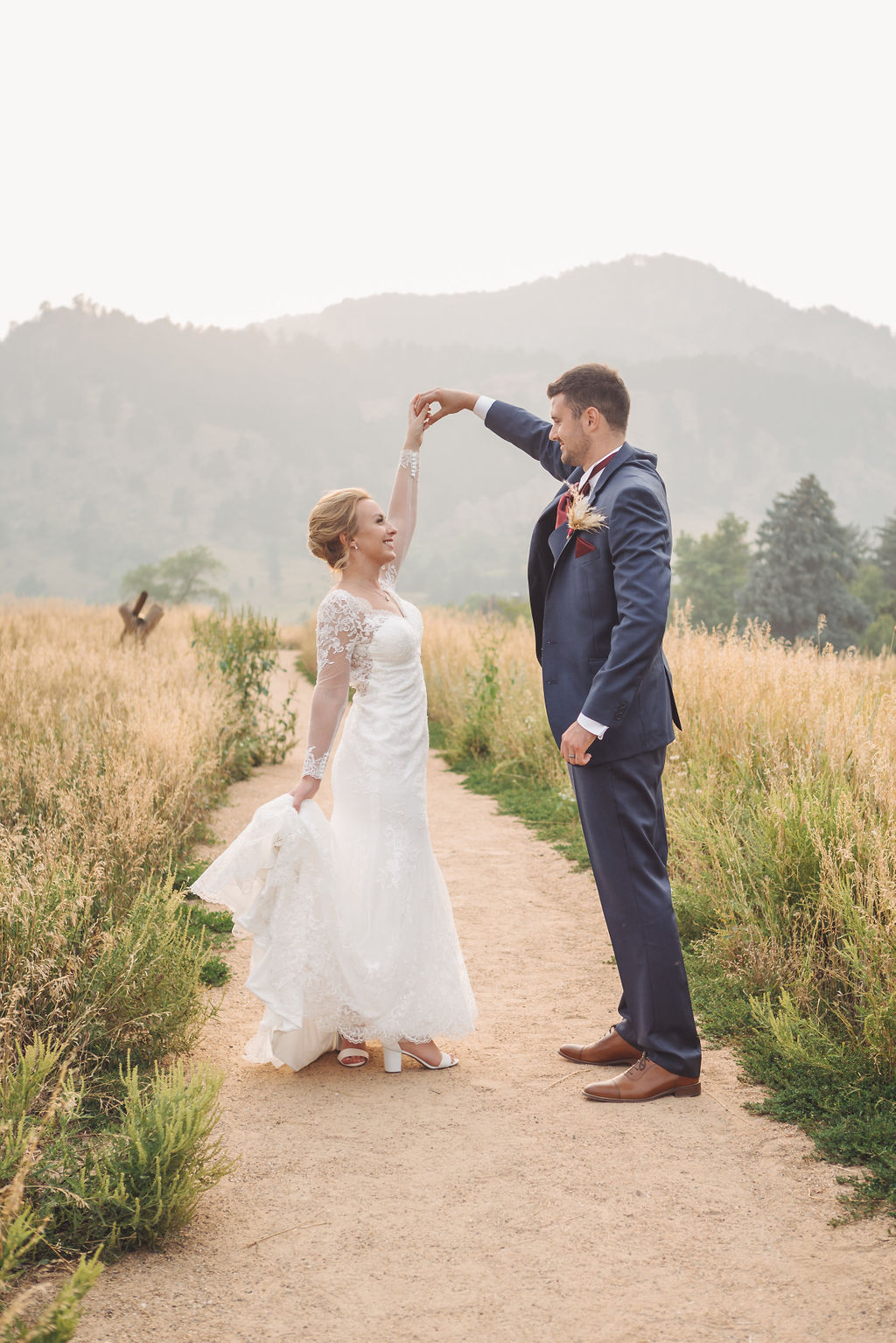 Laura & Jack's wedding in the Colorado foothills was pure magic — a rustic ranch celebration wrapped in golden light, open meadows, and the kind of mountain backdrop that makes Colorado one of the most beautiful places in the world to get married. With the Rocky Mountain peaks rising in the distance and tall grass swaying in the warm summer breeze, their day felt like something out of a film. A lace gown, a navy suit with burgundy details, a weathered wooden fence, and a vintage muscle car gave the day a character all its own — romantic, adventurous, and unmistakably personal. Captured through the lens of Palms Isles wedding photography, this Colorado ranch wedding gallery celebrates the beauty of love set against wide open skies and untouched nature.