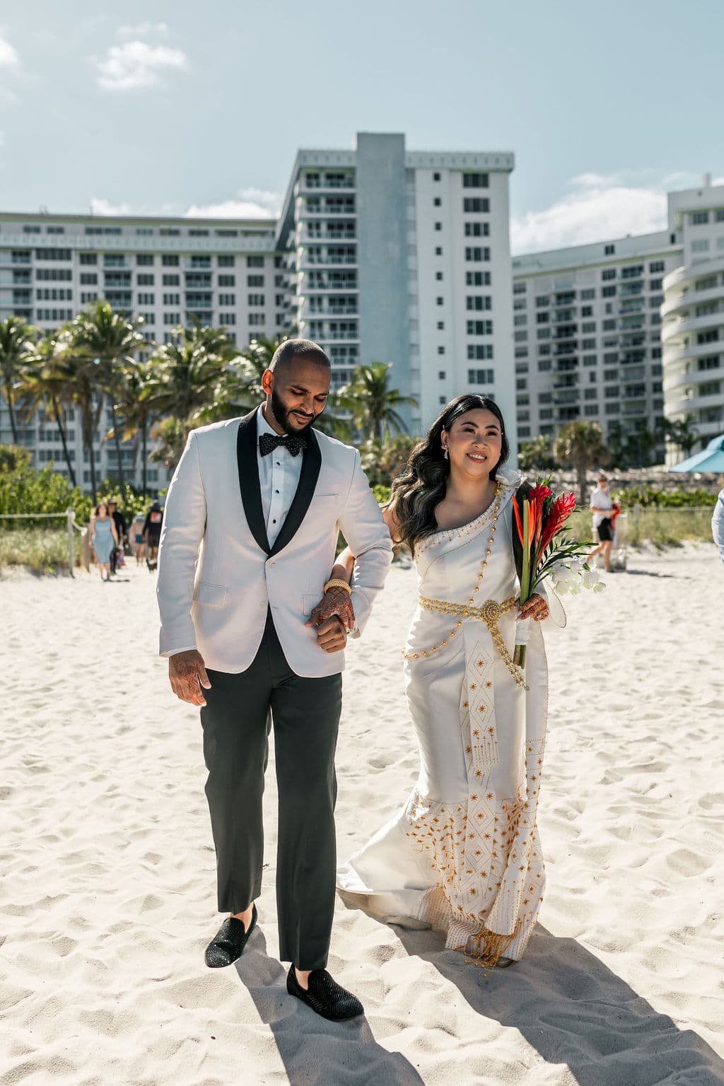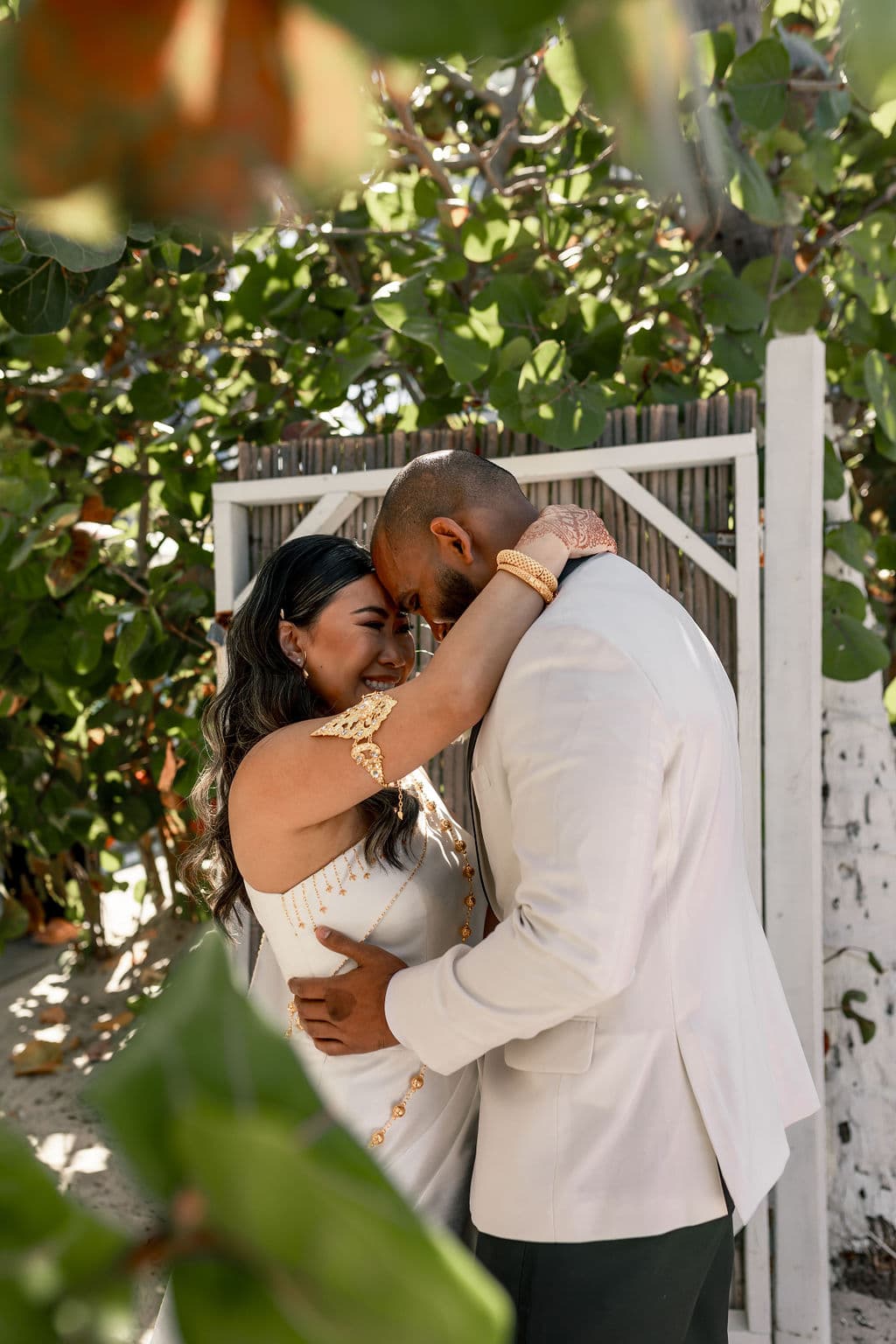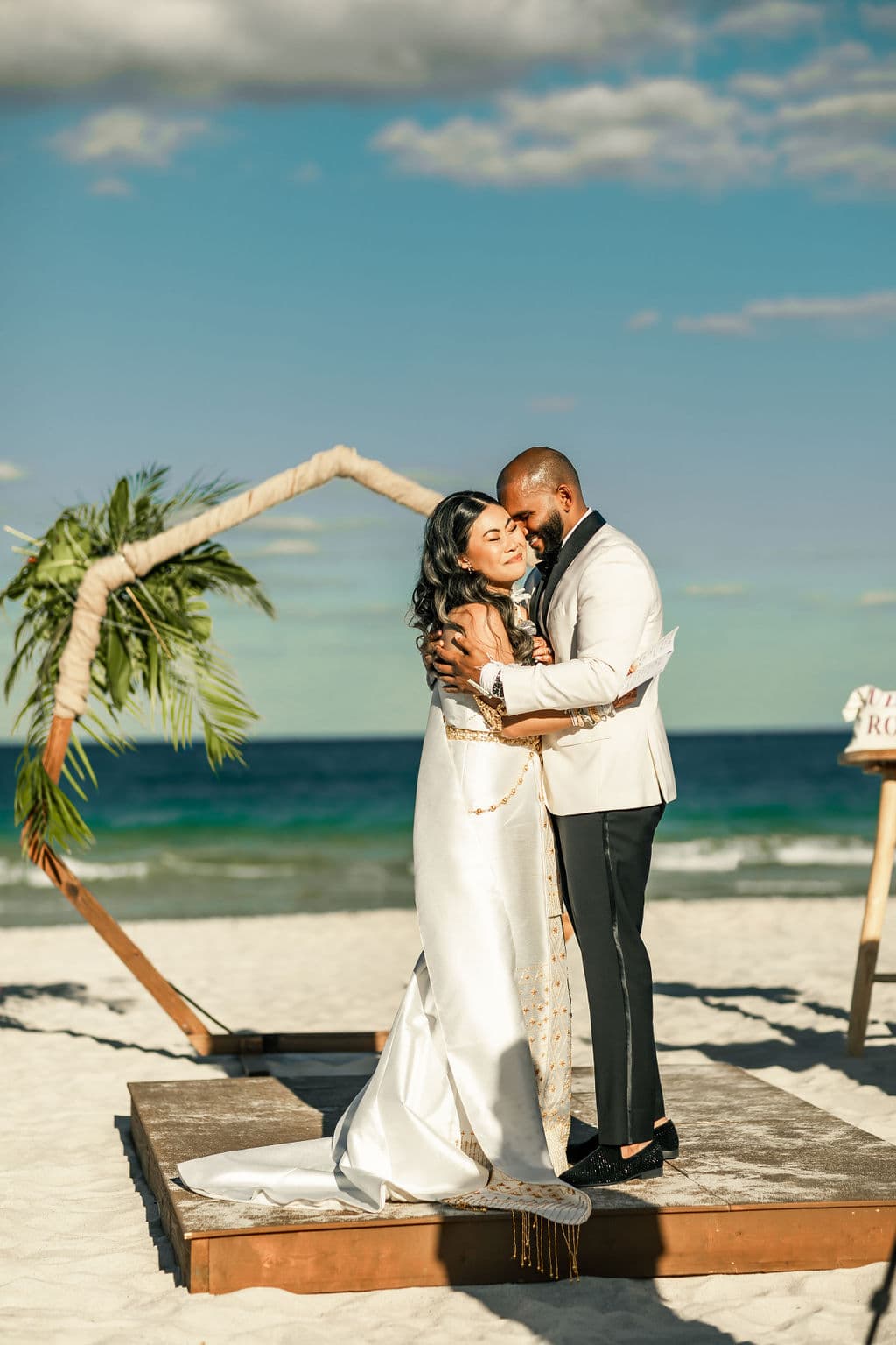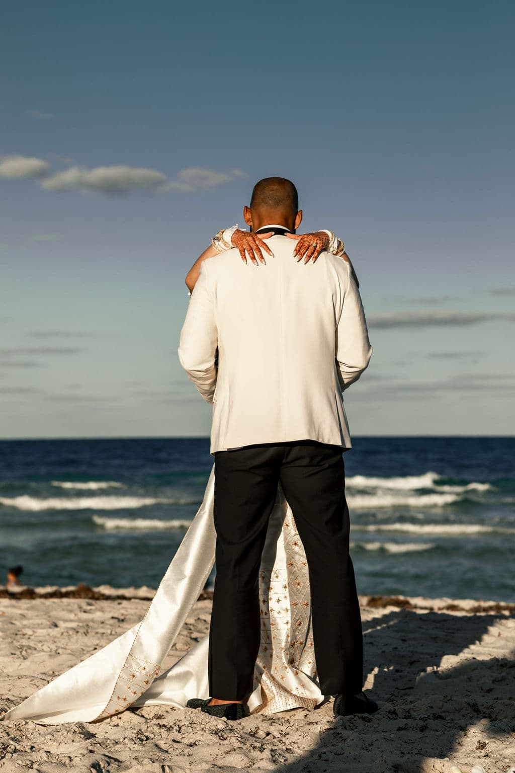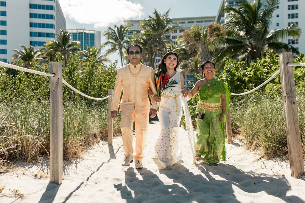 Naly & Vick's wedding photography on Miami's ocean shore is a deeply moving and visually stunning celebration of love, heritage, and tradition. The Atlantic as the ceremony backdrop, the sound of waves accompanying every sacred ritual, and the warm April light wrapping around two people honoring their roots while beginning their future together — every frame of their gallery carries a weight and beauty that is rare and completely captivating. Naly was radiant in a beautifully adorned white gown with traditional gold jewelry, while Vick stood beside her in a crisp white suit, both of them glowing with the kind of joy that comes from a ceremony that truly means something. The tears of happiness, the warm family embraces, the heartfelt smiles — all captured with honesty and care by Palms Isles Miami wedding photography, creating a gallery that tells their full love story with depth and meaning.