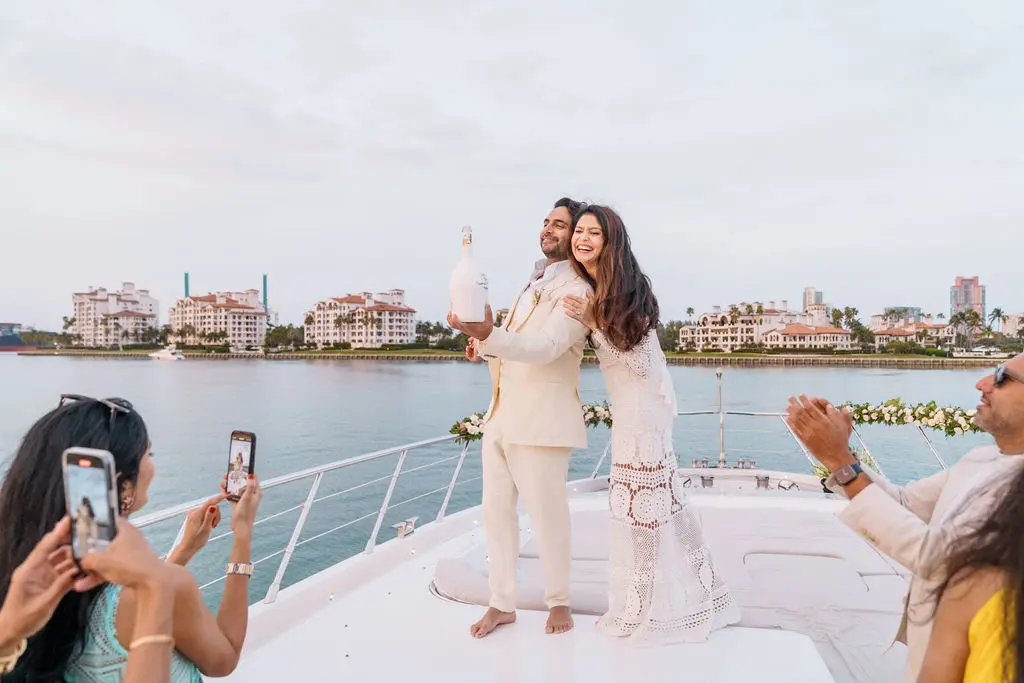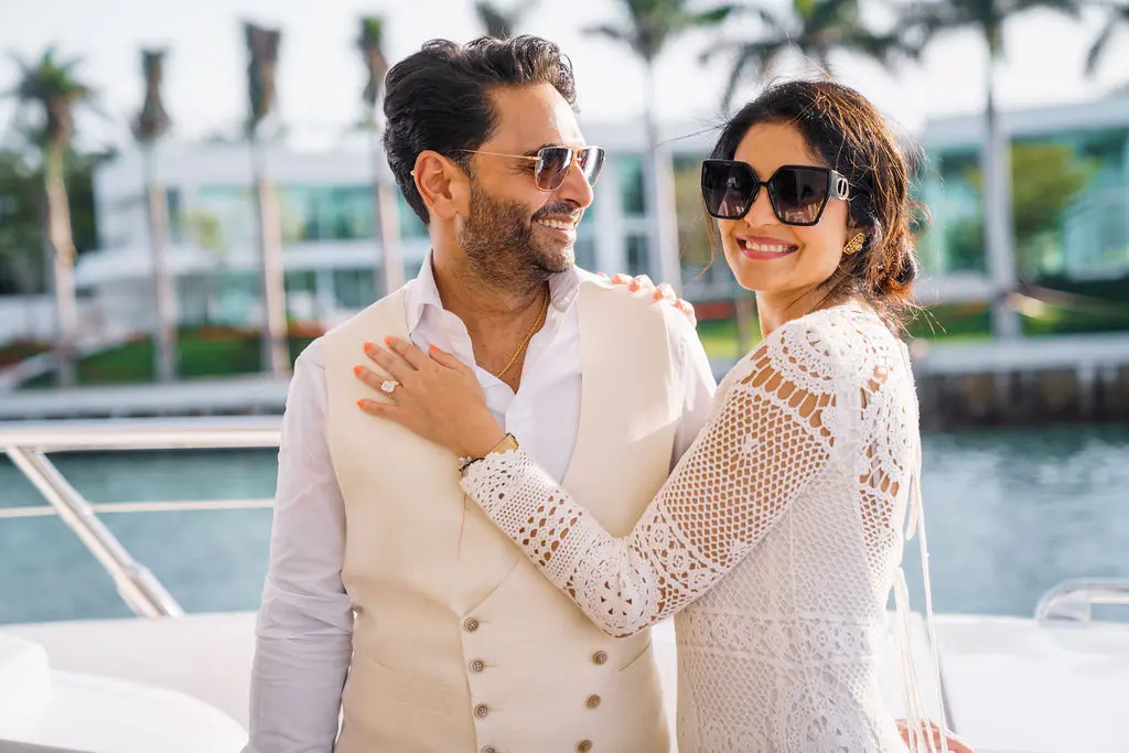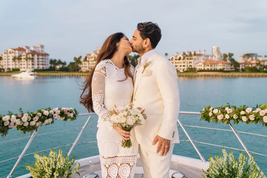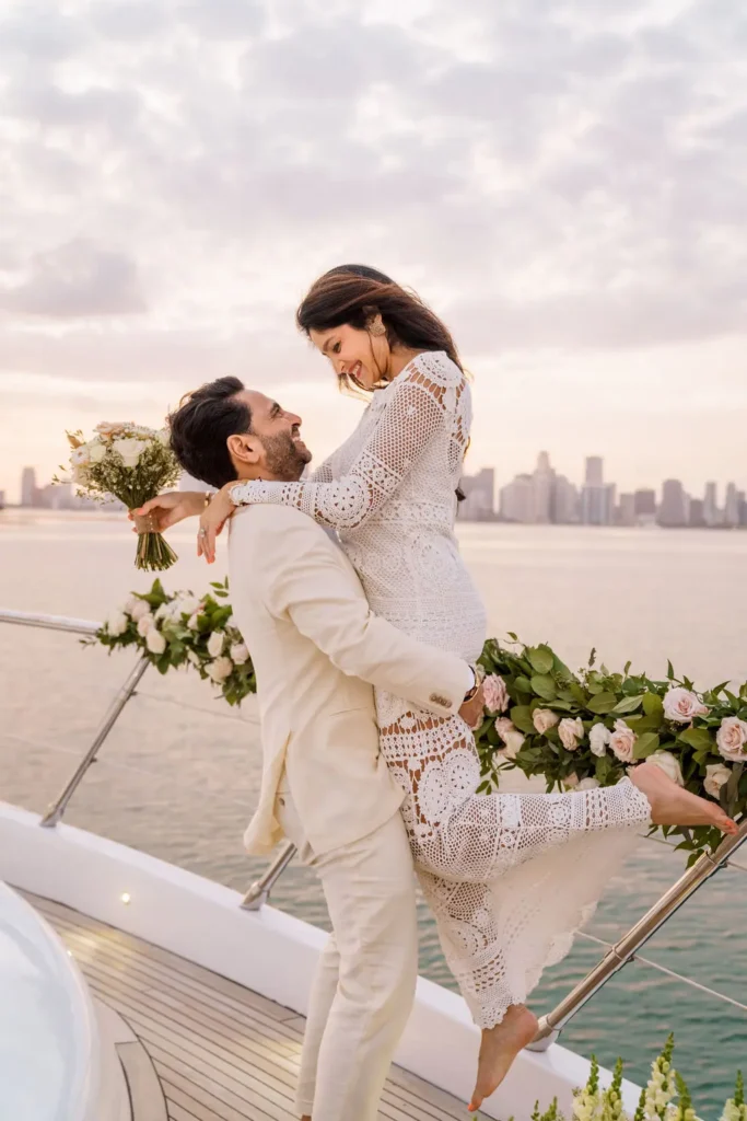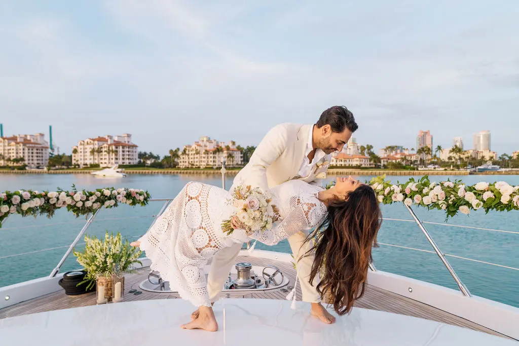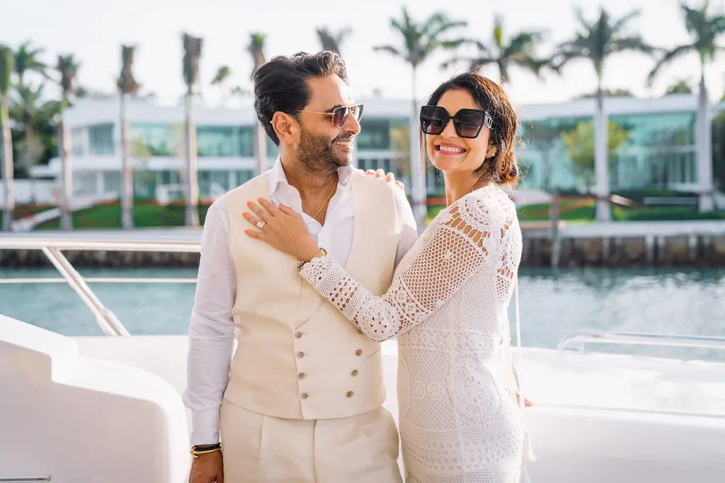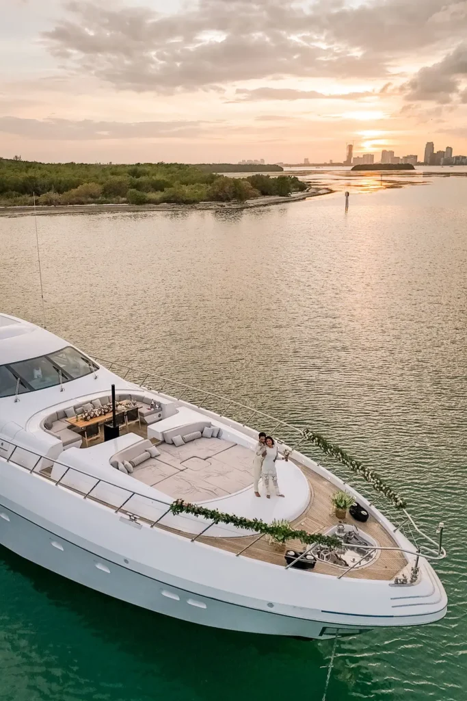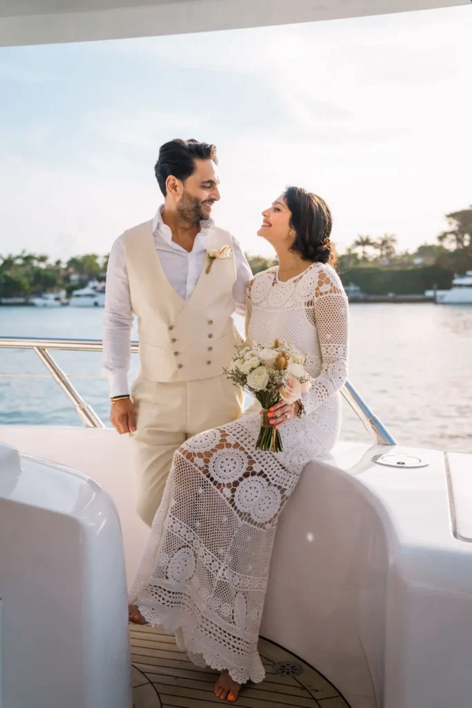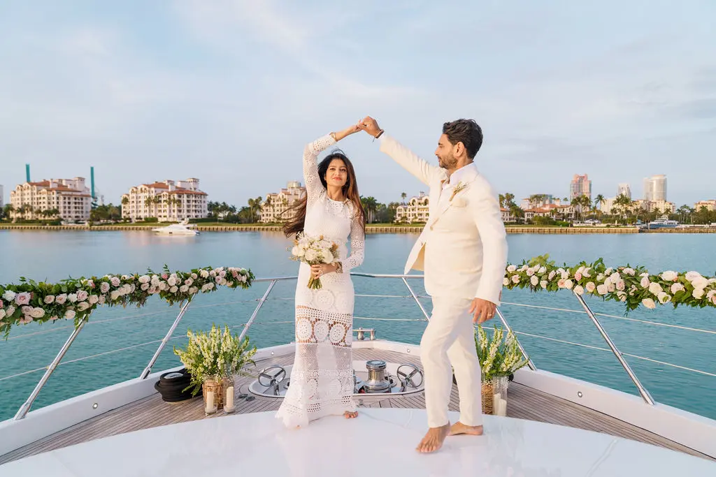 Shaheen & Rohan's yacht wedding photography in Miami is luxury lifestyle editorial at its absolute finest. A private superyacht adorned with lush garlands of blush roses and greenery along the railings, the Miami skyline glowing behind them as the sun melted into Biscayne Bay — this gallery is unlike anything else in our portfolio. Shaheen wore a stunning boho crochet long-sleeve gown, Rohan in a crisp cream suit, both barefoot on the teak deck as the warm golden light wrapped around every frame. The aerial drone shot of the yacht alone — surrounded by turquoise water with the entire Miami skyline silhouetted in the sunset — is a photograph that belongs in a magazine. Captured by Palms Isles Miami wedding photography, this gallery is bold, cinematic, and completely unforgettable.