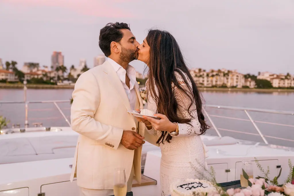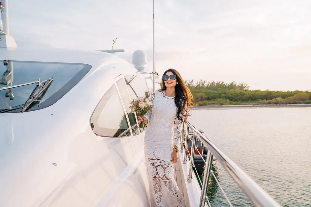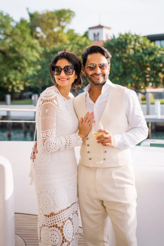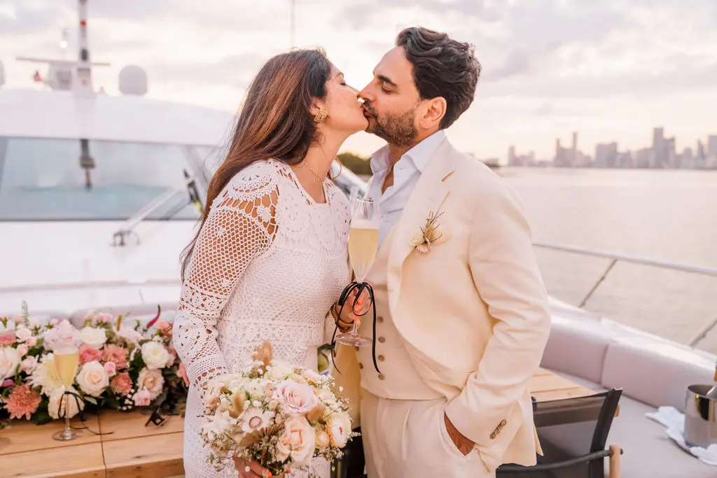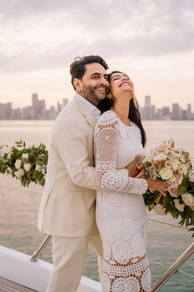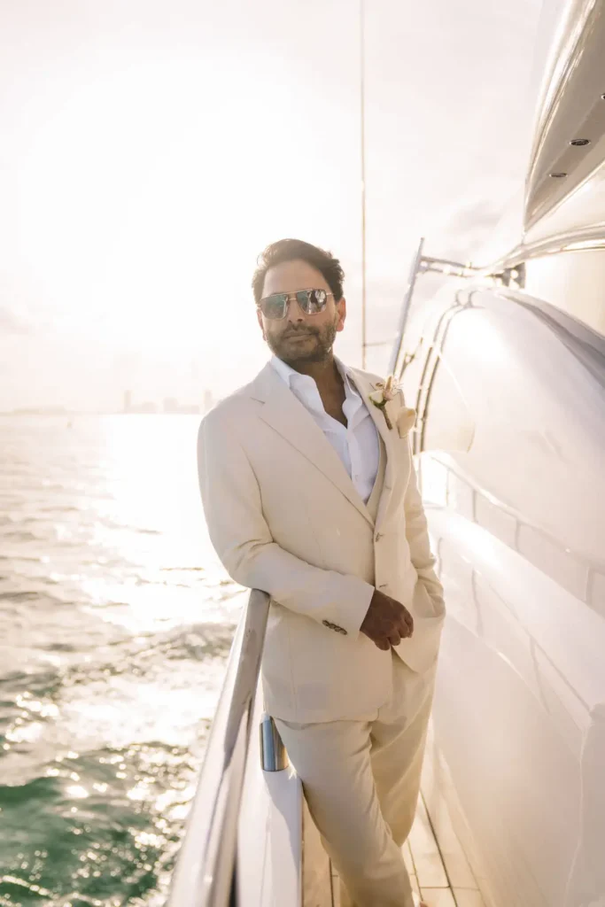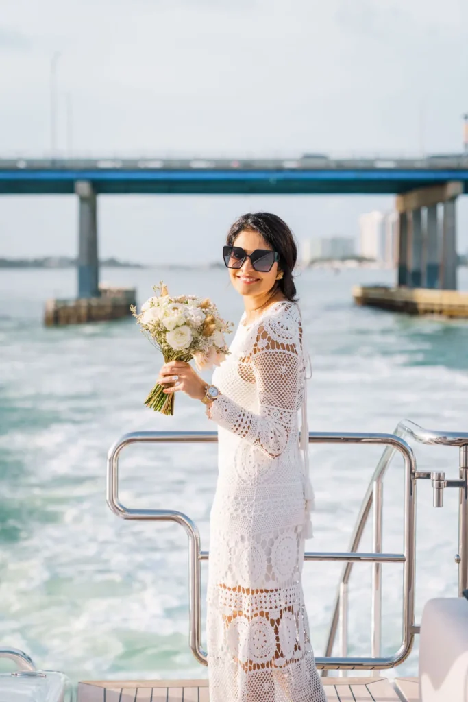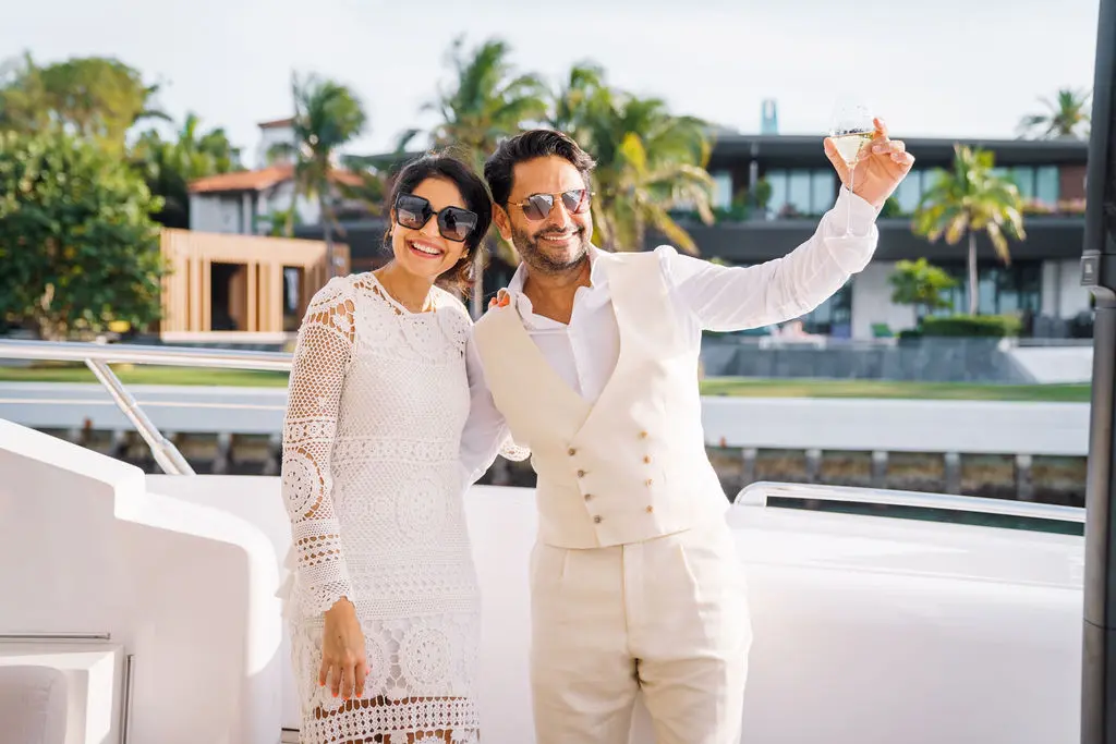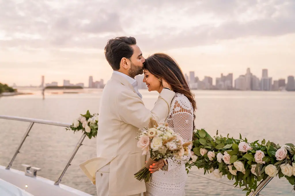 Shaheen & Rohan's yacht wedding photography in Miami is luxury lifestyle editorial at its absolute finest. A private superyacht adorned with lush garlands of blush roses and greenery along the railings, the Miami skyline glowing behind them as the sun melted into Biscayne Bay — this gallery is unlike anything else in our portfolio. Shaheen wore a stunning boho crochet long-sleeve gown, Rohan in a crisp cream suit, both barefoot on the teak deck as the warm golden light wrapped around every frame. The aerial drone shot of the yacht alone — surrounded by turquoise water with the entire Miami skyline silhouetted in the sunset — is a photograph that belongs in a magazine. Captured by Palms Isles Miami wedding photography, this gallery is bold, cinematic, and completely unforgettable.