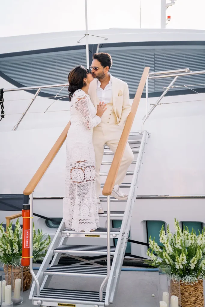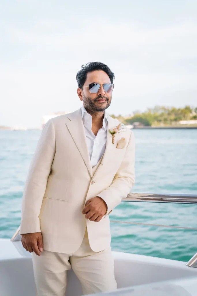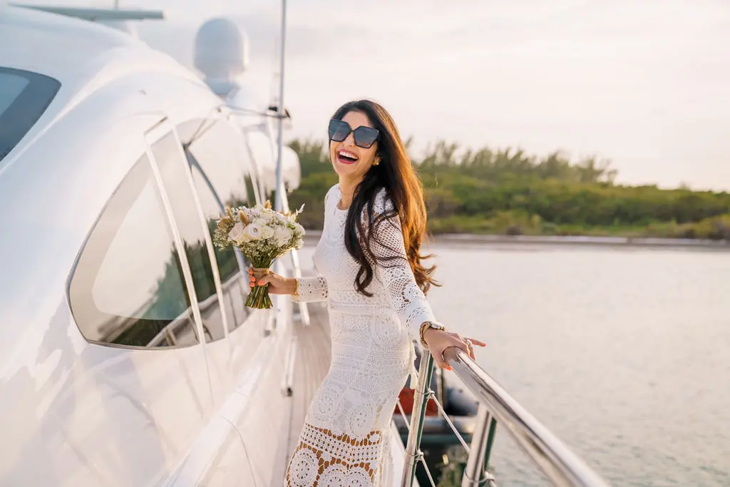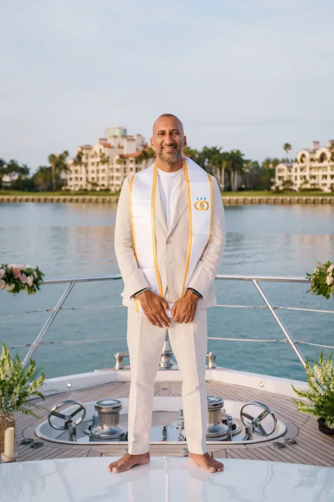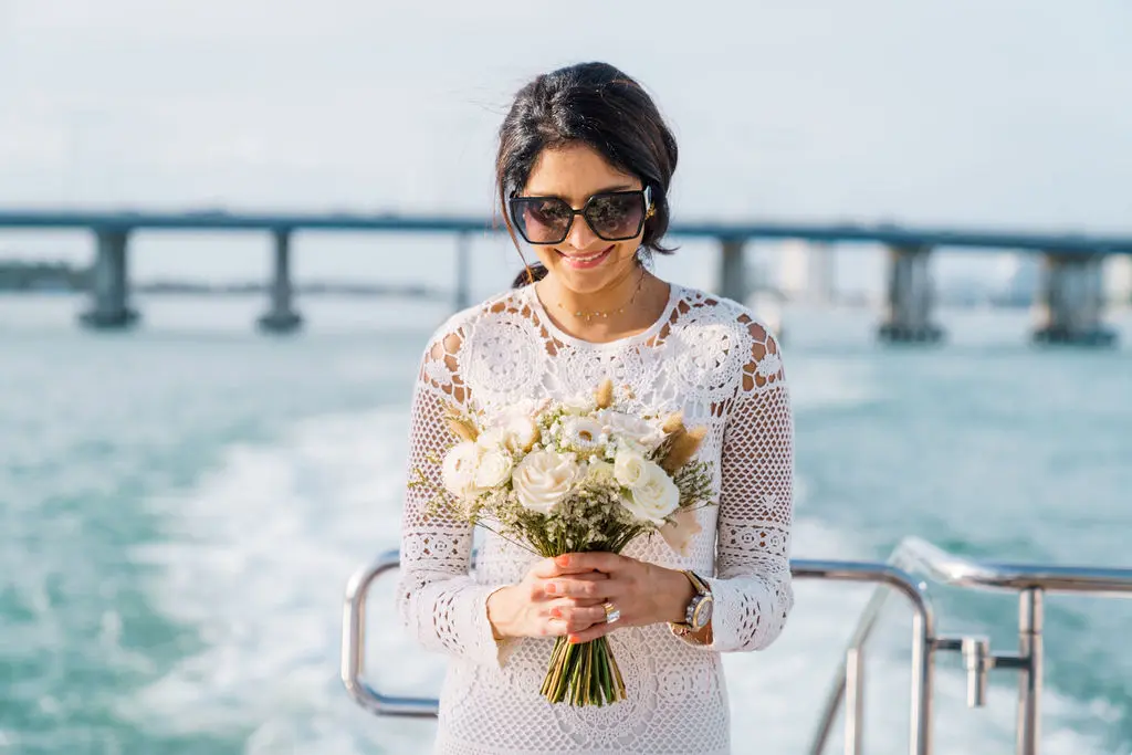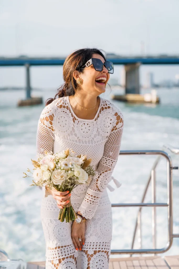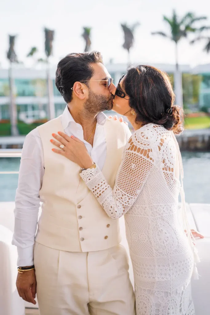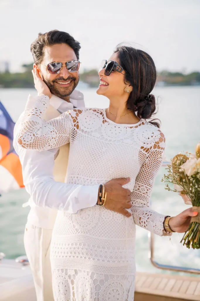 Shaheen & Rohan's yacht wedding photography in Miami is luxury lifestyle editorial at its absolute finest. A private superyacht adorned with lush garlands of blush roses and greenery along the railings, the Miami skyline glowing behind them as the sun melted into Biscayne Bay — this gallery is unlike anything else in our portfolio. Shaheen wore a stunning boho crochet long-sleeve gown, Rohan in a crisp cream suit, both barefoot on the teak deck as the warm golden light wrapped around every frame. The aerial drone shot of the yacht alone — surrounded by turquoise water with the entire Miami skyline silhouetted in the sunset — is a photograph that belongs in a magazine. Captured by Palms Isles Miami wedding photography, this gallery is bold, cinematic, and completely unforgettable.