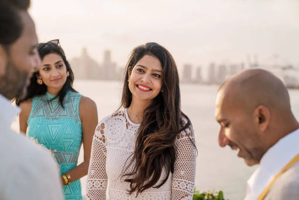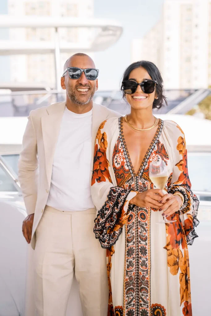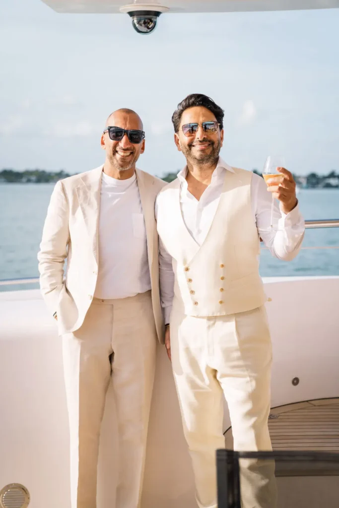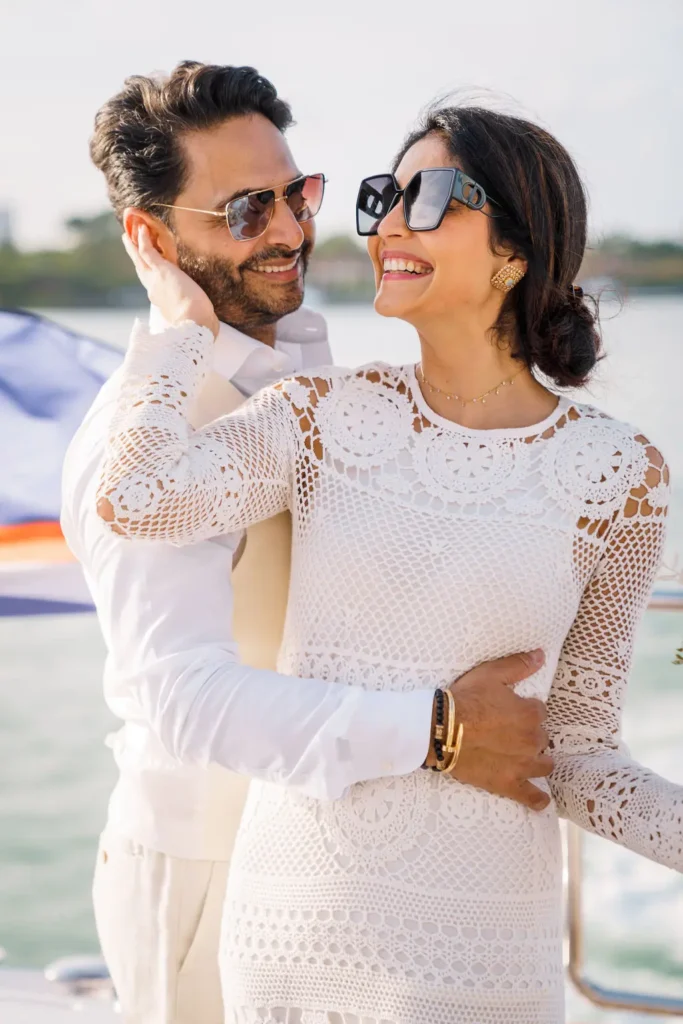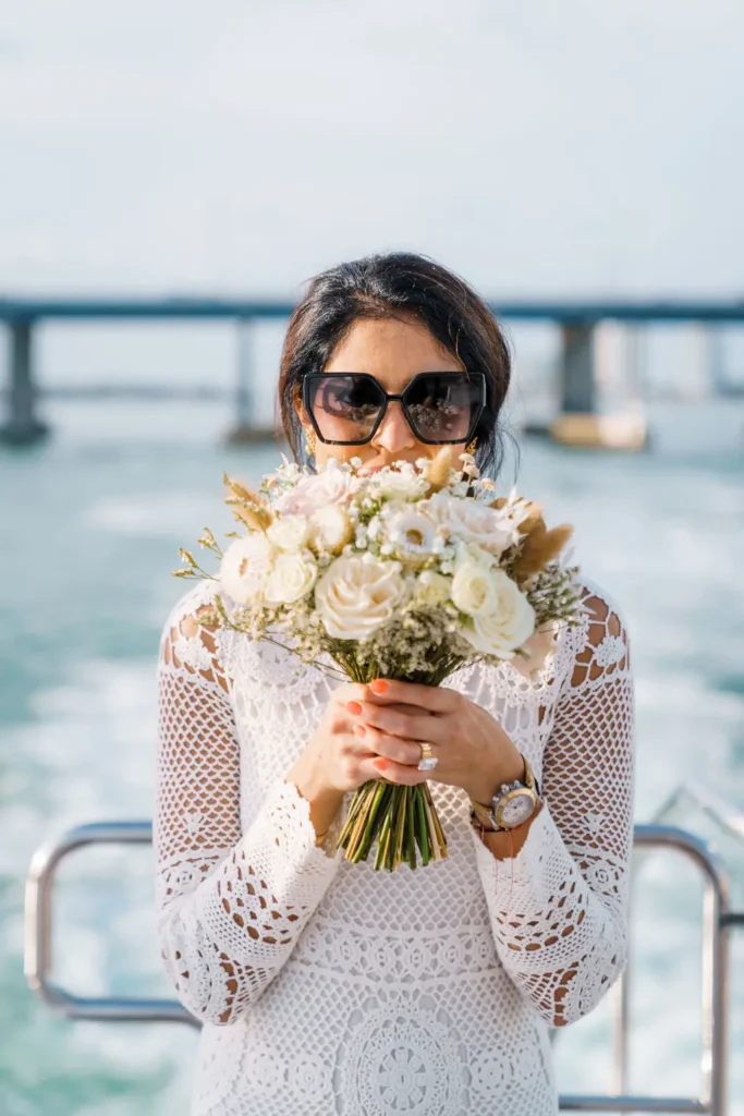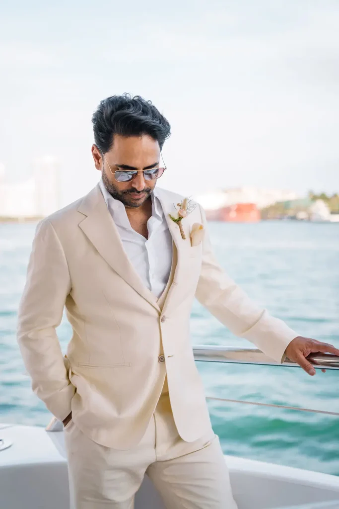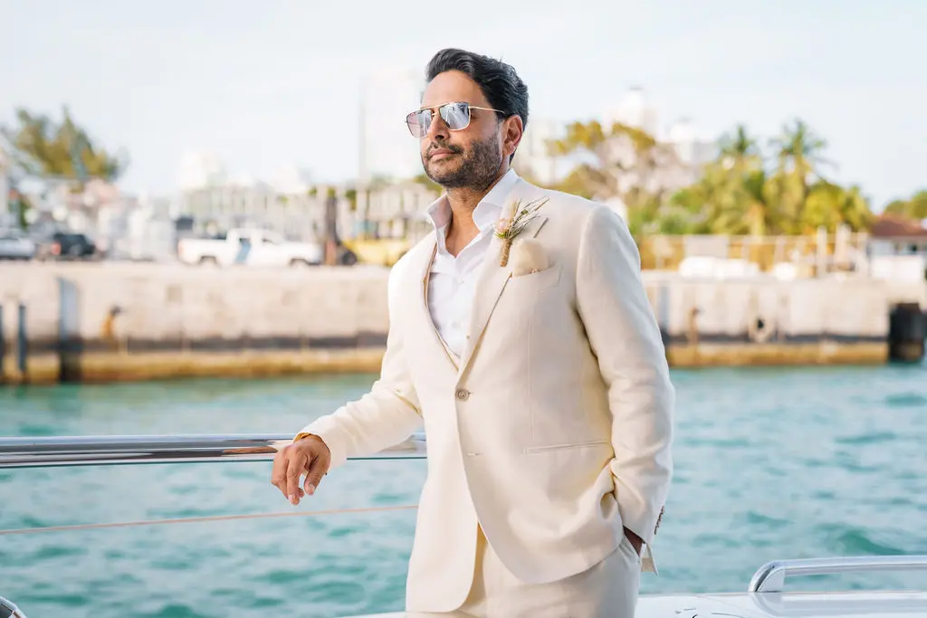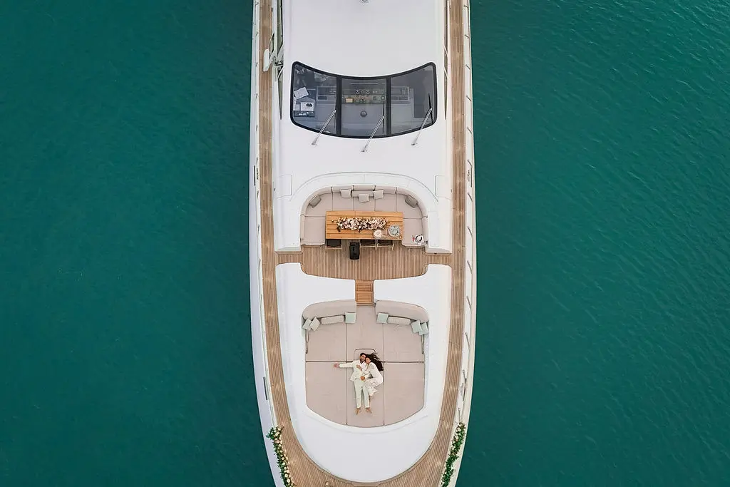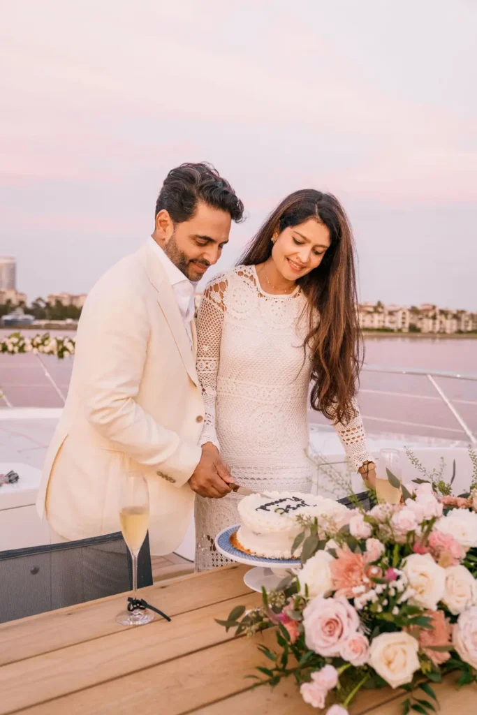 Shaheen & Rohan's yacht wedding photography in Miami is luxury lifestyle editorial at its absolute finest. A private superyacht adorned with lush garlands of blush roses and greenery along the railings, the Miami skyline glowing behind them as the sun melted into Biscayne Bay — this gallery is unlike anything else in our portfolio. Shaheen wore a stunning boho crochet long-sleeve gown, Rohan in a crisp cream suit, both barefoot on the teak deck as the warm golden light wrapped around every frame. The aerial drone shot of the yacht alone — surrounded by turquoise water with the entire Miami skyline silhouetted in the sunset — is a photograph that belongs in a magazine. Captured by Palms Isles Miami wedding photography, this gallery is bold, cinematic, and completely unforgettable.