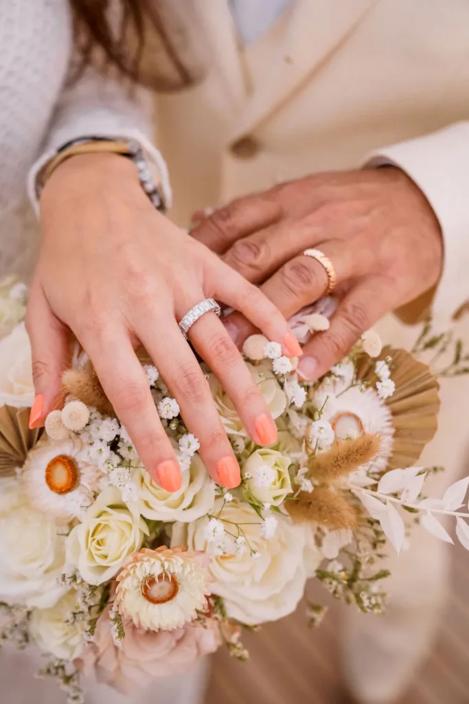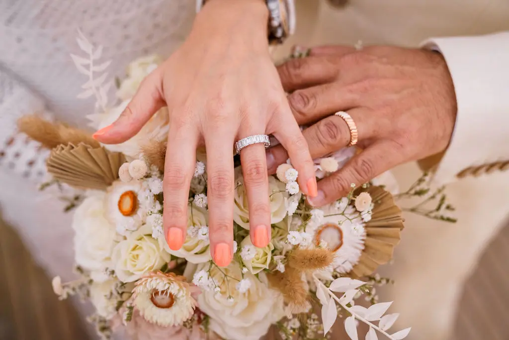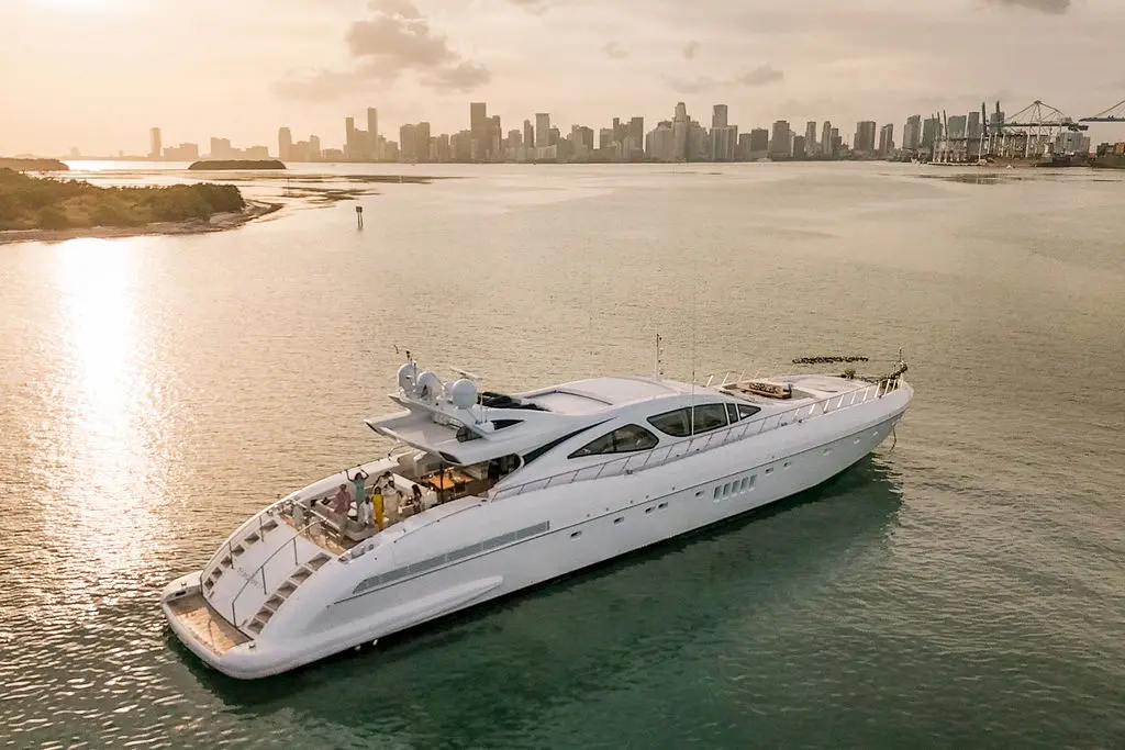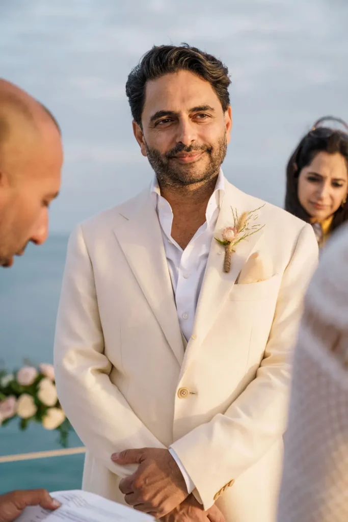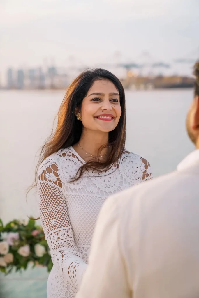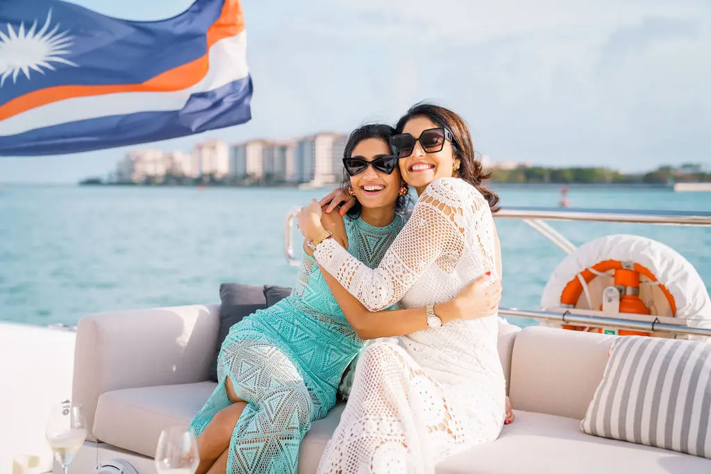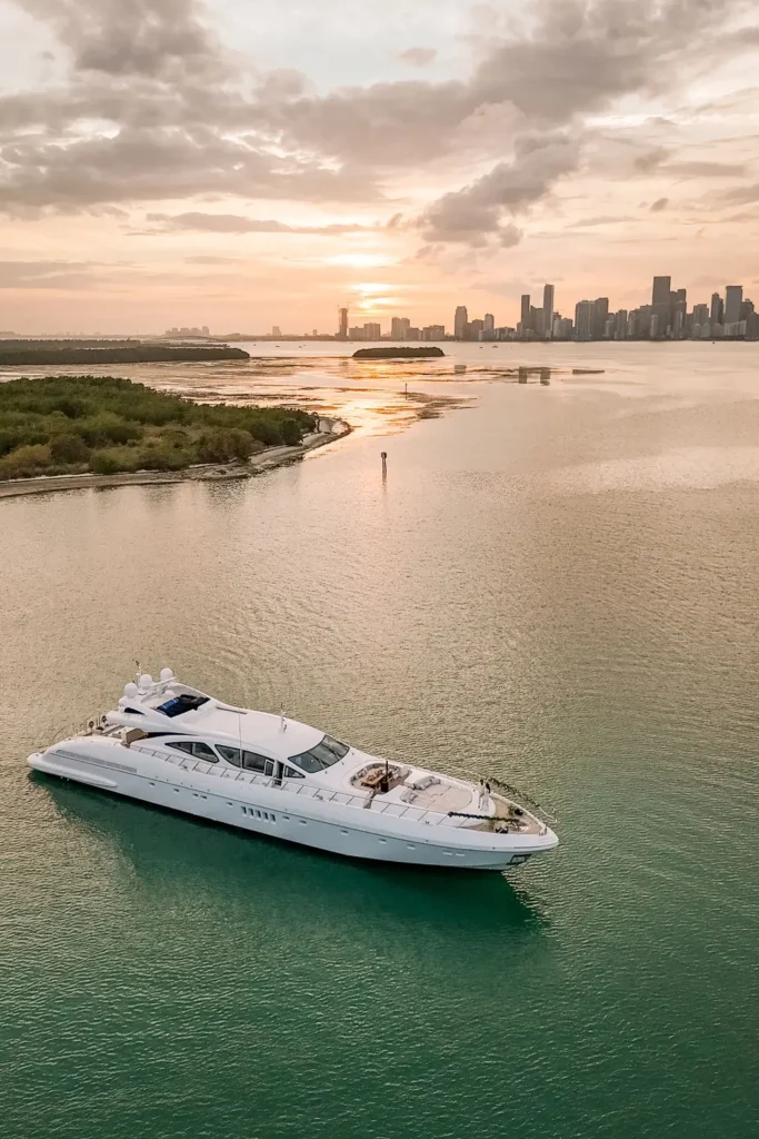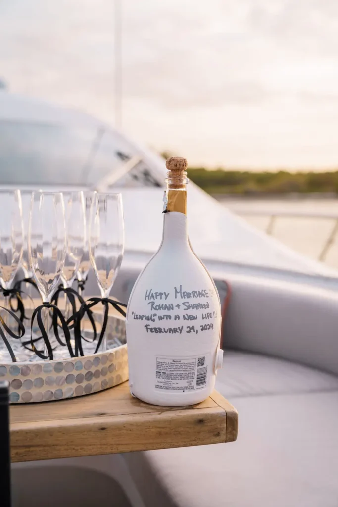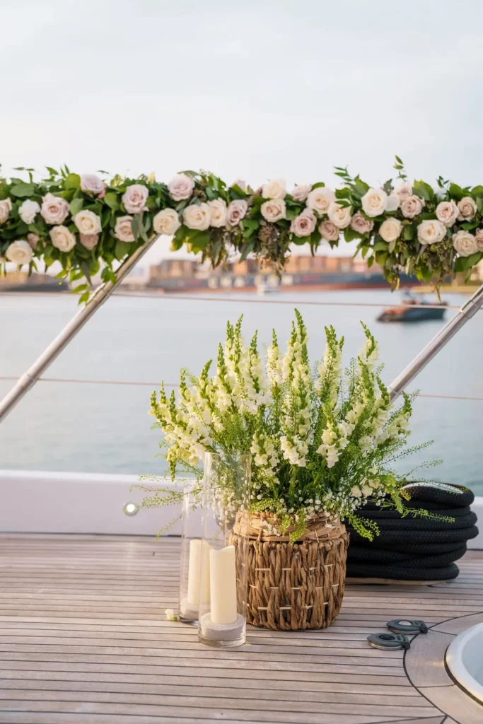 Shaheen & Rohan's yacht wedding photography in Miami is luxury lifestyle editorial at its absolute finest. A private superyacht adorned with lush garlands of blush roses and greenery along the railings, the Miami skyline glowing behind them as the sun melted into Biscayne Bay — this gallery is unlike anything else in our portfolio. Shaheen wore a stunning boho crochet long-sleeve gown, Rohan in a crisp cream suit, both barefoot on the teak deck as the warm golden light wrapped around every frame. The aerial drone shot of the yacht alone — surrounded by turquoise water with the entire Miami skyline silhouetted in the sunset — is a photograph that belongs in a magazine. Captured by Palms Isles Miami wedding photography, this gallery is bold, cinematic, and completely unforgettable.