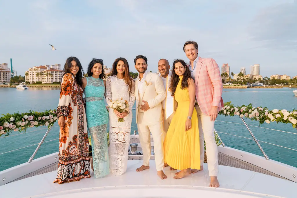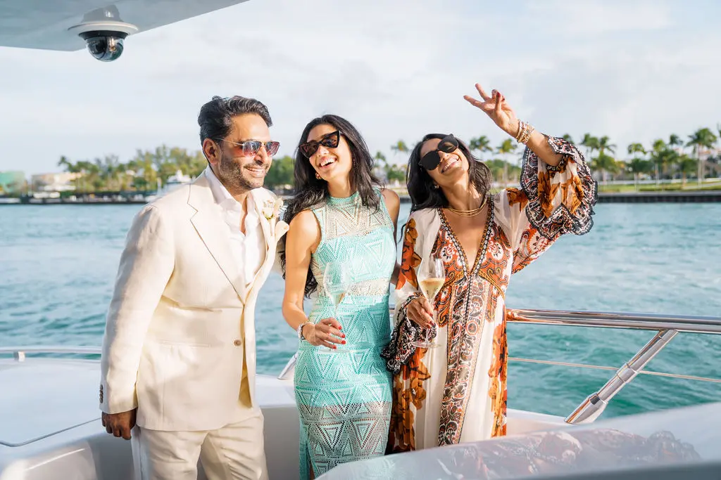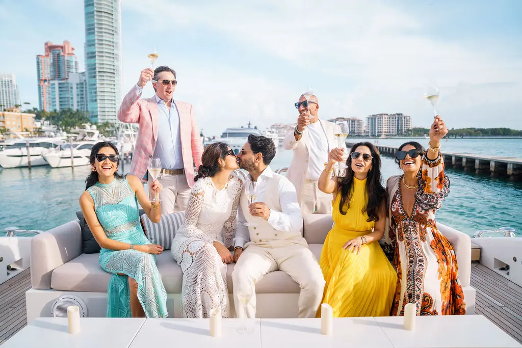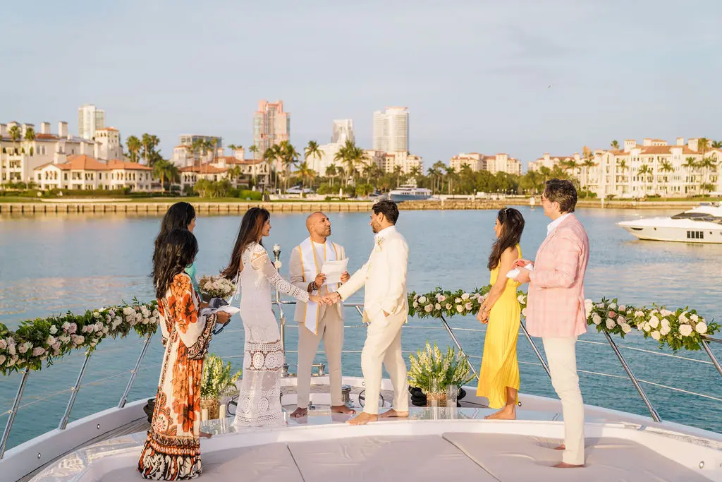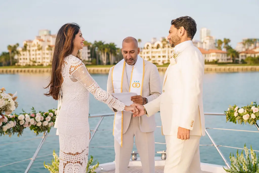 A Miami yacht wedding is one of the most exclusive and visually stunning celebrations you can plan in South Florida — and Shaheen & Rohan's day delivered on every promise that setting makes. The intimate ceremony on deck, surrounded only by their closest loved ones and the endless open water, had a quiet elegance that the sweeping aerial images capture beautifully. The floral-draped railings, the pastel Miami sky, the turquoise bay reflecting the city lights as evening fell — every detail was thoughtfully chosen and perfectly preserved on camera. This is what happens when luxury meets love on the water. If you're planning a yacht wedding or any luxury celebration in Miami and looking for a Miami wedding photographer who creates editorial, high-end galleries worthy of the most exclusive venues, Palms Isles photographs weddings across Miami, South Beach, and all of South Florida.