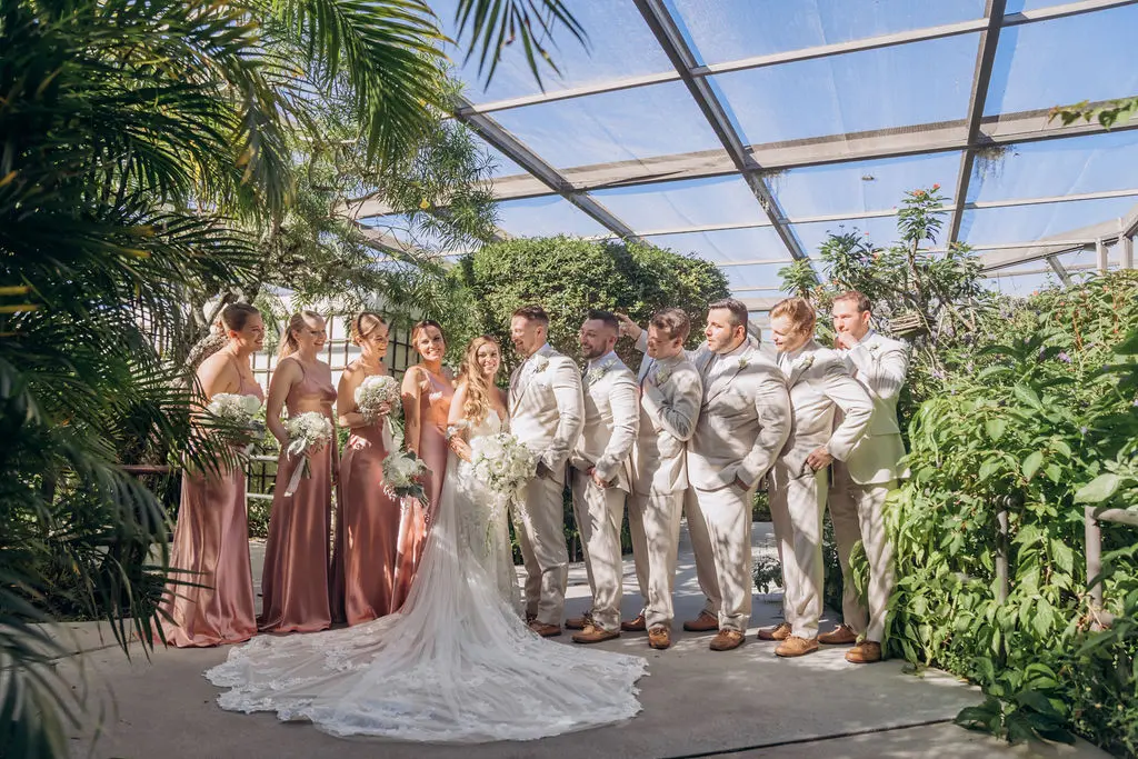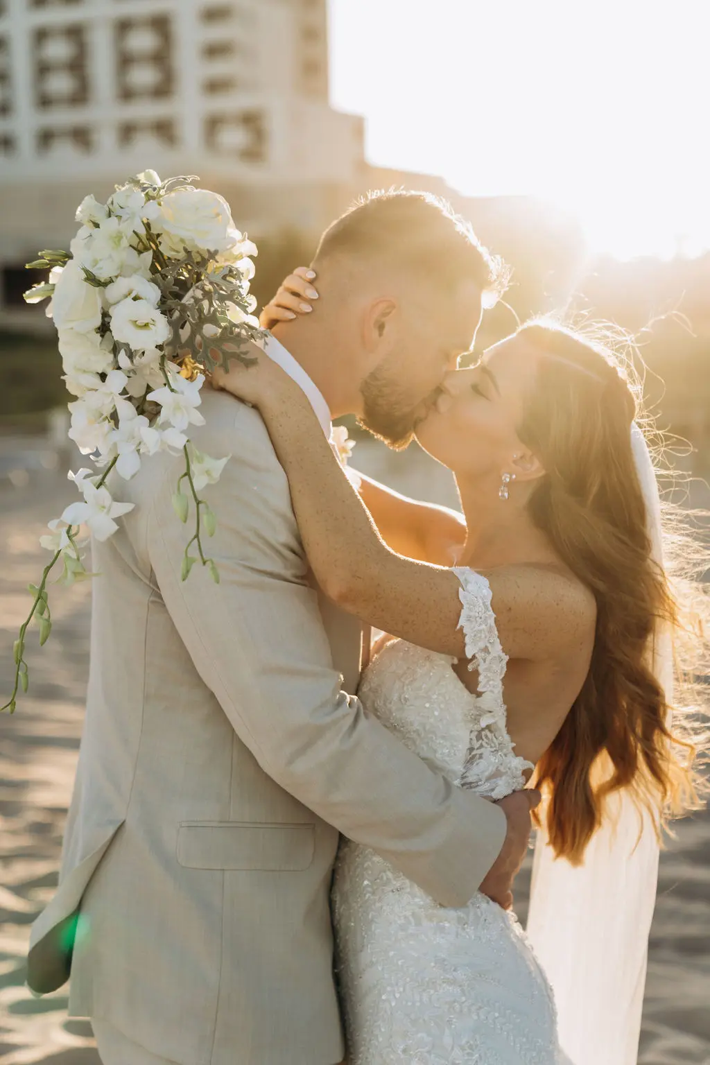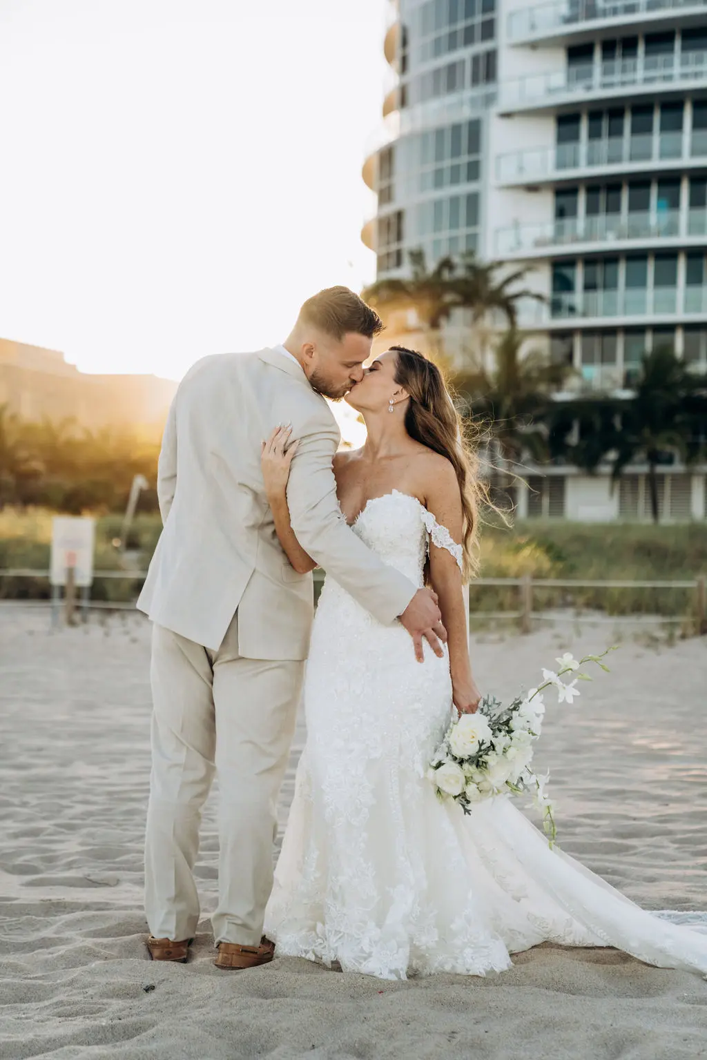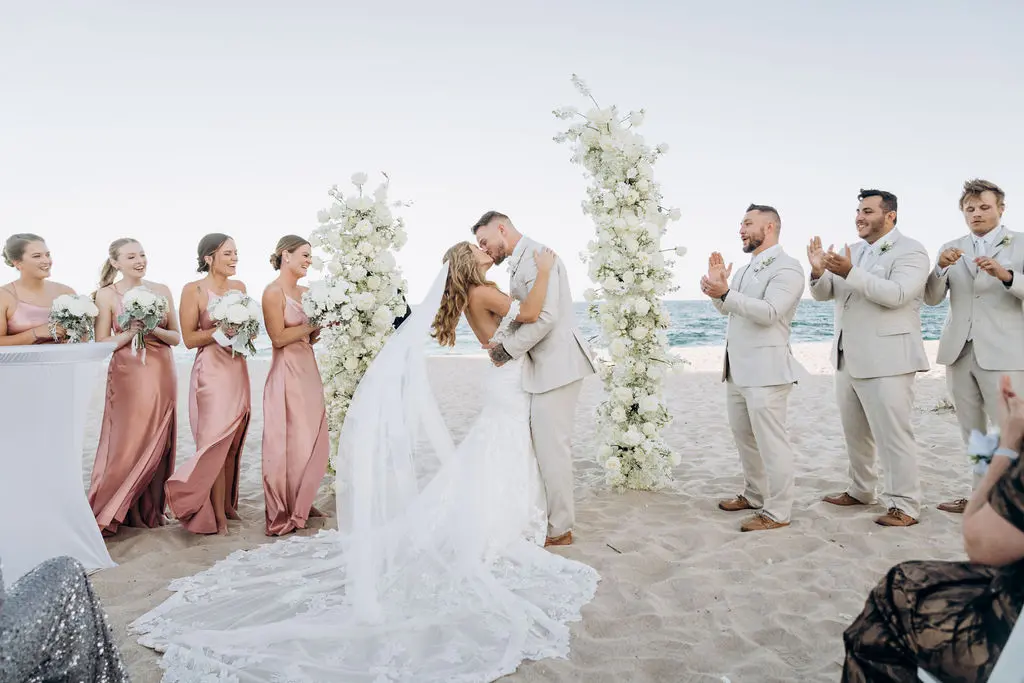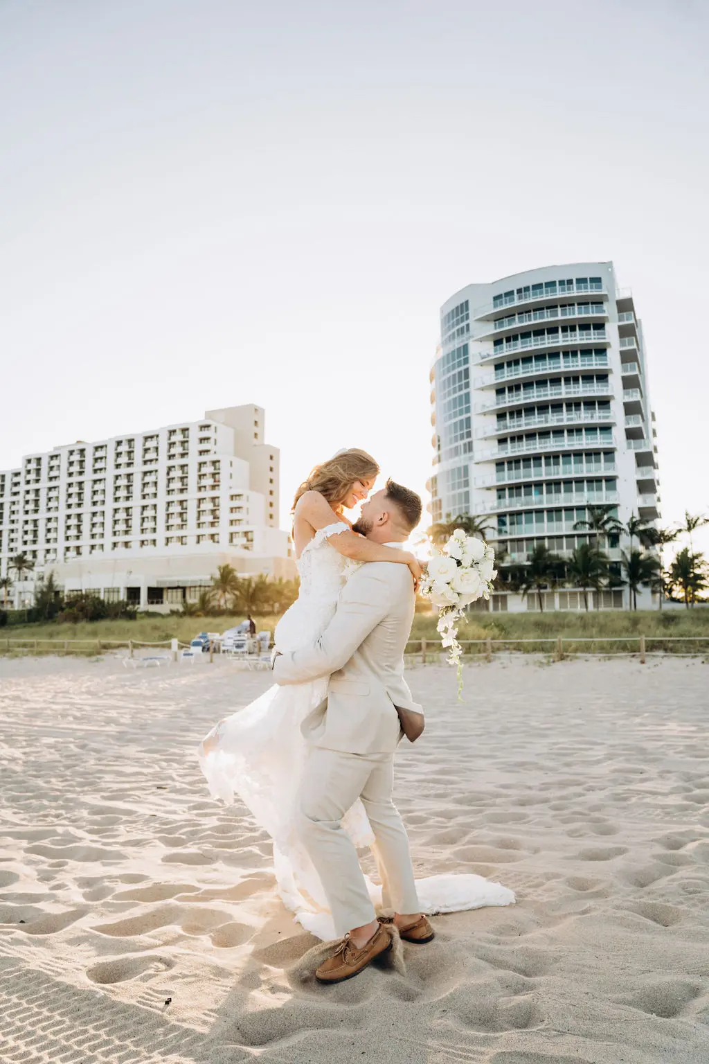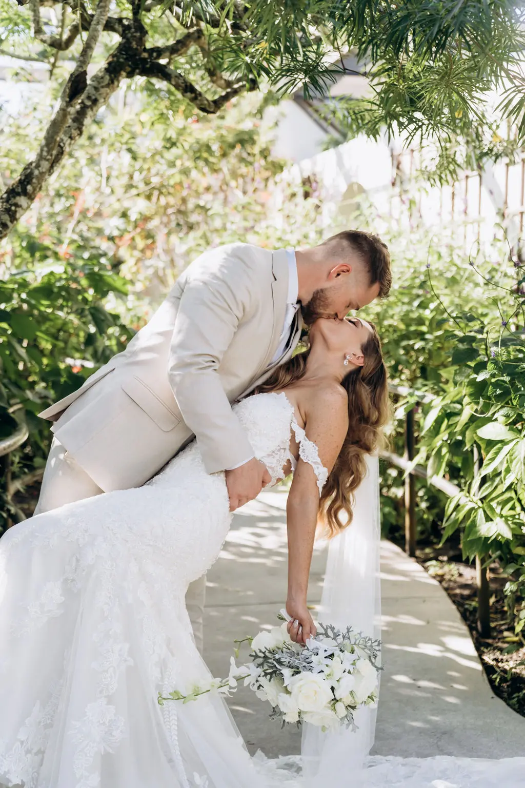 Shannon & Quinlan's wedding photography at B Ocean Resort Fort Lauderdale is intimate, romantic, and completely stunning. The bride arrived in an intricate lace mermaid gown with a cathedral train and a dramatic floating veil — and the dip kiss portrait inside the resort's lush garden conservatory, veil billowing ethereally to the side, is one of those images you simply cannot look away from. The groom stood perfectly complemented in a warm sand-toned suit, and together they radiated the kind of effortless chemistry that makes every frame feel alive. From the flower-adorned beachfront ceremony with the gentle sound of Fort Lauderdale's ocean in the background, to the elegant indoor reception with a stunning tiered cake and a dance floor full of joy — every moment was captured with care. Captured by Palms Isles Fort Lauderdale wedding photography, this B Ocean Resort gallery is warm, beautiful, and deeply personal.