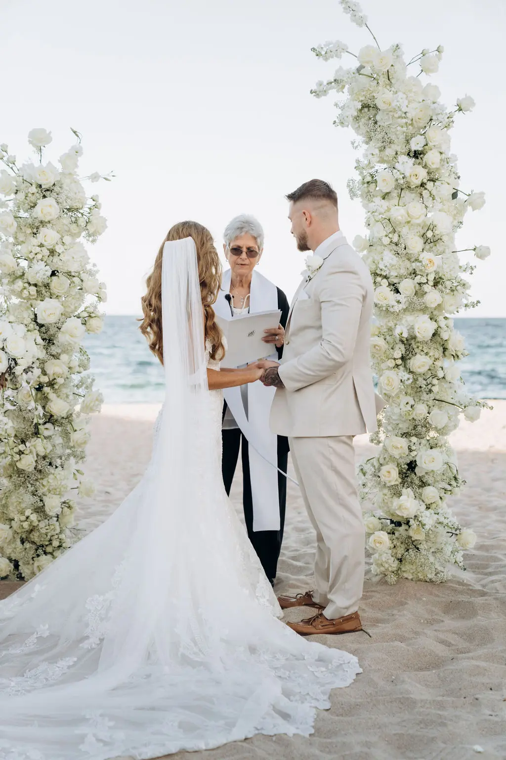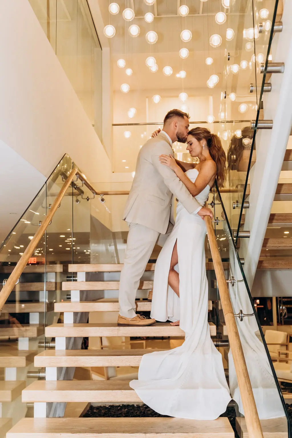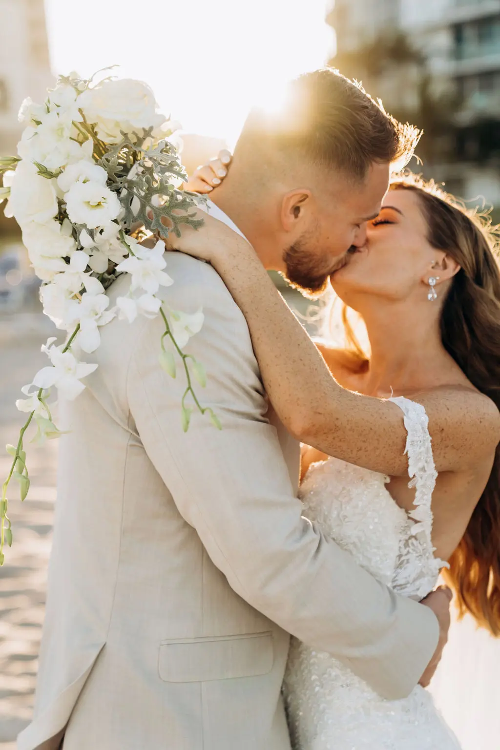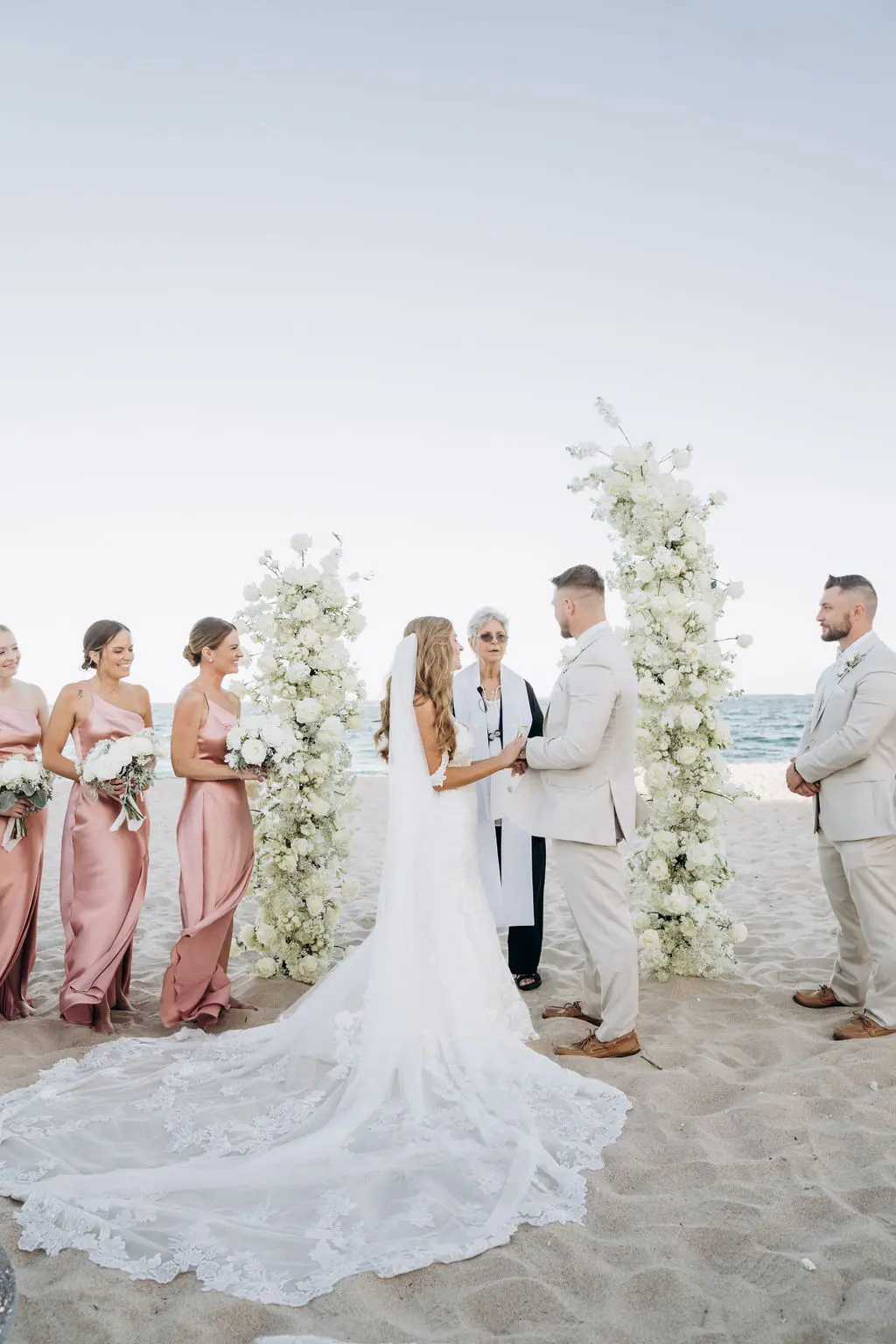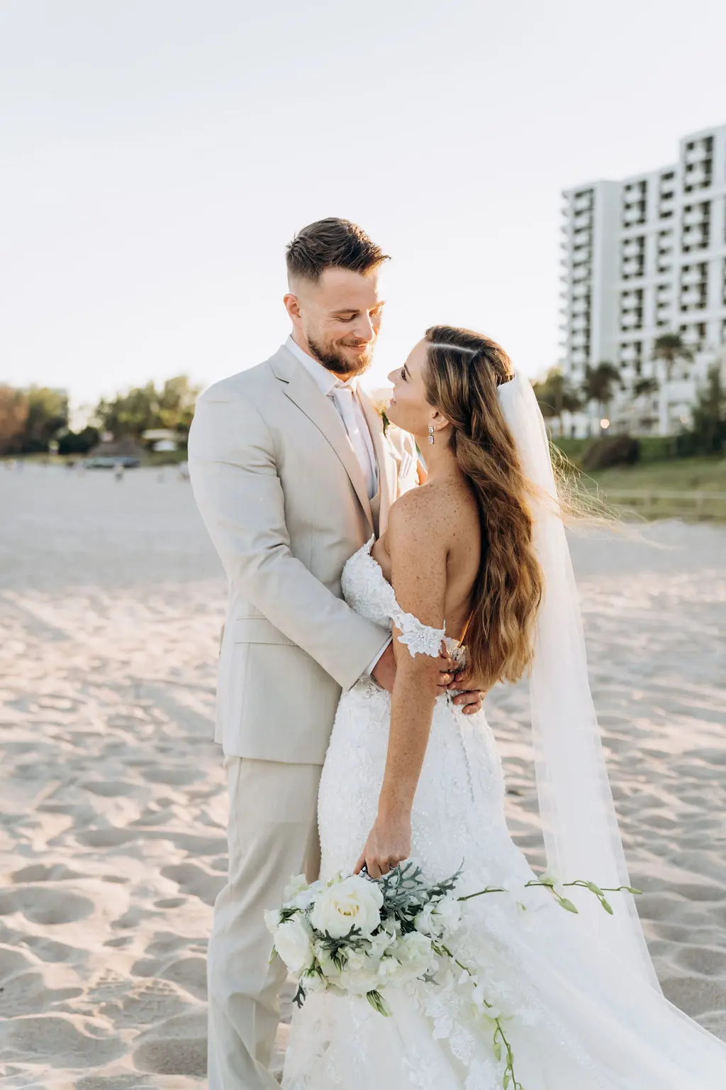 Shannon & Quinlan's wedding photography at B Ocean Resort Fort Lauderdale is intimate, romantic, and completely stunning. The bride arrived in an intricate lace mermaid gown with a cathedral train and a dramatic floating veil — and the dip kiss portrait inside the resort's lush garden conservatory, veil billowing ethereally to the side, is one of those images you simply cannot look away from. The groom stood perfectly complemented in a warm sand-toned suit, and together they radiated the kind of effortless chemistry that makes every frame feel alive. From the flower-adorned beachfront ceremony with the gentle sound of Fort Lauderdale's ocean in the background, to the elegant indoor reception with a stunning tiered cake and a dance floor full of joy — every moment was captured with care. Captured by Palms Isles Fort Lauderdale wedding photography, this B Ocean Resort gallery is warm, beautiful, and deeply personal.