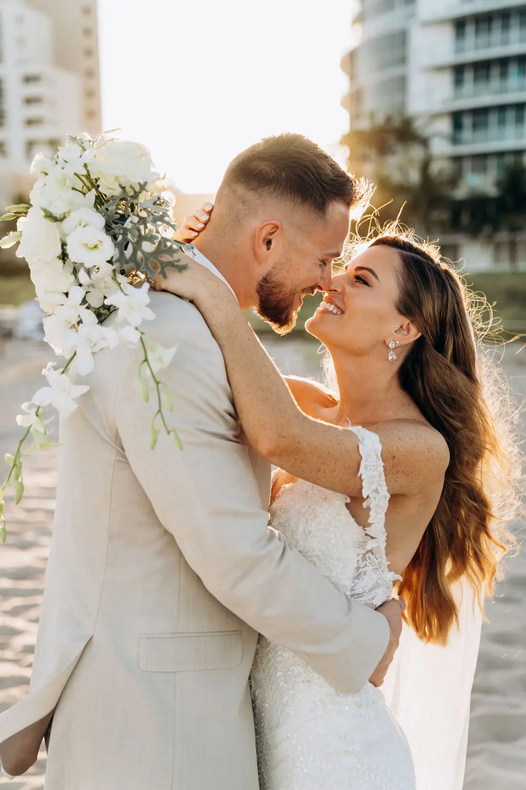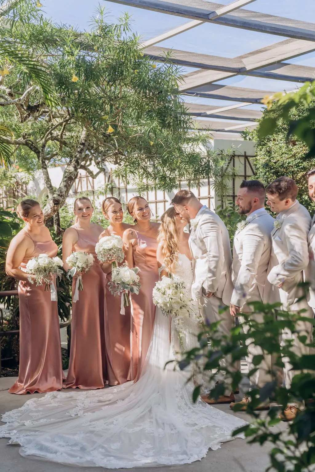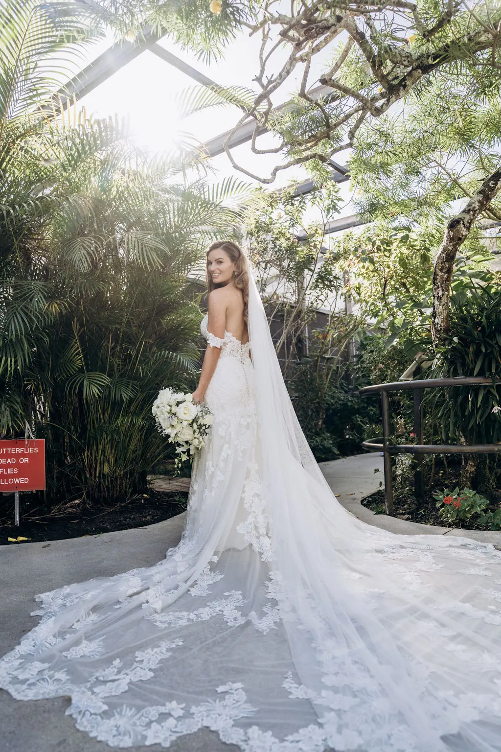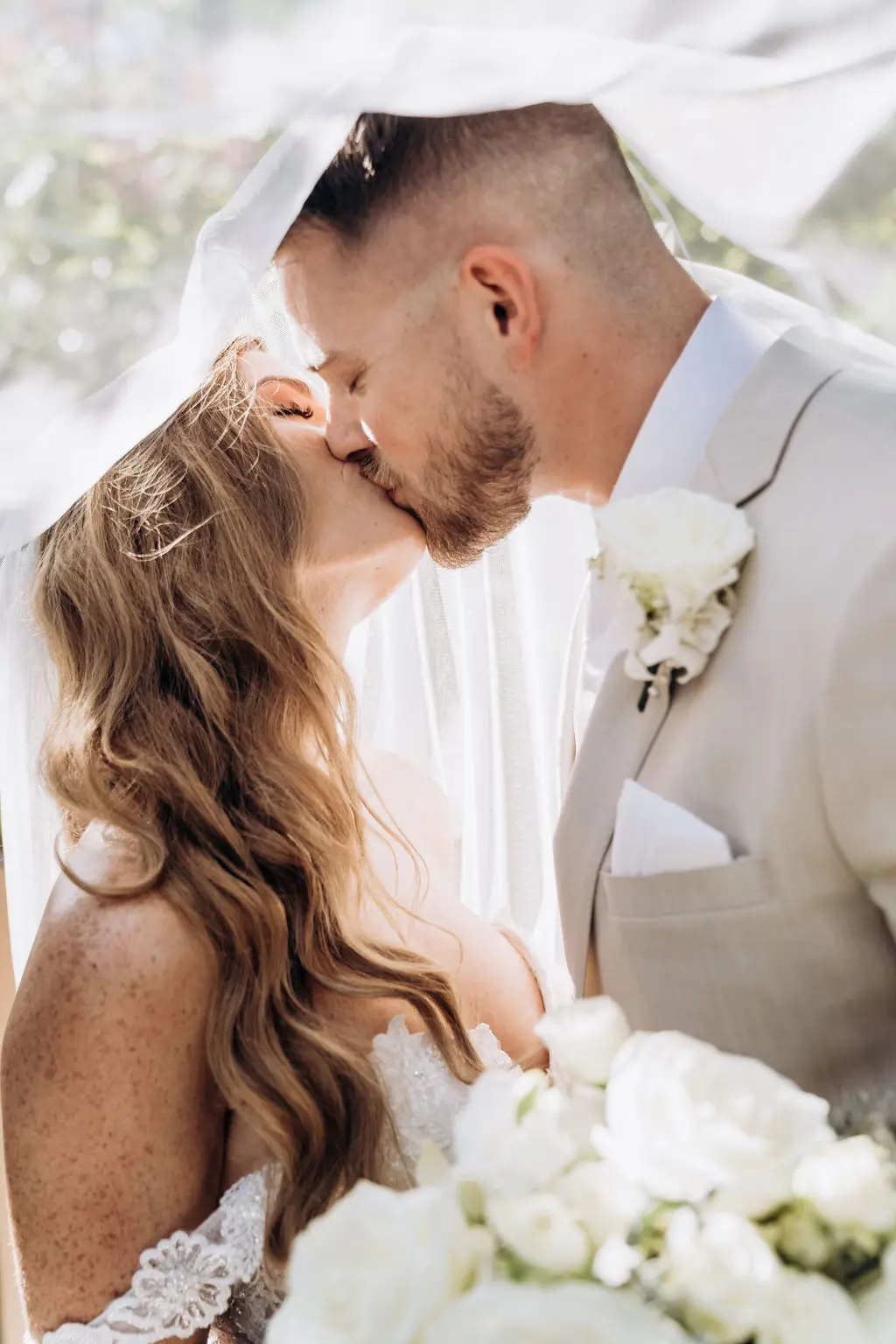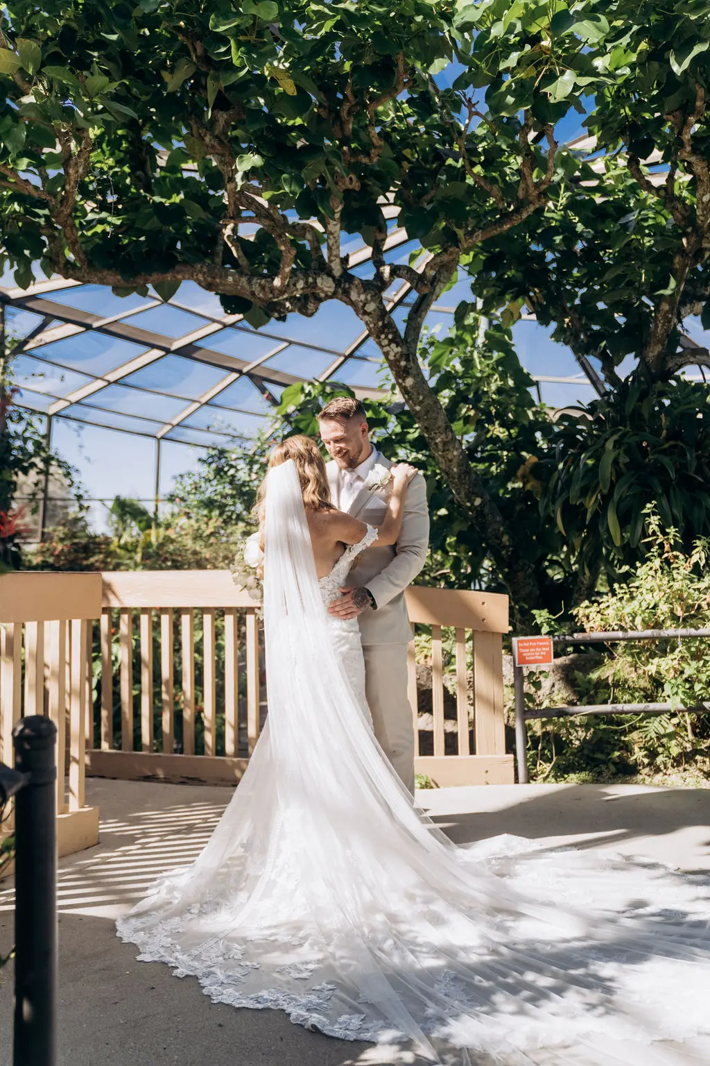 Shannon & Quinlan's wedding photography at B Ocean Resort Fort Lauderdale is intimate, romantic, and completely stunning. The bride arrived in an intricate lace mermaid gown with a cathedral train and a dramatic floating veil — and the dip kiss portrait inside the resort's lush garden conservatory, veil billowing ethereally to the side, is one of those images you simply cannot look away from. The groom stood perfectly complemented in a warm sand-toned suit, and together they radiated the kind of effortless chemistry that makes every frame feel alive. From the flower-adorned beachfront ceremony with the gentle sound of Fort Lauderdale's ocean in the background, to the elegant indoor reception with a stunning tiered cake and a dance floor full of joy — every moment was captured with care. Captured by Palms Isles Fort Lauderdale wedding photography, this B Ocean Resort gallery is warm, beautiful, and deeply personal.