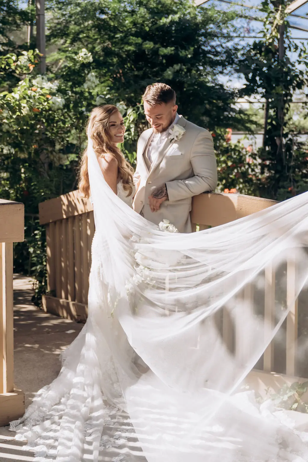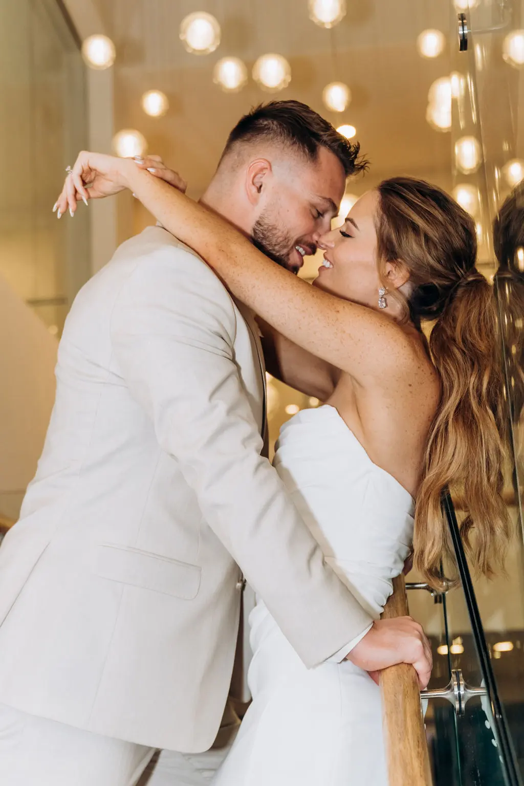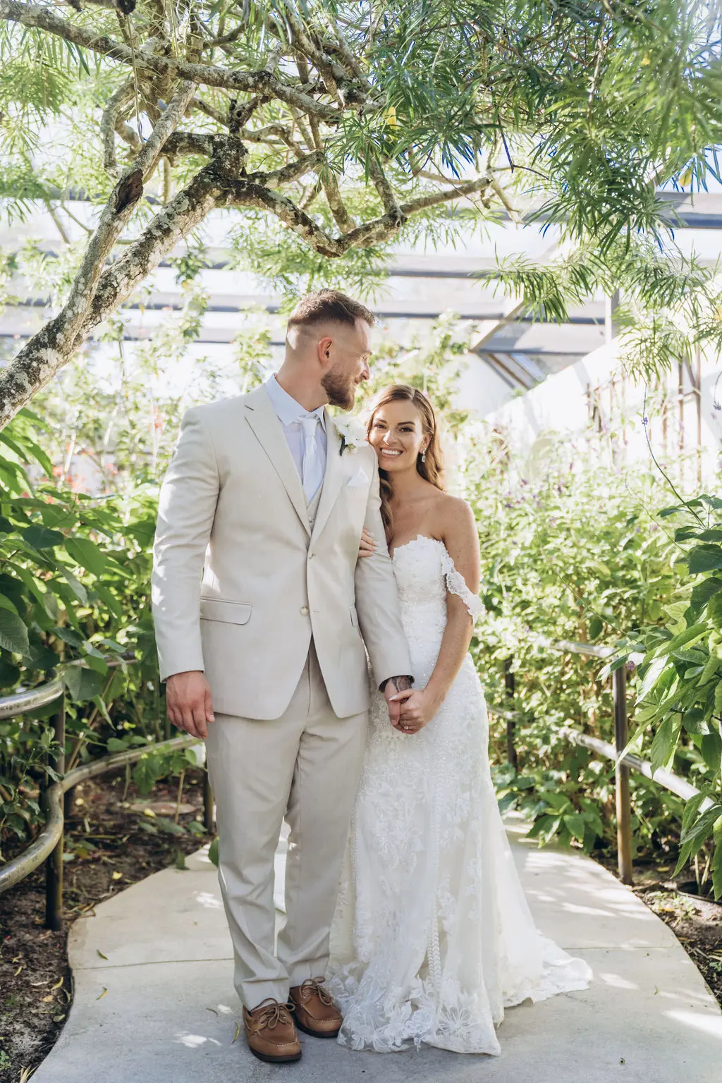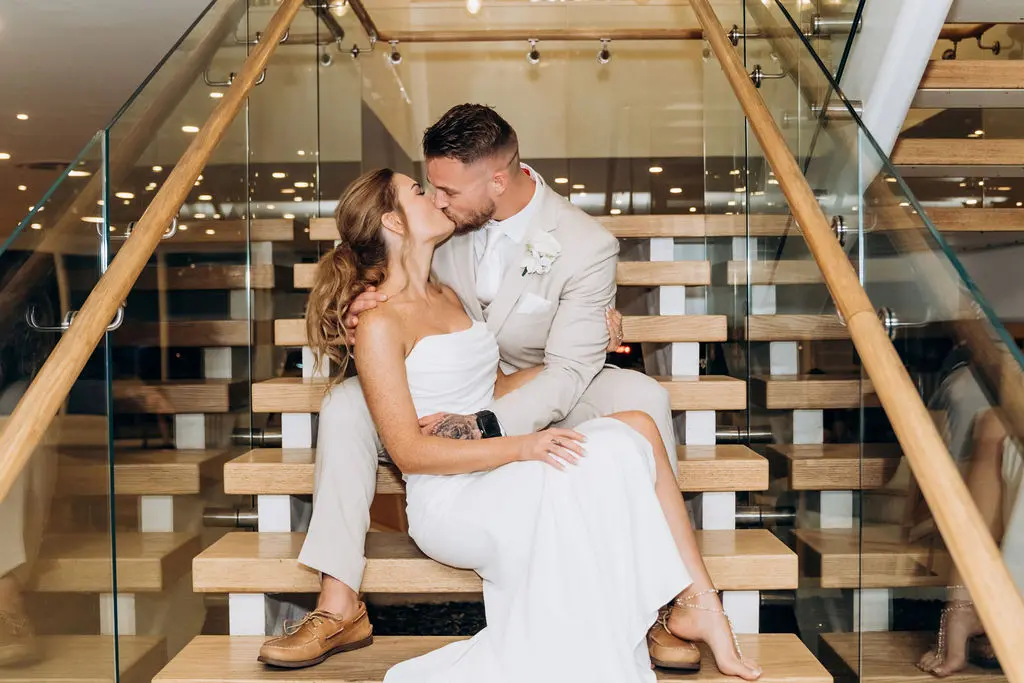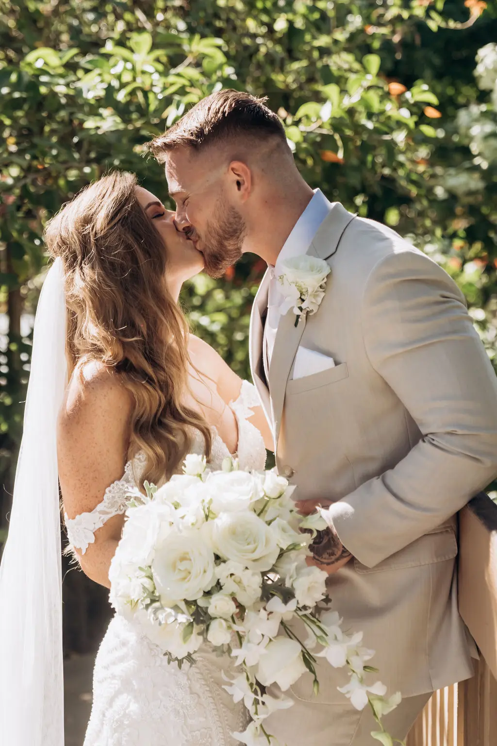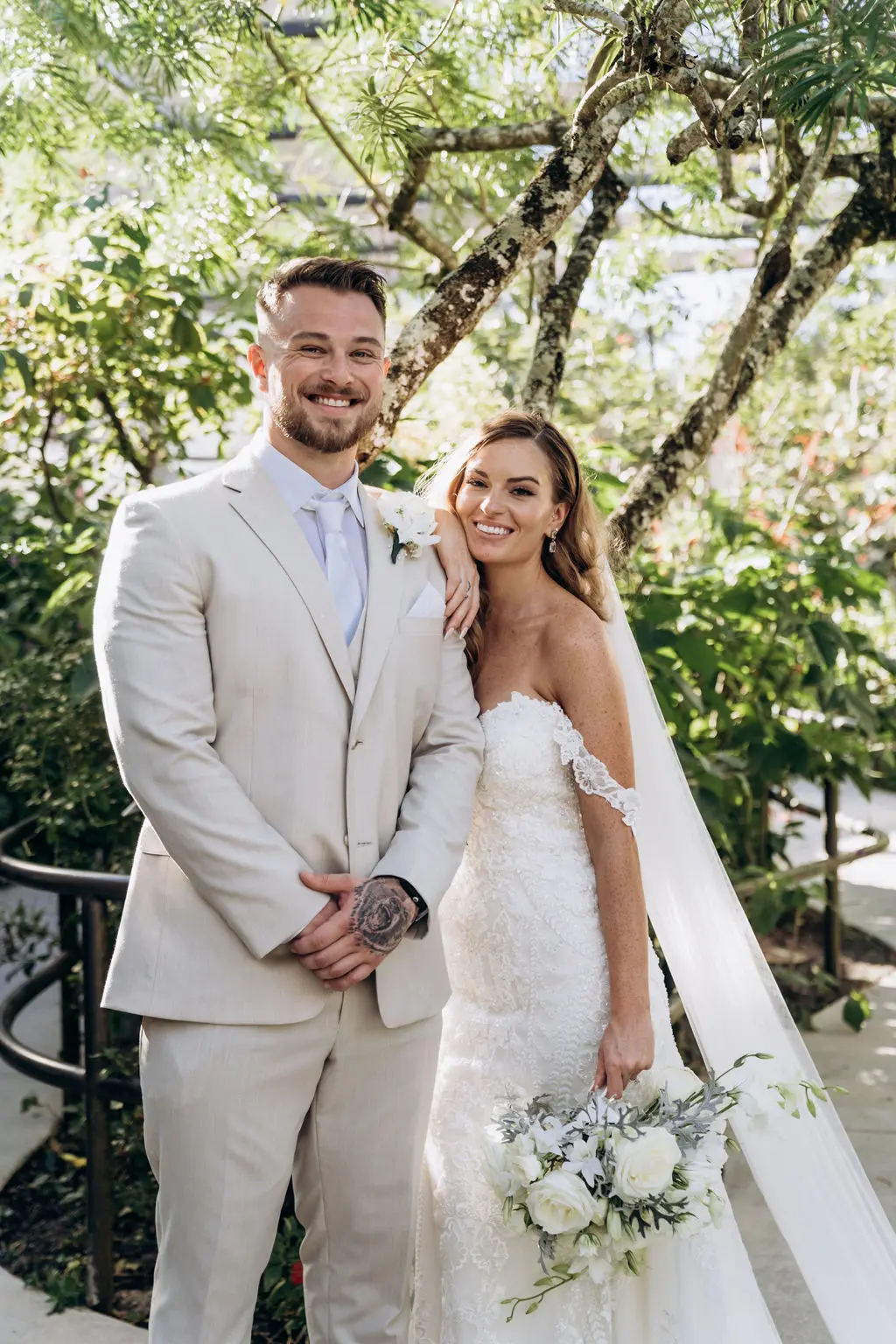 Shannon & Quinlan's wedding photography at B Ocean Resort Fort Lauderdale is intimate, romantic, and completely stunning. The bride arrived in an intricate lace mermaid gown with a cathedral train and a dramatic floating veil — and the dip kiss portrait inside the resort's lush garden conservatory, veil billowing ethereally to the side, is one of those images you simply cannot look away from. The groom stood perfectly complemented in a warm sand-toned suit, and together they radiated the kind of effortless chemistry that makes every frame feel alive. From the flower-adorned beachfront ceremony with the gentle sound of Fort Lauderdale's ocean in the background, to the elegant indoor reception with a stunning tiered cake and a dance floor full of joy — every moment was captured with care. Captured by Palms Isles Fort Lauderdale wedding photography, this B Ocean Resort gallery is warm, beautiful, and deeply personal.
