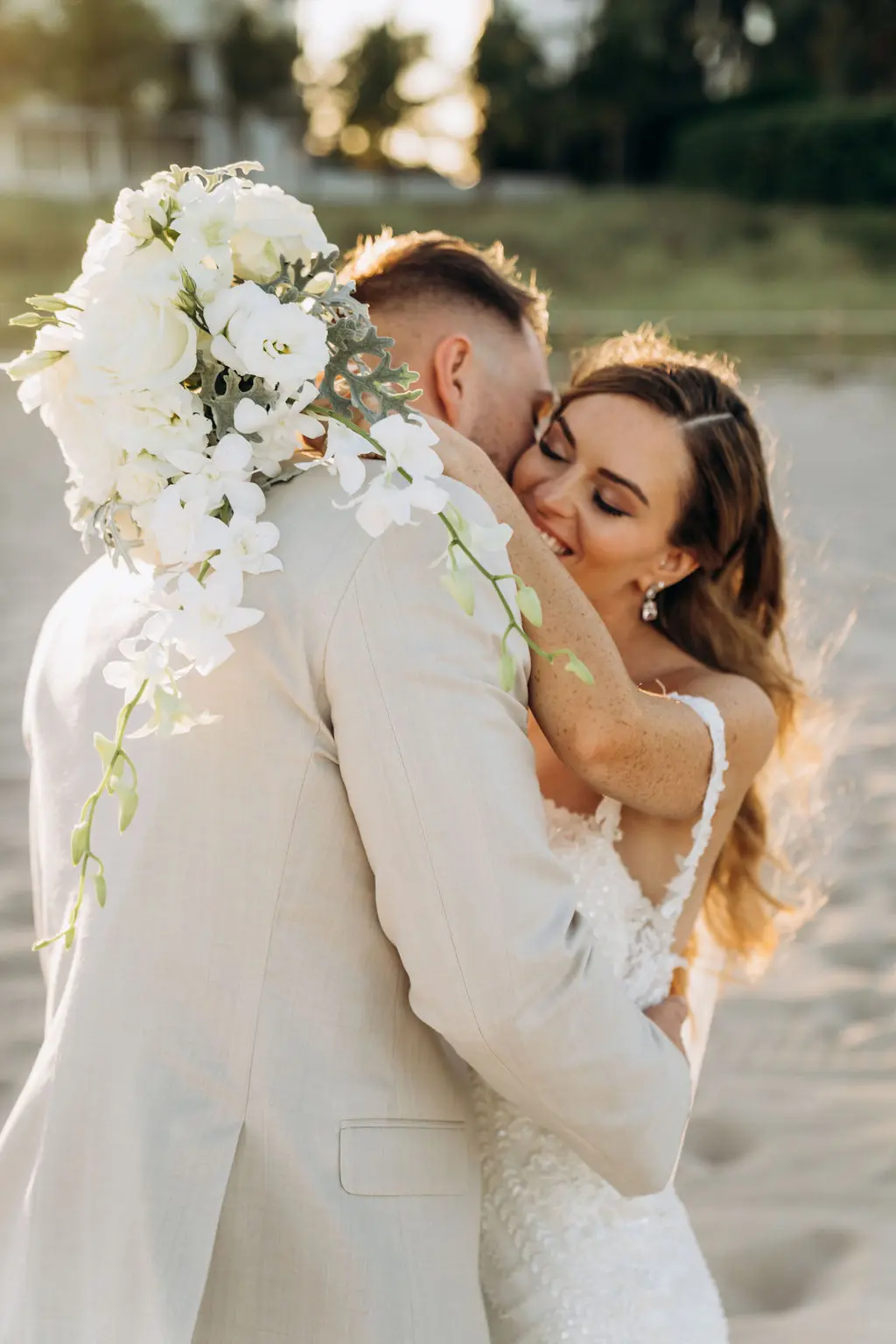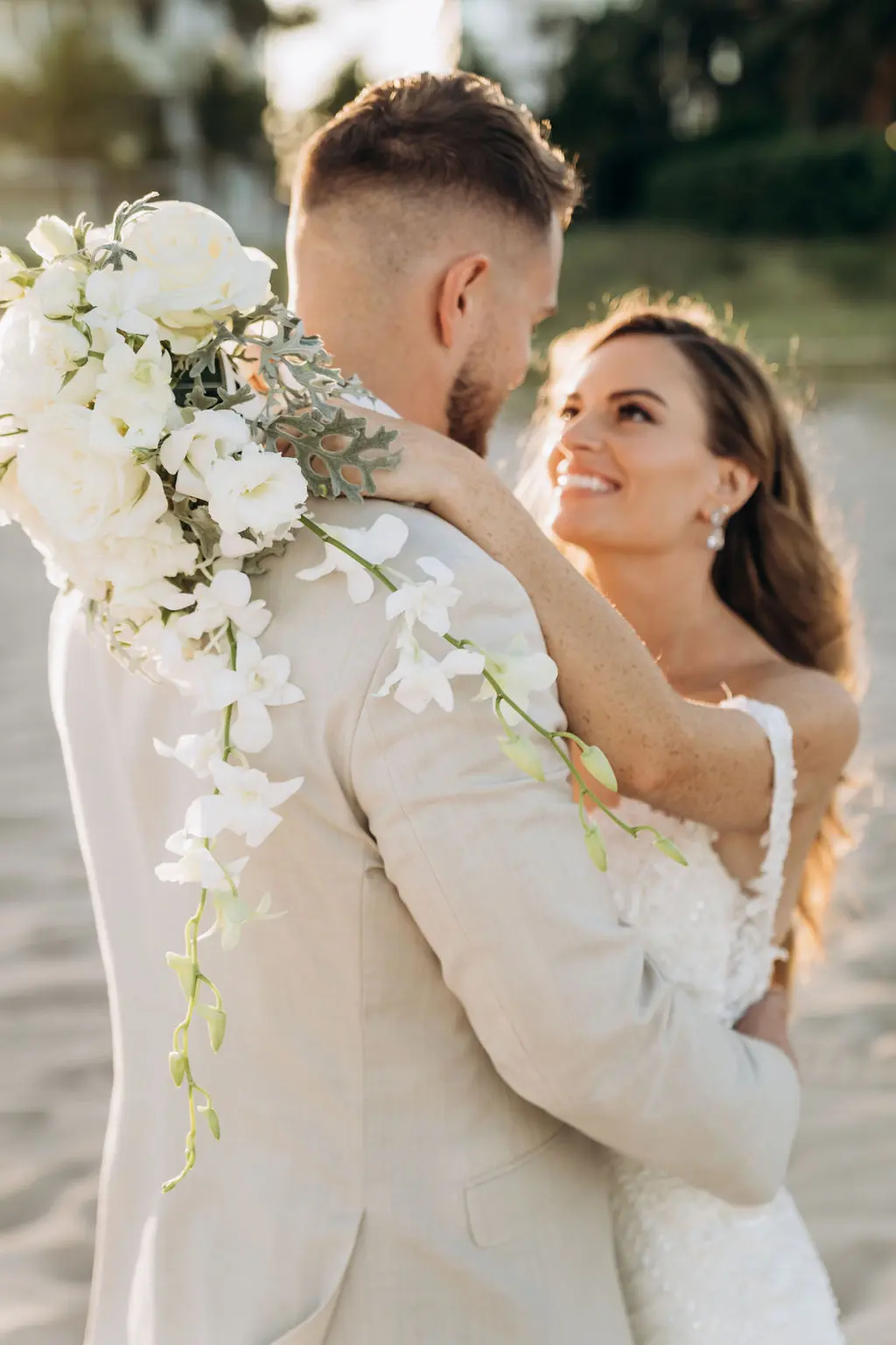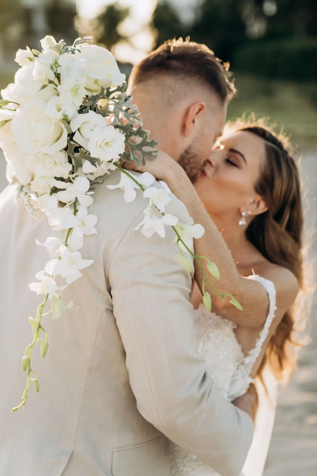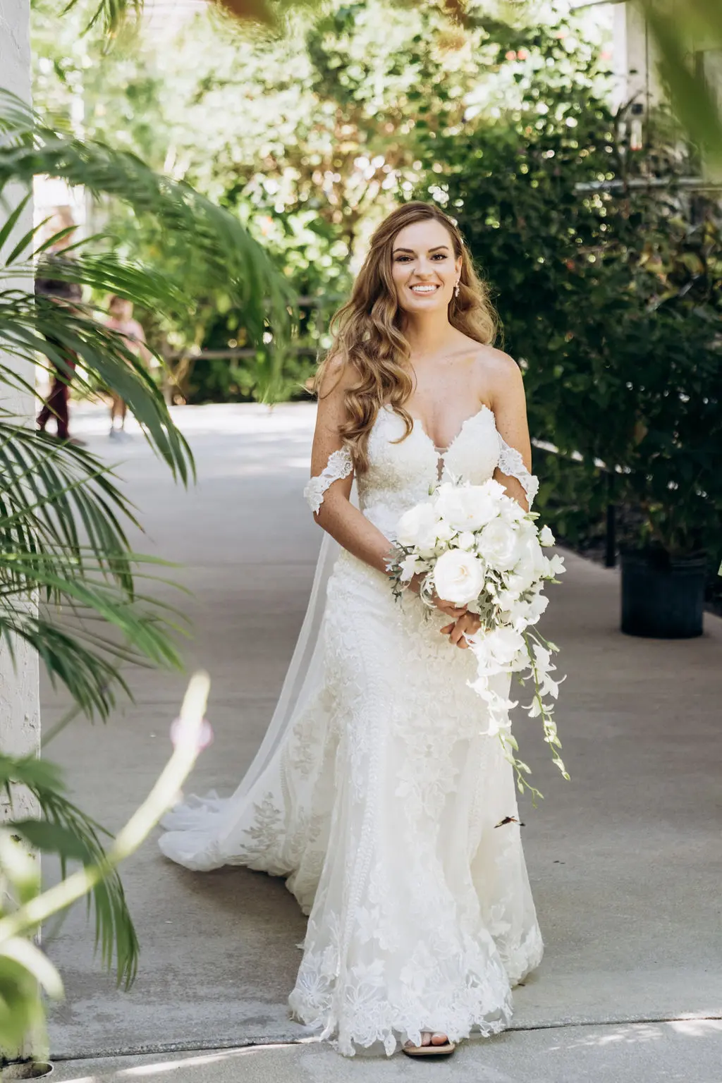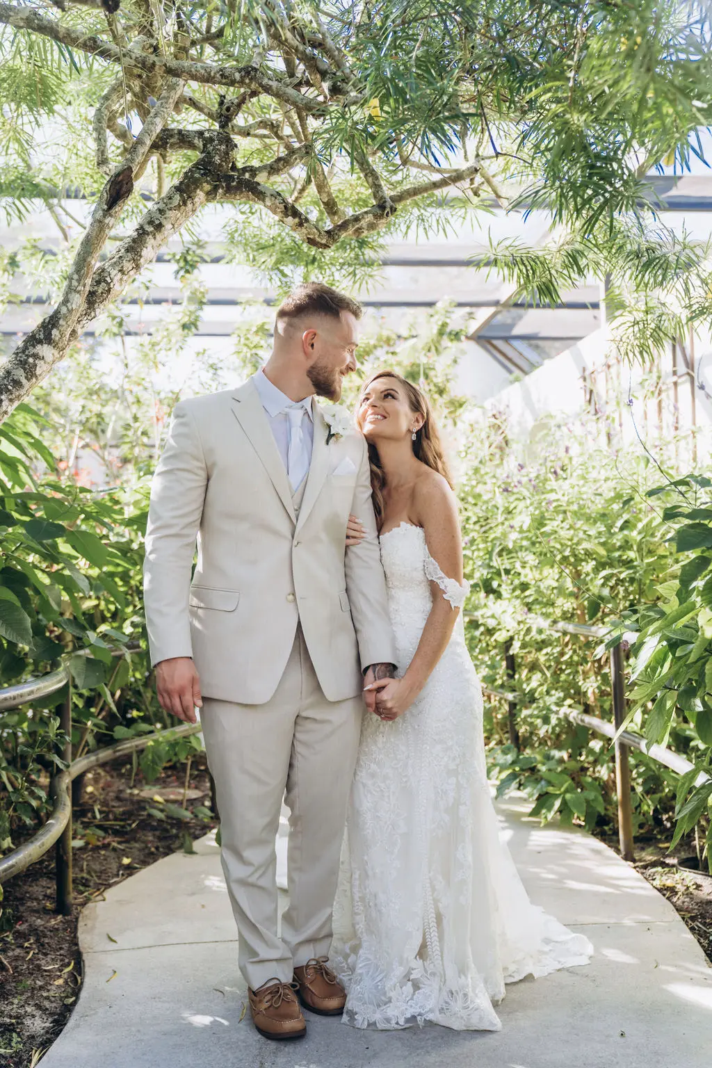 Shannon & Quinlan's wedding photography at B Ocean Resort Fort Lauderdale is intimate, romantic, and completely stunning. The bride arrived in an intricate lace mermaid gown with a cathedral train and a dramatic floating veil — and the dip kiss portrait inside the resort's lush garden conservatory, veil billowing ethereally to the side, is one of those images you simply cannot look away from. The groom stood perfectly complemented in a warm sand-toned suit, and together they radiated the kind of effortless chemistry that makes every frame feel alive. From the flower-adorned beachfront ceremony with the gentle sound of Fort Lauderdale's ocean in the background, to the elegant indoor reception with a stunning tiered cake and a dance floor full of joy — every moment was captured with care. Captured by Palms Isles Fort Lauderdale wedding photography, this B Ocean Resort gallery is warm, beautiful, and deeply personal.
