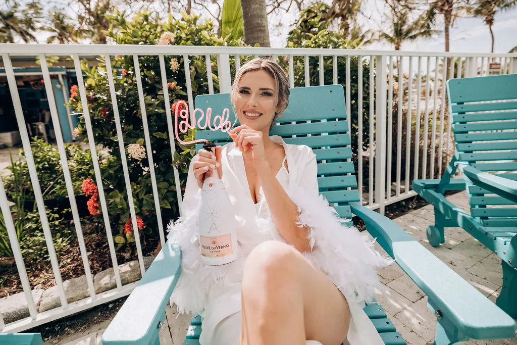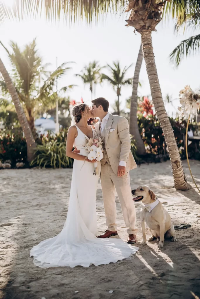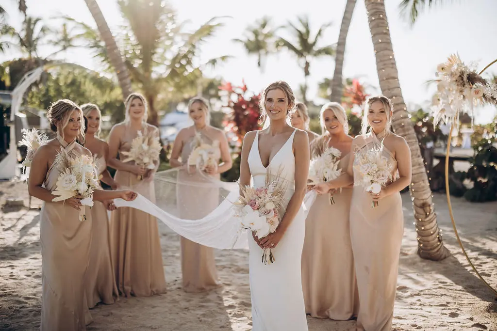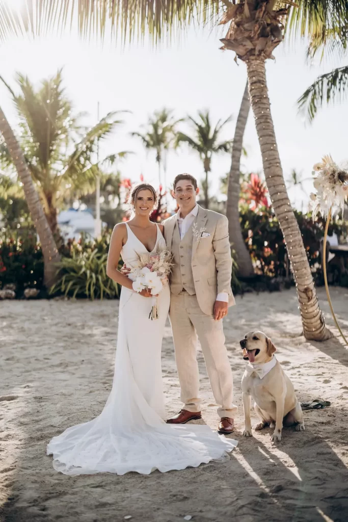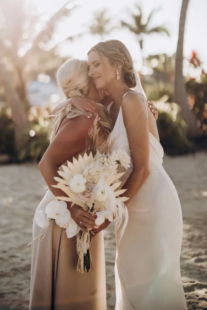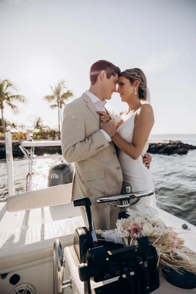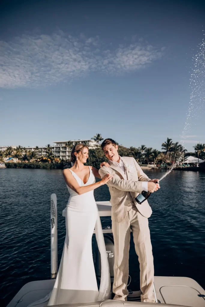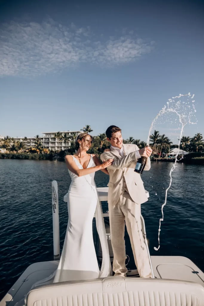 Sophia & Jackson's wedding photography in Key Largo is pure Florida Keys magic — and this image says everything. Bouquet raised triumphantly in the air, champagne bottle lifted in celebration, both of them laughing on the bow of a white speedboat as the turquoise water stretches endlessly behind them and the Key Largo shoreline glows in the afternoon sun. A sleek white gown, a linen sand-colored suit, a boho bouquet of orchids and pampas grass — the aesthetic is effortless, coastal, and completely alive. Their beach ceremony unfolded against a backdrop of pristine sandy shores, ocean breezes, and the kind of Florida Keys sunset that makes every guest stop and stare. Dolphins, manatees, and the most beautiful water in the state as witnesses — this is what a Key Largo wedding looks like. Captured by Palms Isles Key Largo wedding photography, this gallery is a fairy tale.