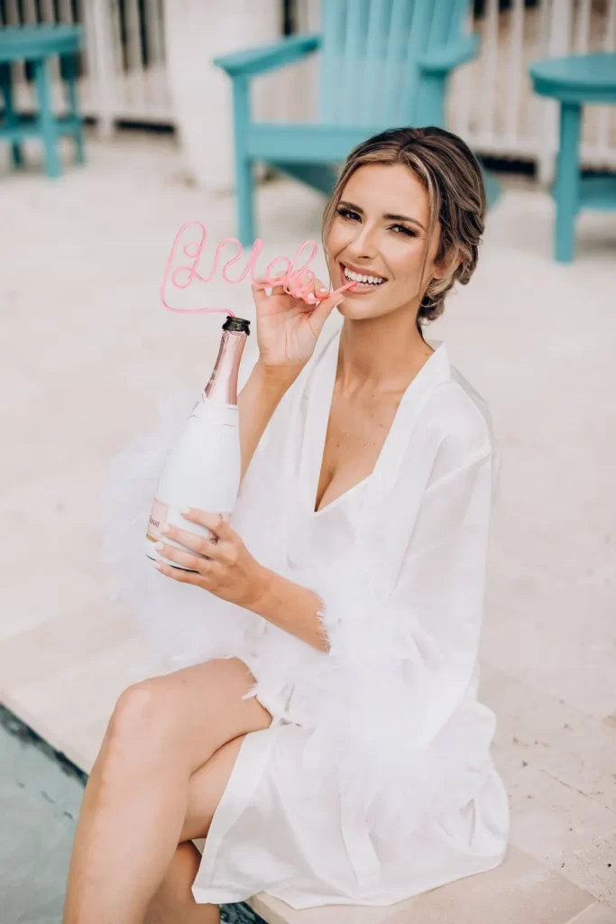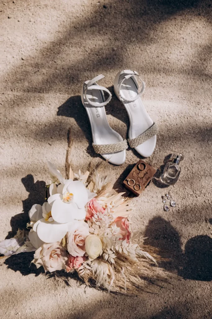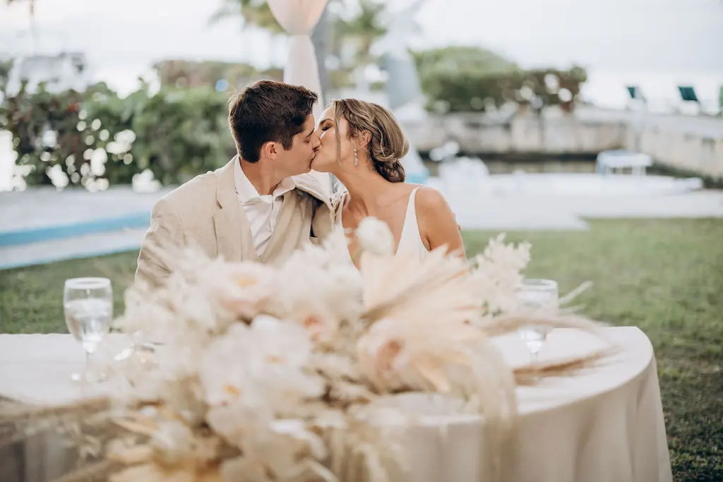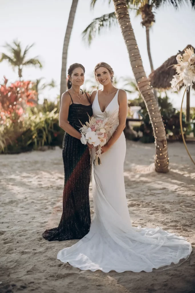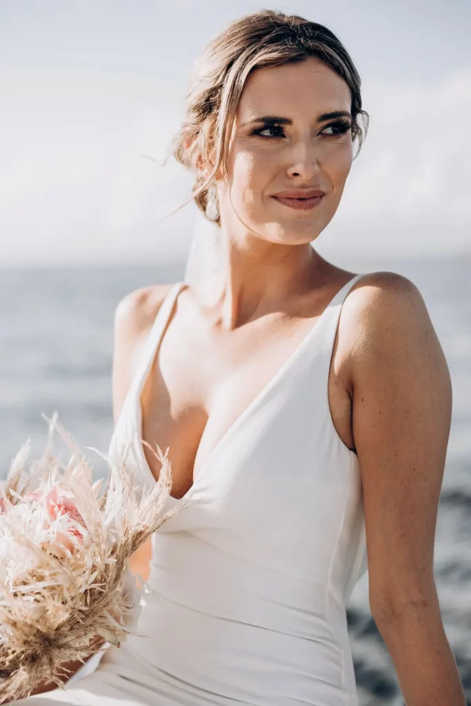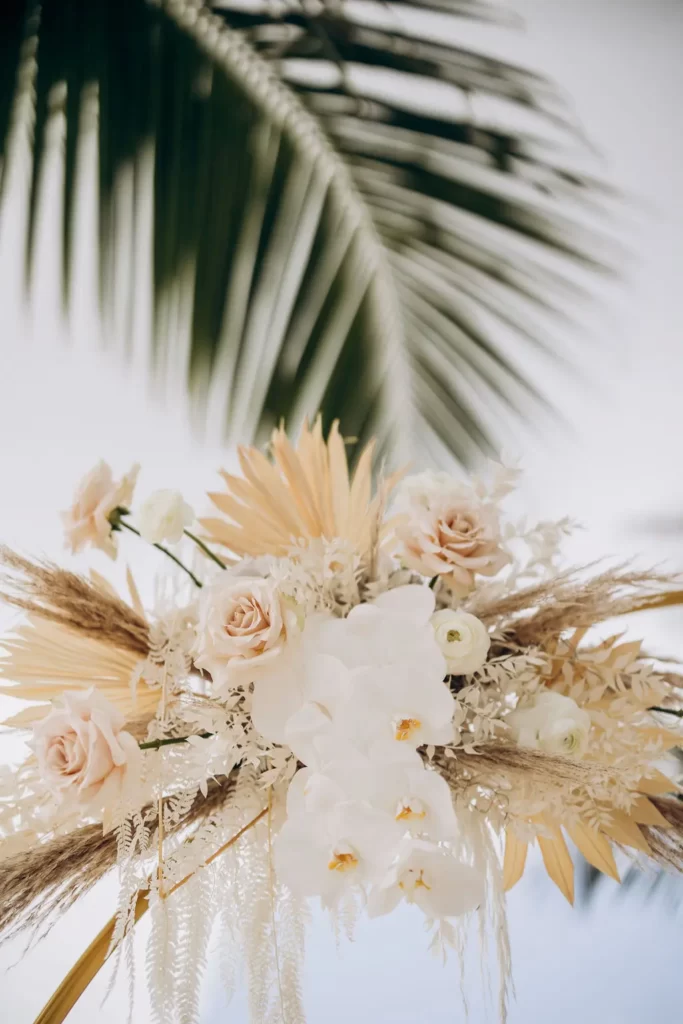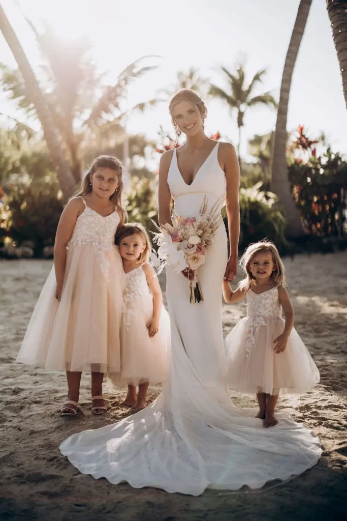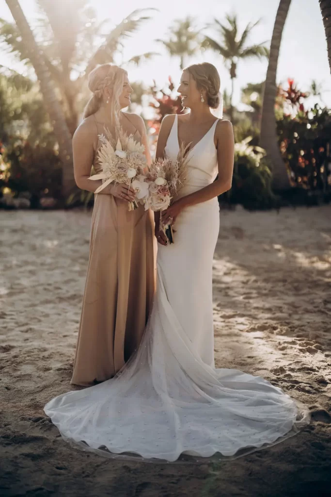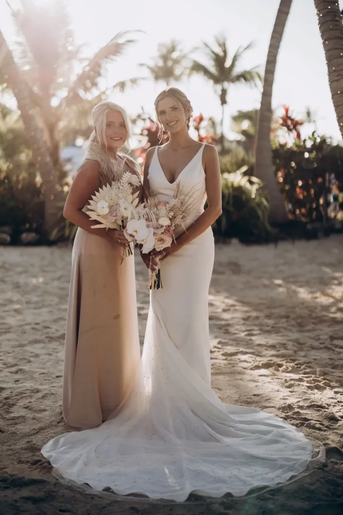 Sophia & Jackson's wedding photography in Key Largo is pure Florida Keys magic — and this image says everything. Bouquet raised triumphantly in the air, champagne bottle lifted in celebration, both of them laughing on the bow of a white speedboat as the turquoise water stretches endlessly behind them and the Key Largo shoreline glows in the afternoon sun. A sleek white gown, a linen sand-colored suit, a boho bouquet of orchids and pampas grass — the aesthetic is effortless, coastal, and completely alive. Their beach ceremony unfolded against a backdrop of pristine sandy shores, ocean breezes, and the kind of Florida Keys sunset that makes every guest stop and stare. Dolphins, manatees, and the most beautiful water in the state as witnesses — this is what a Key Largo wedding looks like. Captured by Palms Isles Key Largo wedding photography, this gallery is a fairy tale.